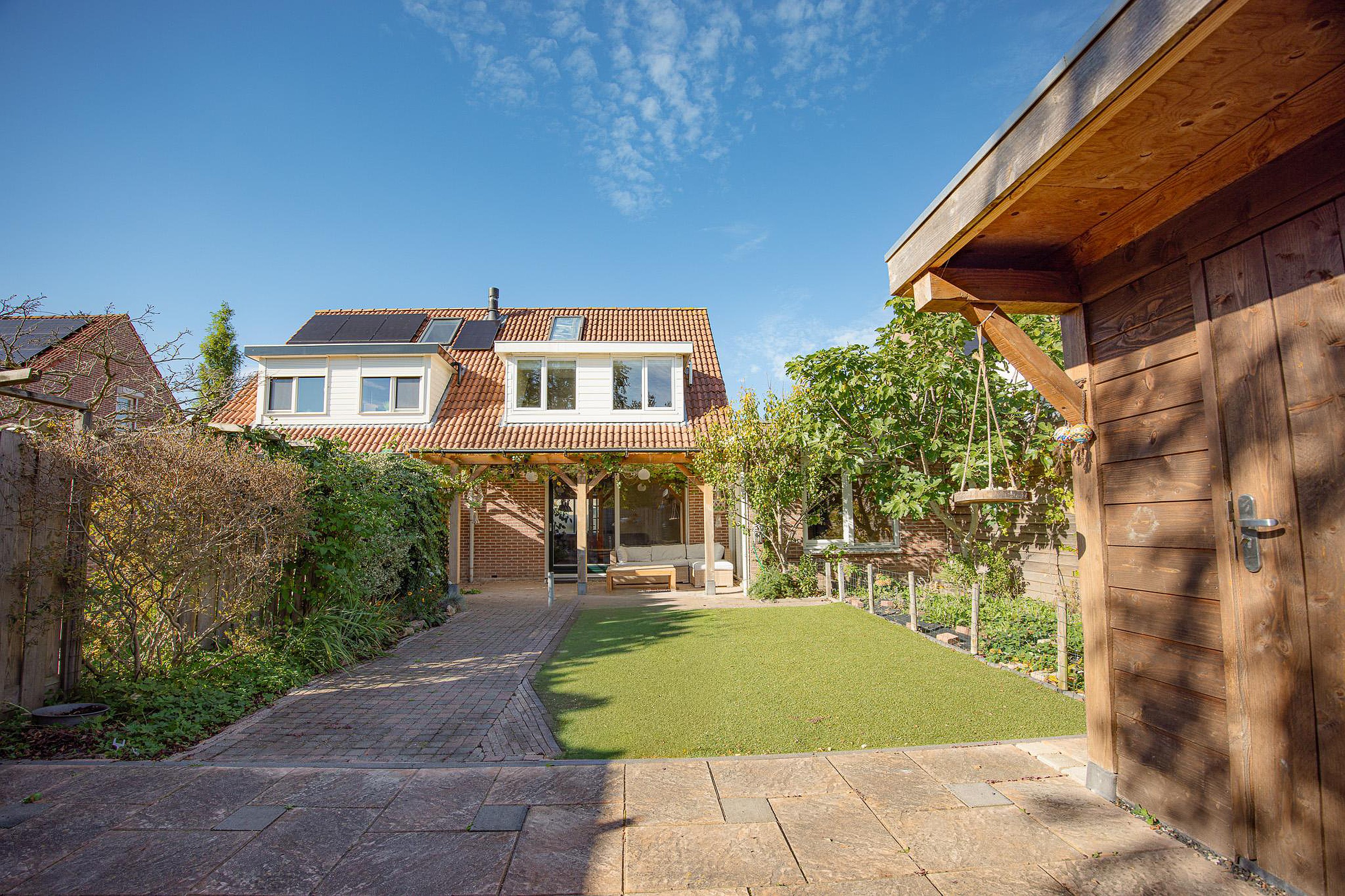 De zonnige achtertuin ligt op het zuidoosten en is bereikbaar via de schuifpui in de woonkamer. De overkapping zorgt ervoor dat je hier van vroeg in het voorjaar tot laat in het najaar comfortabel buiten kunt zitten. Achter in de tuin staat een vrijstaande houten berging, ideaal voor fietsen en tuingereedschap.