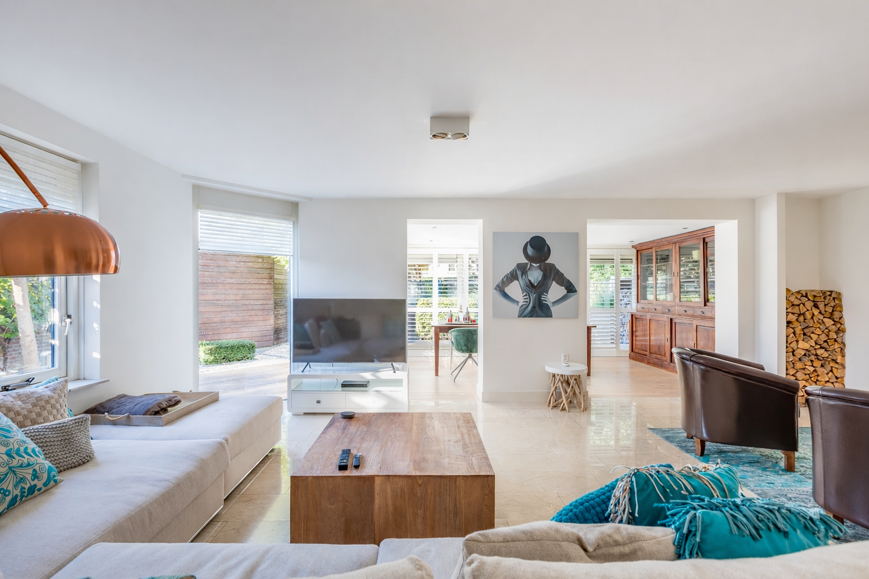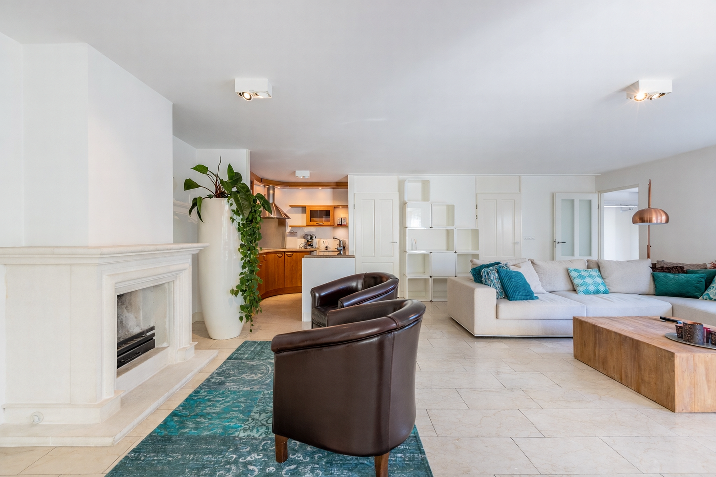 - Royale, lichte woonkamer met speelse indeling en sfeervolle openhaard