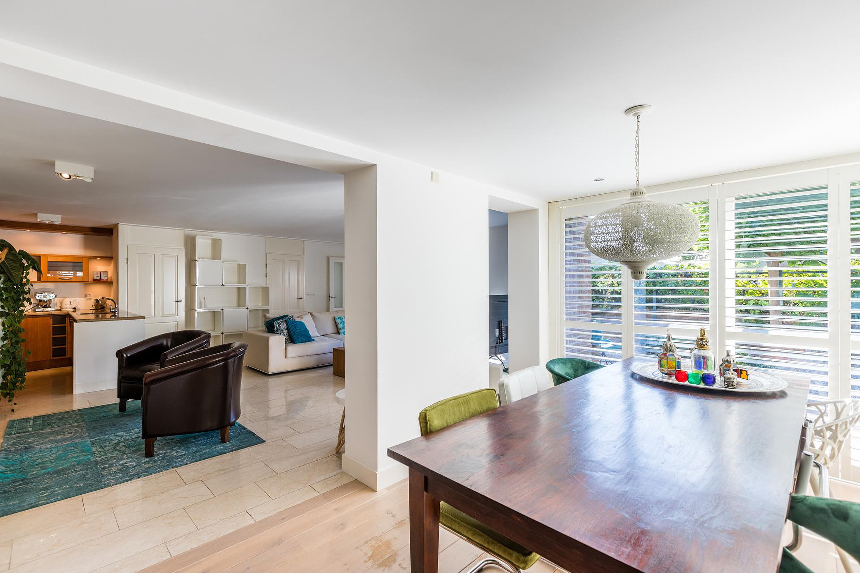 Aan de achterzijde is een kwalitatieve uitbouw, waardoor de woonkamer extra ruim aanvoelt en er een prachtige plek is ontstaan voor de eethoek. De uitbouw beschikt over grote raampartijen tot aan het plafond, voorzien van shutters, en een schuifpui naar de tuin.