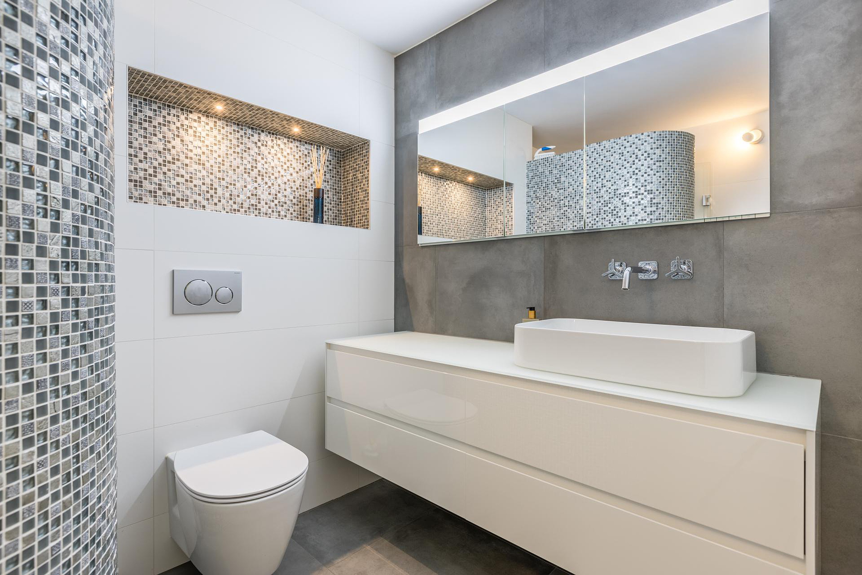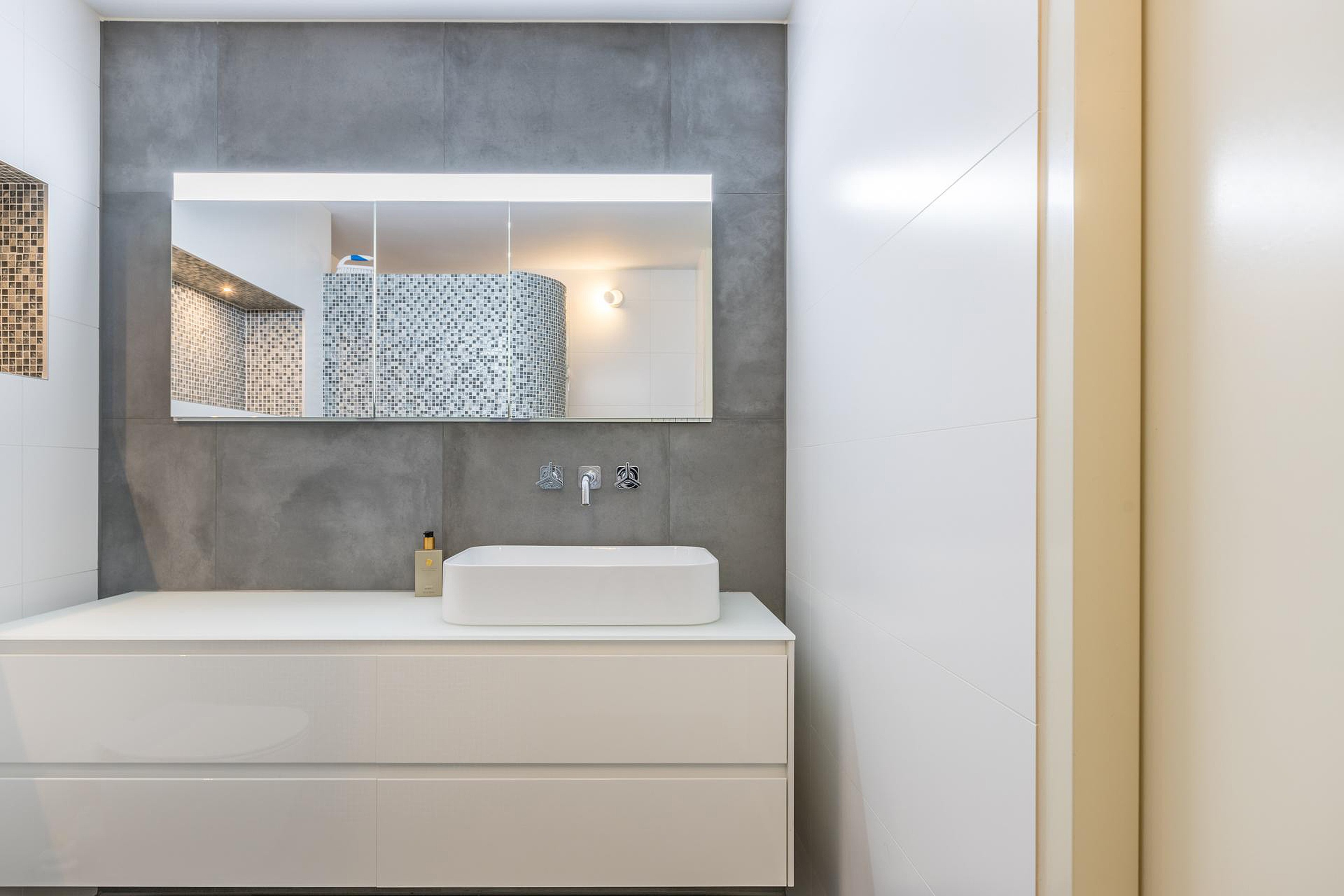 De badkamer is betegeld tot aan het plafond en voorzien van een ruime inloopdouche met HansGrohe Rainshower, een breed luxe wastafelmeubel met HansGrohe inbouwkraan, een brede Keuco inbouw spiegelkast met dimbare verlichting en een tweede zwevend toilet. De vloer is bovendien voorzien van elektrische vloerverwarming.