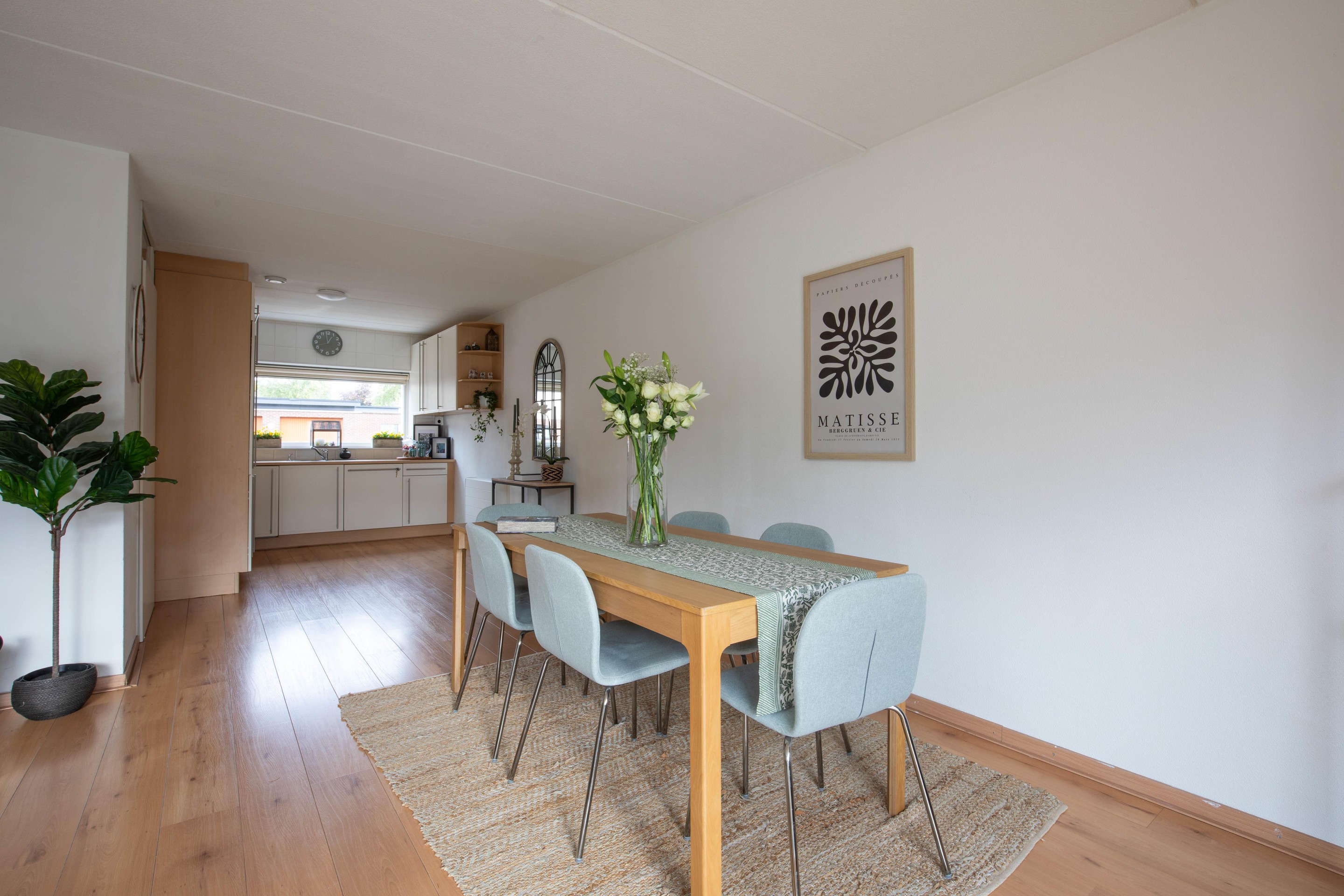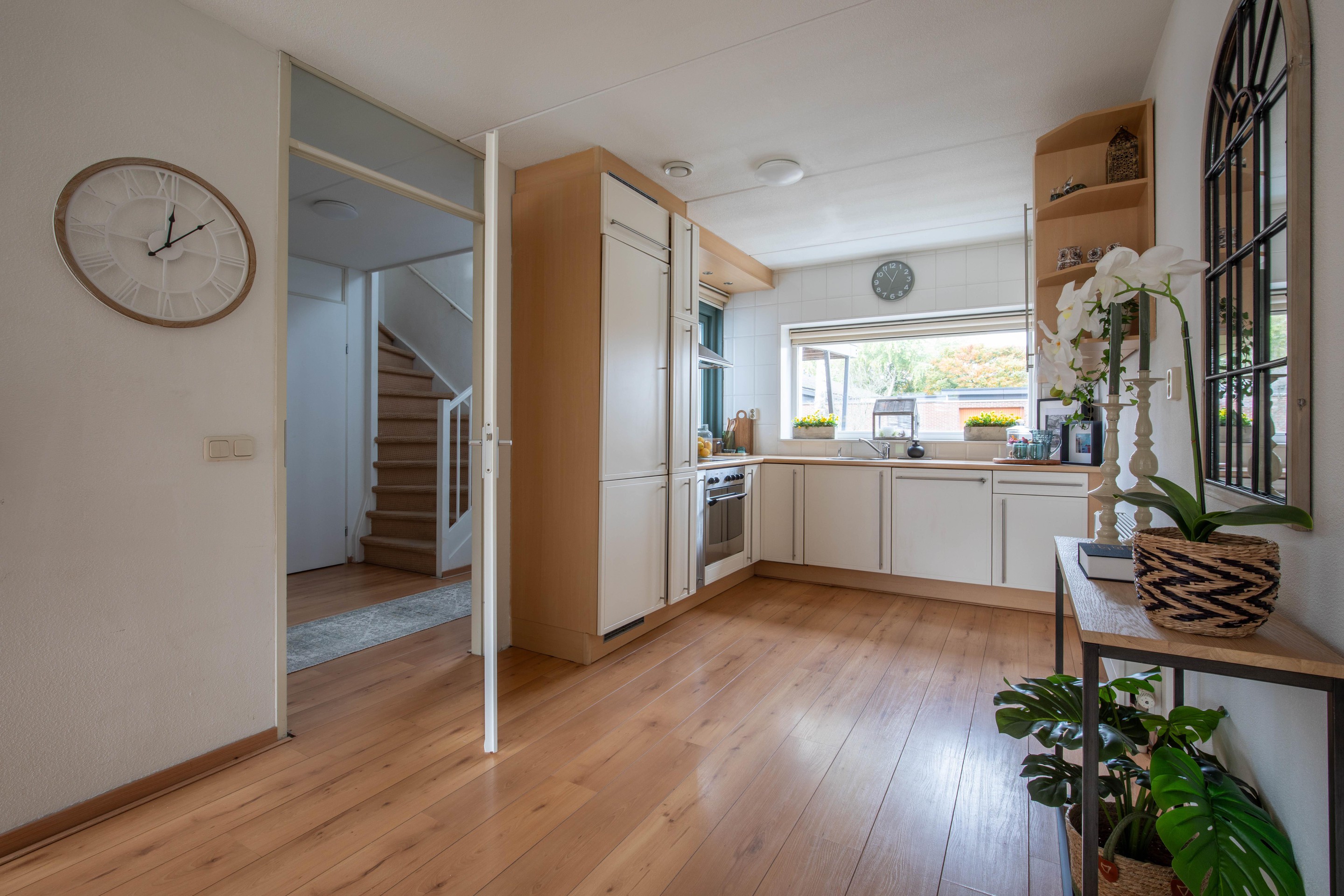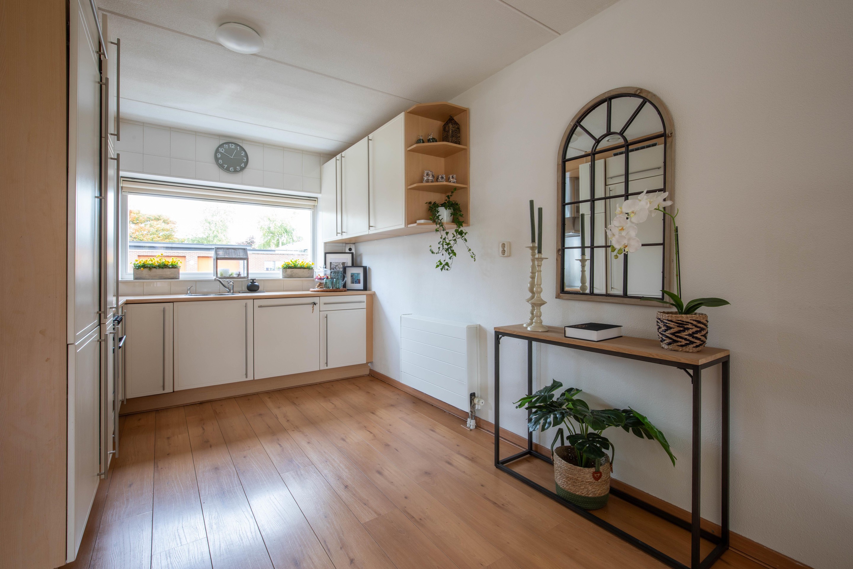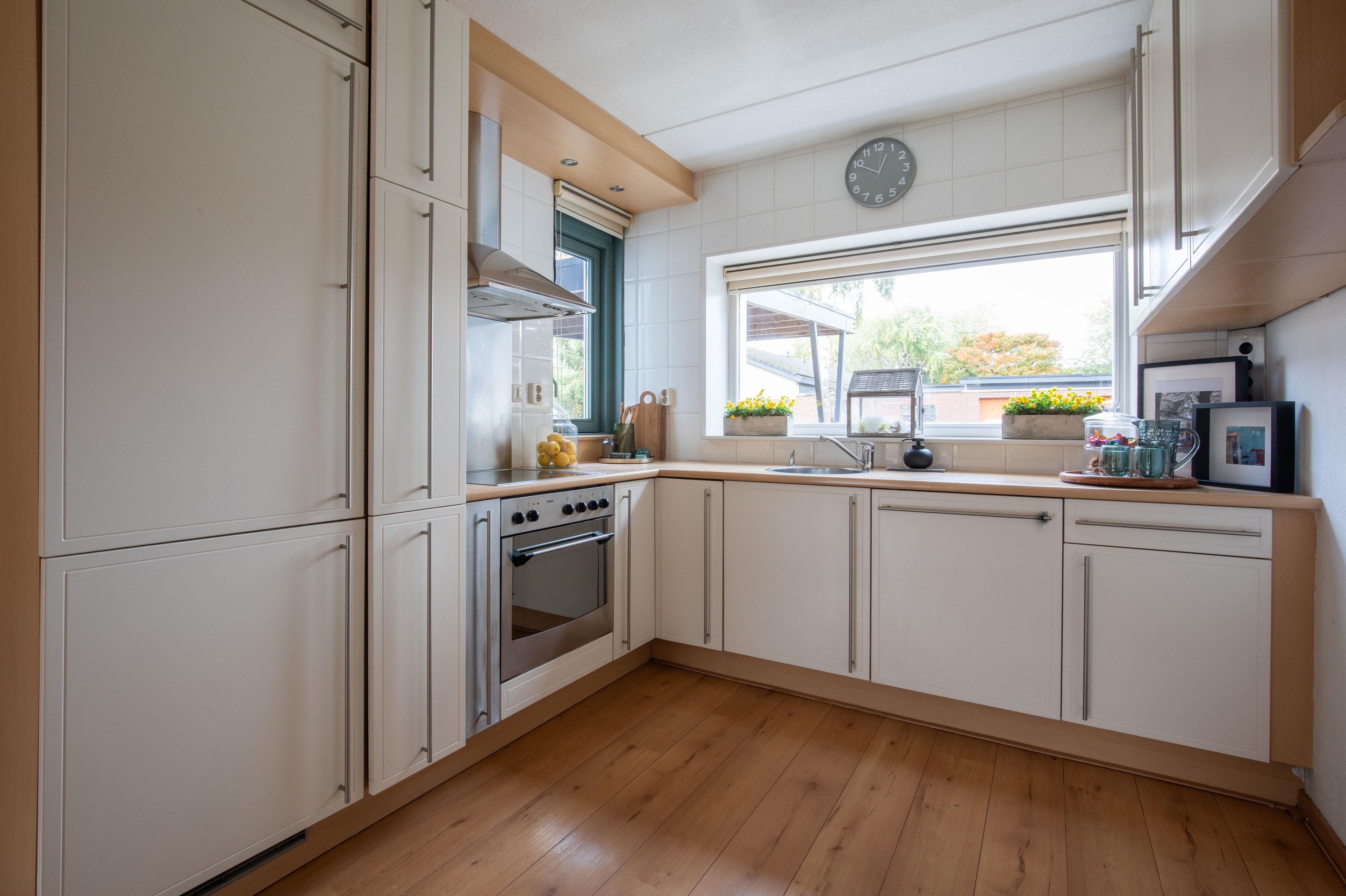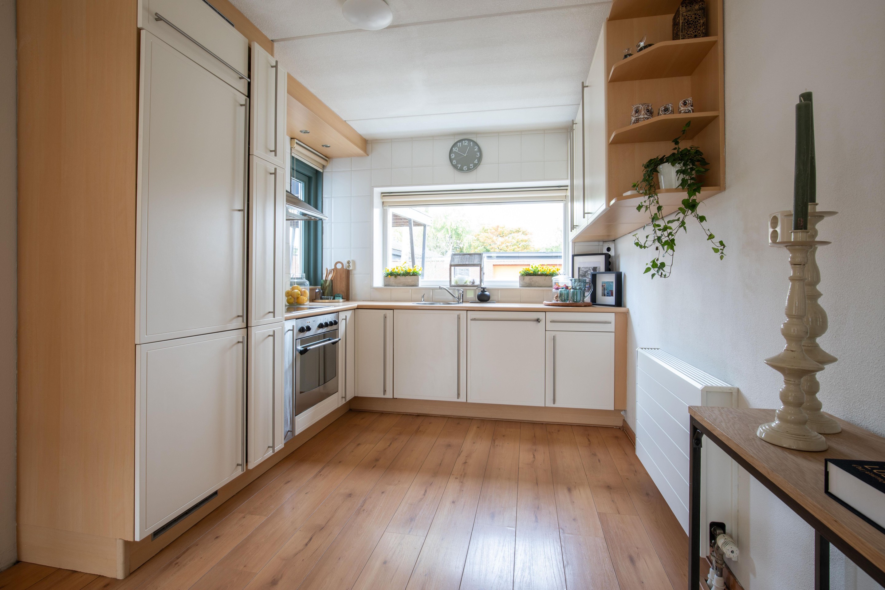 Aan de voorzijde bevindt zich de L-vormige keuken, voorzien van oven, magnetron, kookplaat, afzuigkap en koel-vriescombinatie. De gehele begane grond is afgewerkt met een nette laminaatvloer.