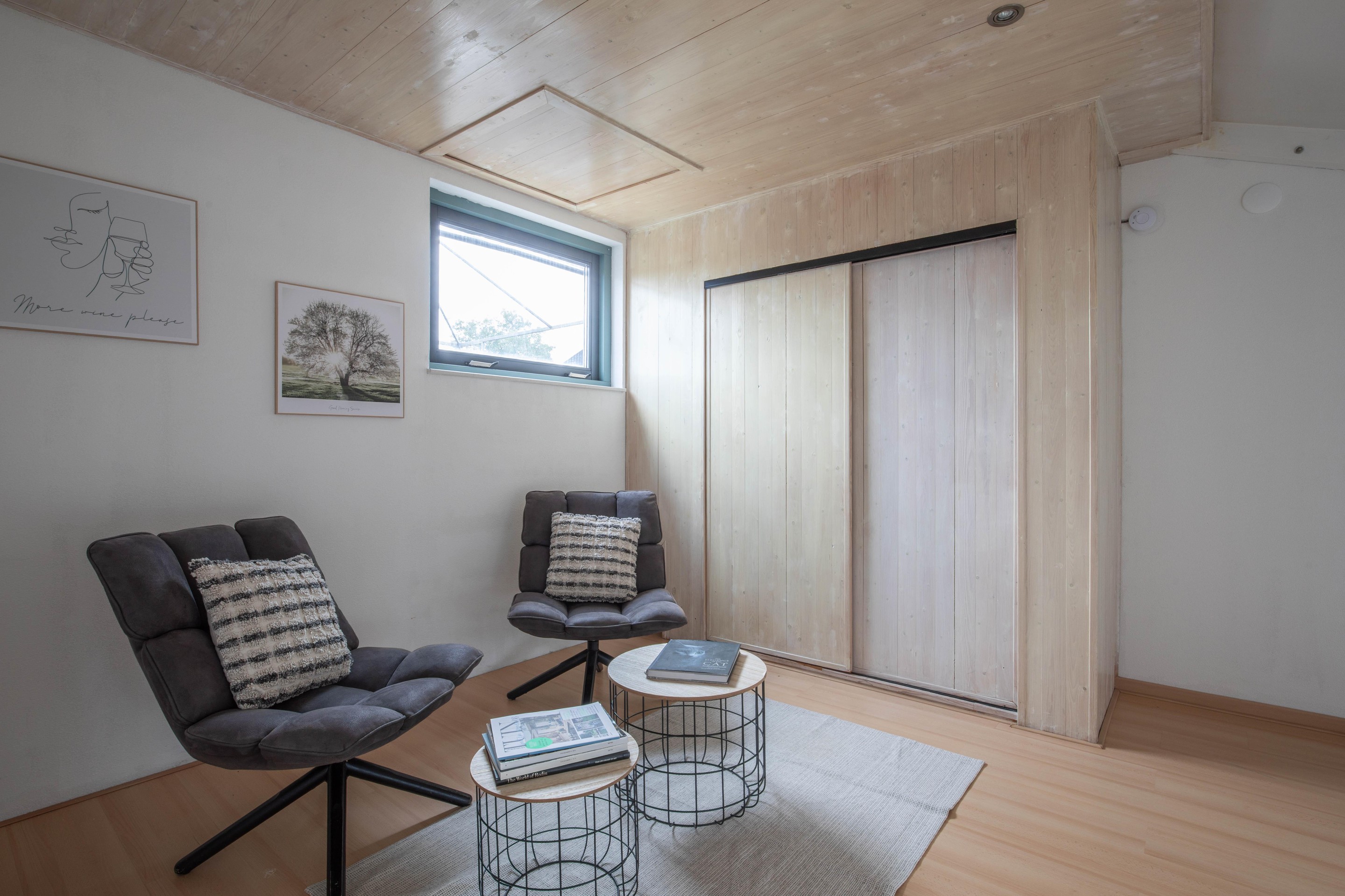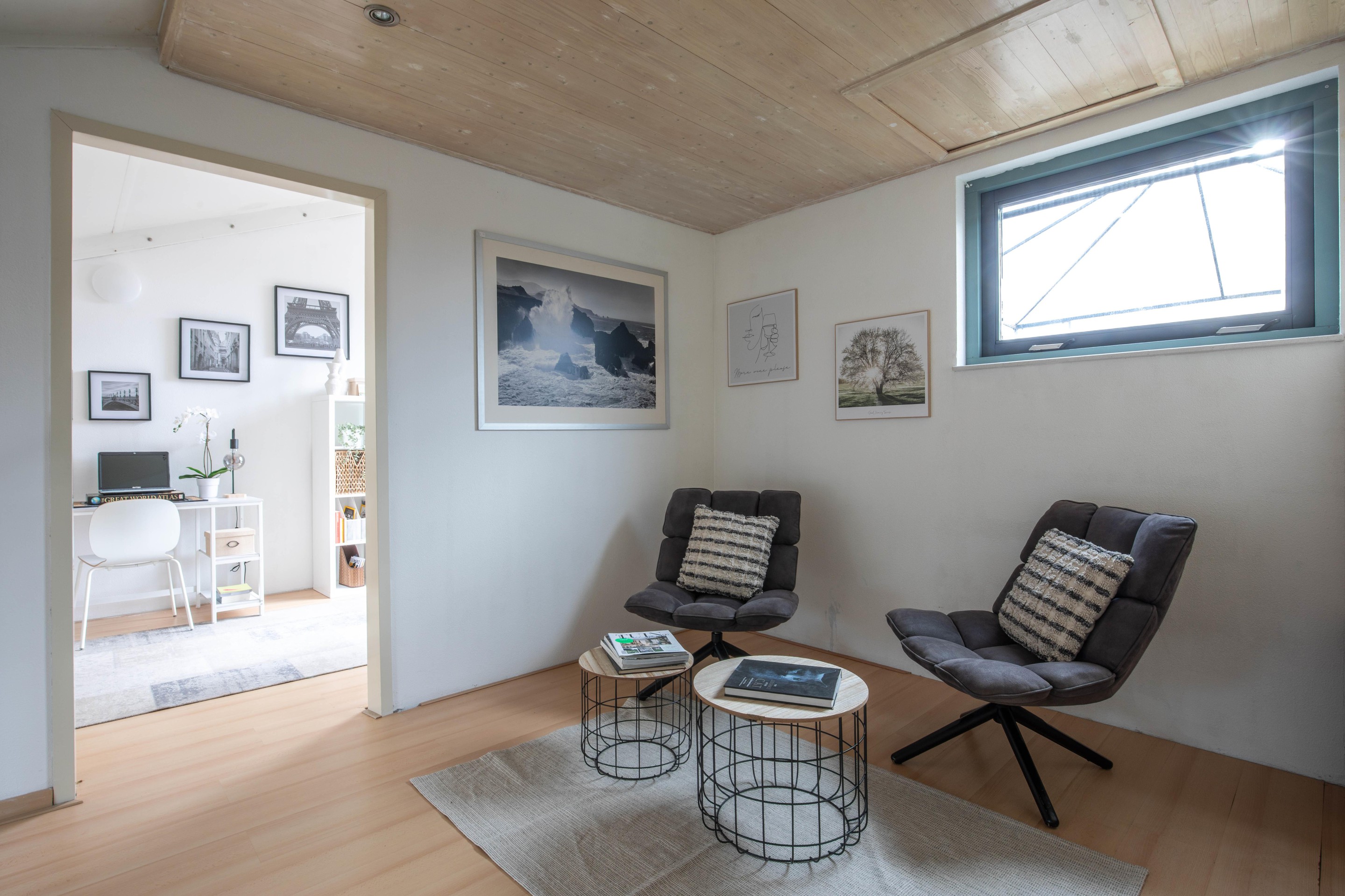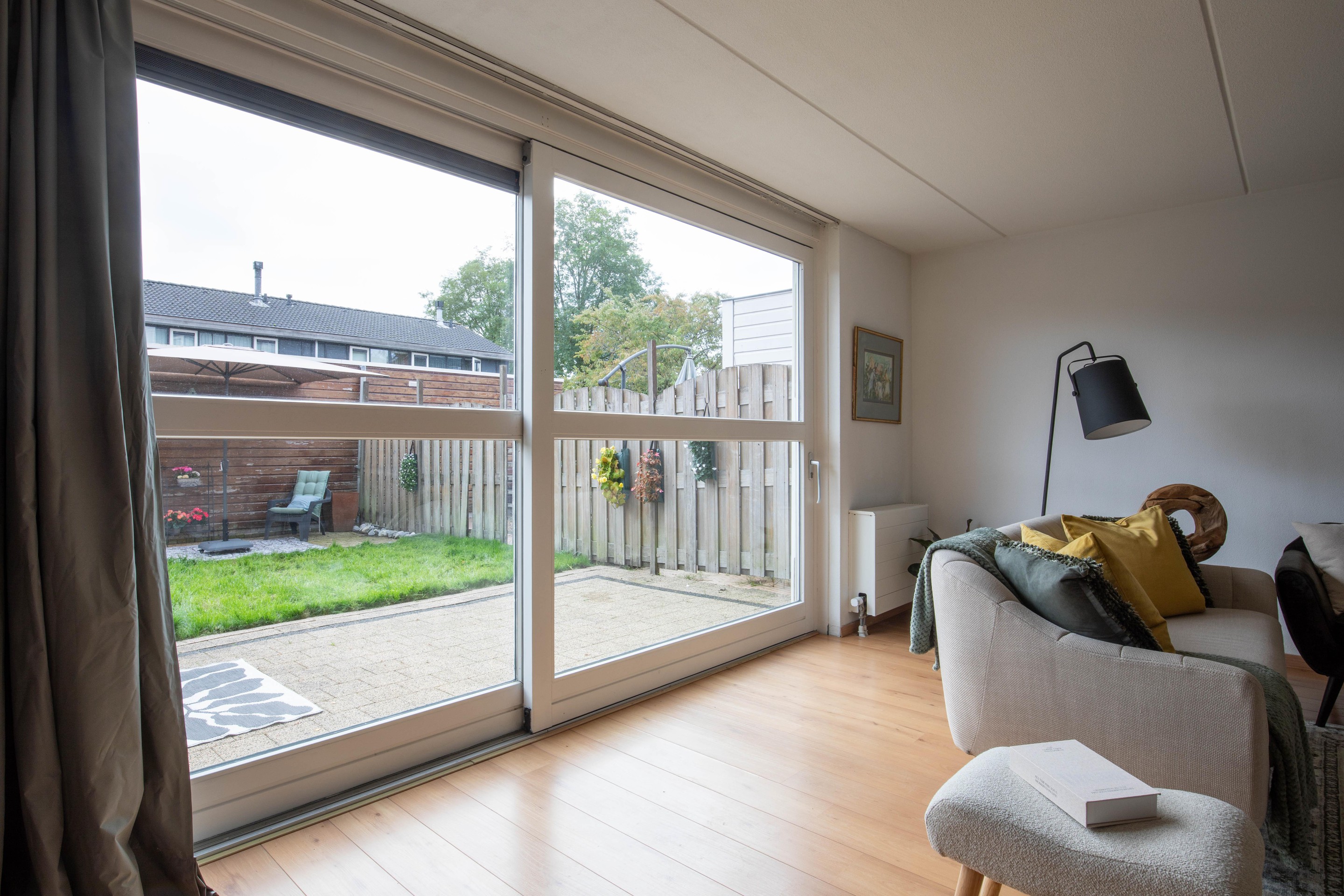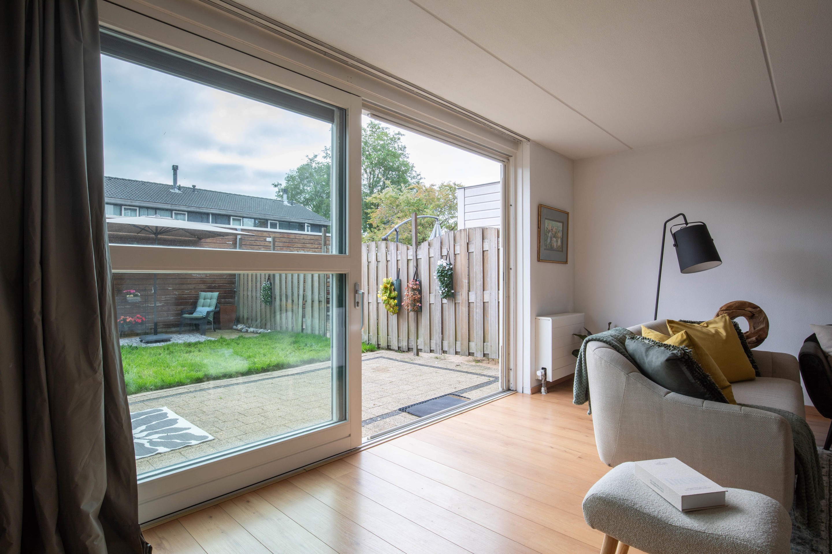 De lichte woonkamer beschikt over een schuifpui naar de zonnige, op het zuidoosten gelegen achtertuin met vrijstaande houten berging.
