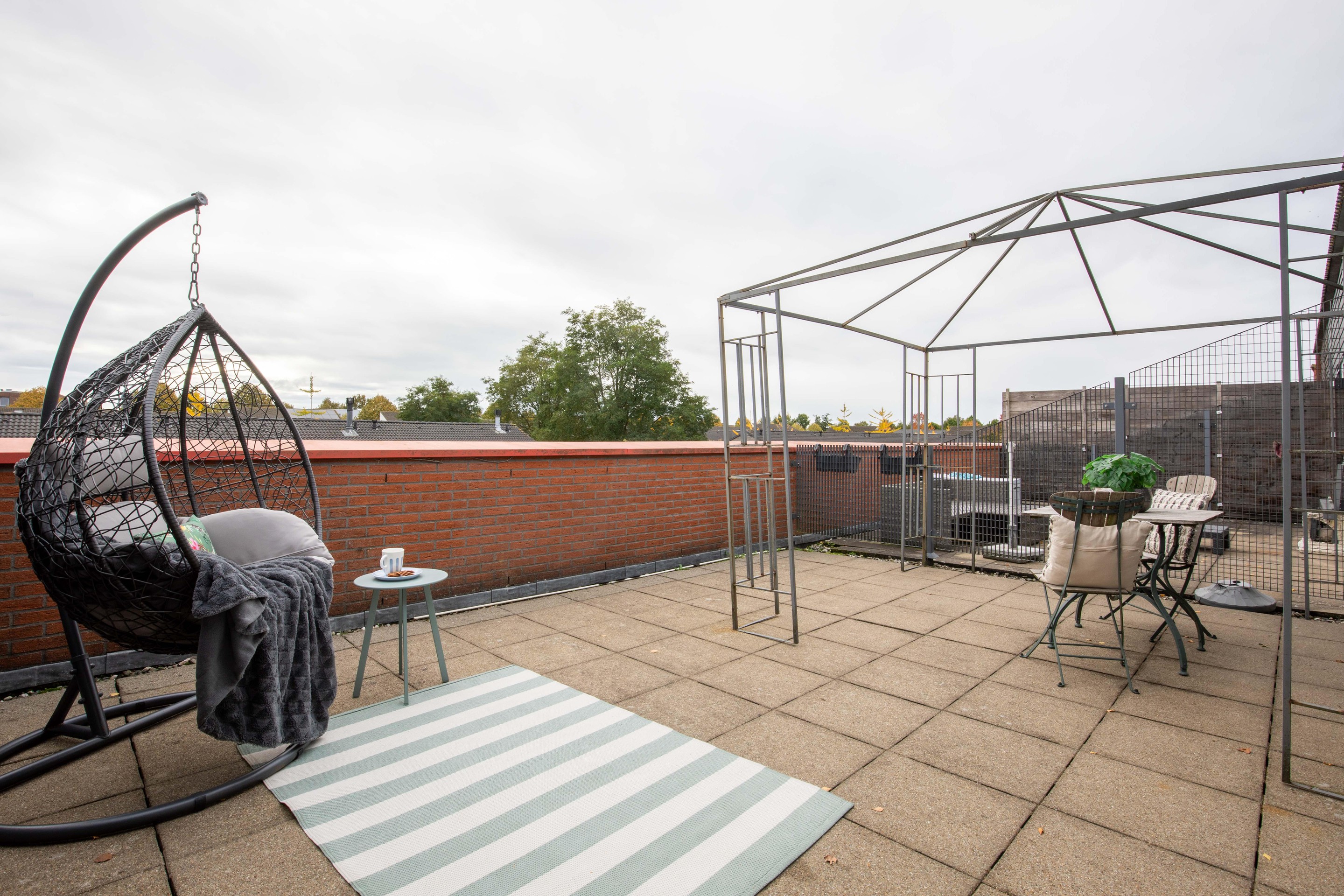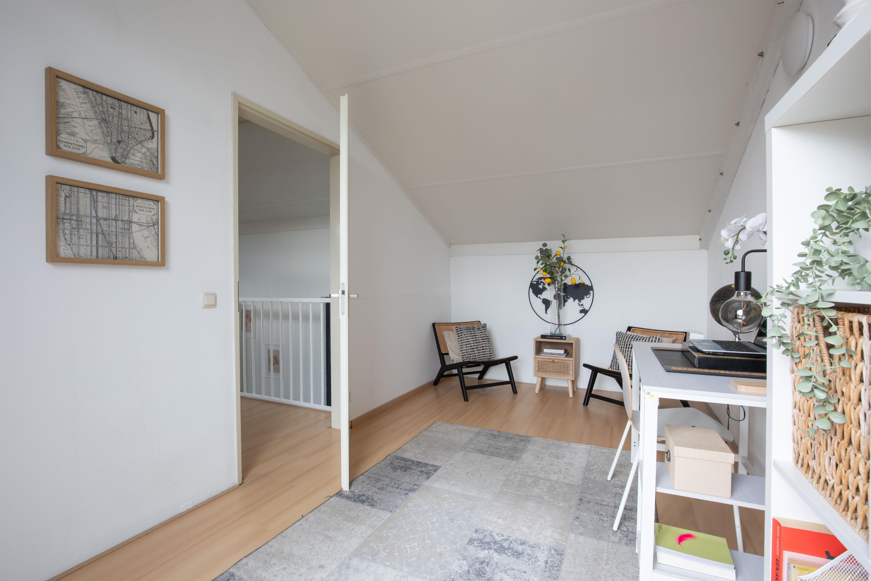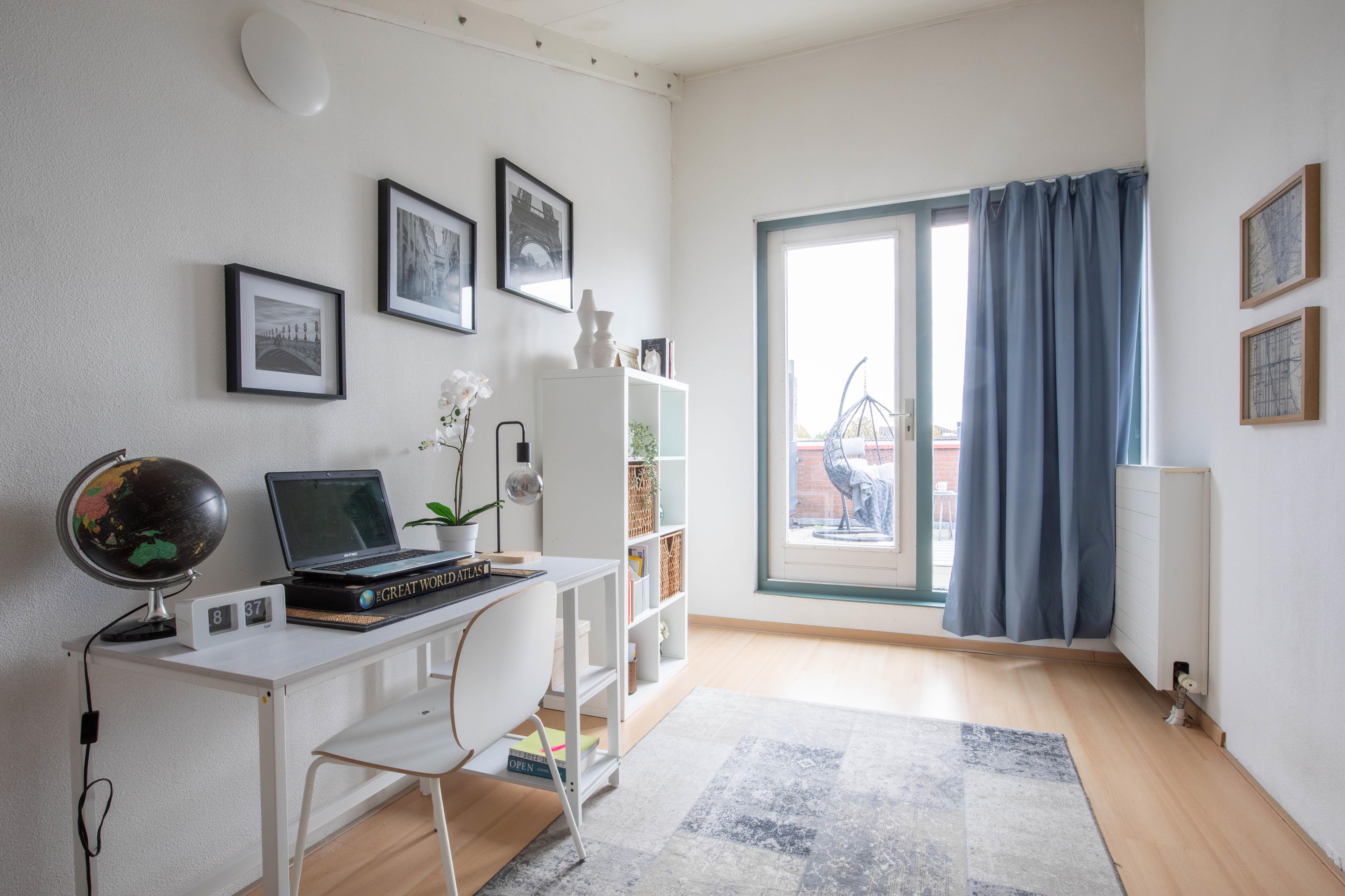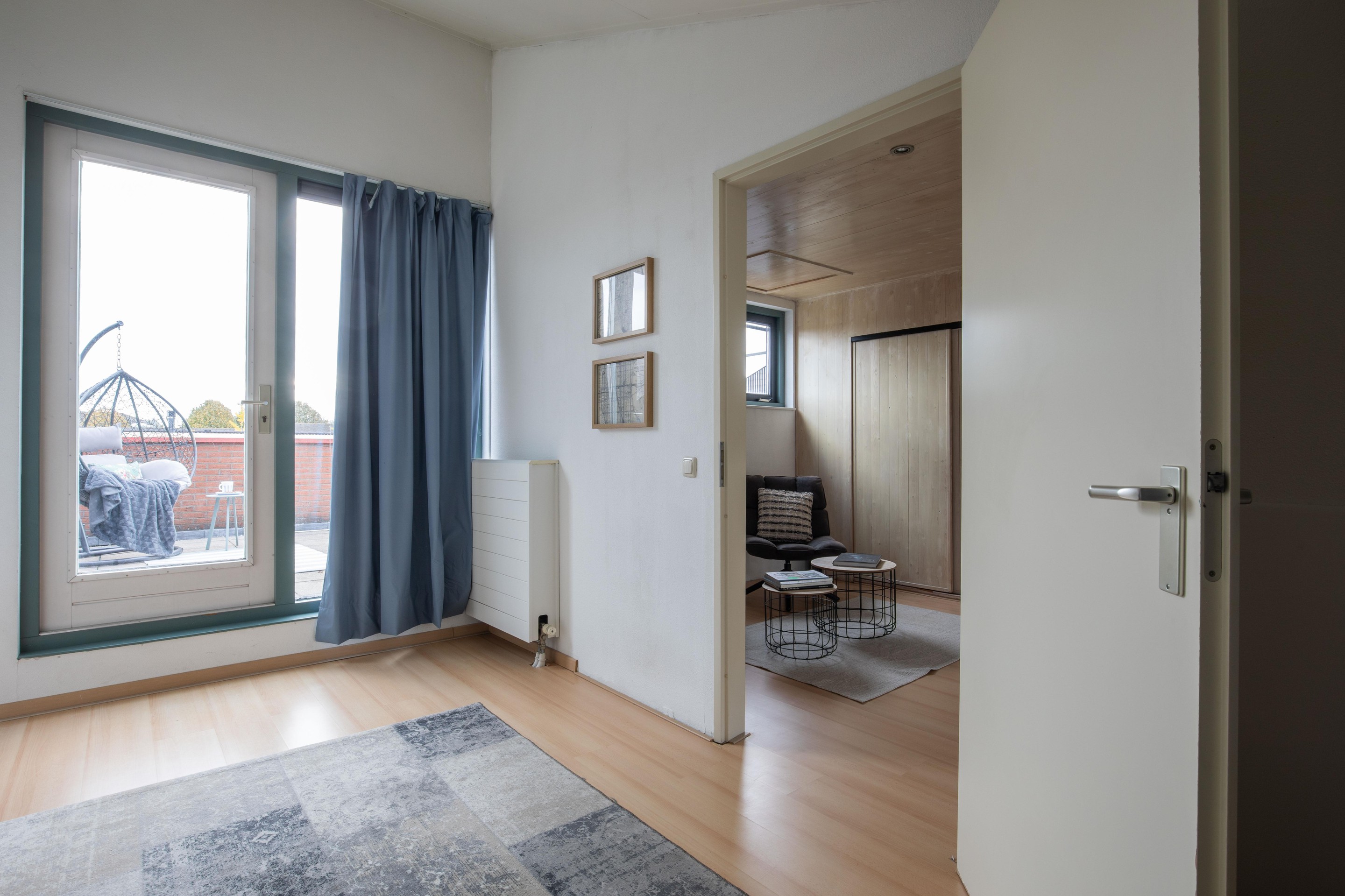 Tweede verdieping Voorzolder met wasmachine- en drogeraansluiting en een vierde slaapkamer met toegang tot het brede, zonnige dakterras – een heerlijke plek om te ontspannen.