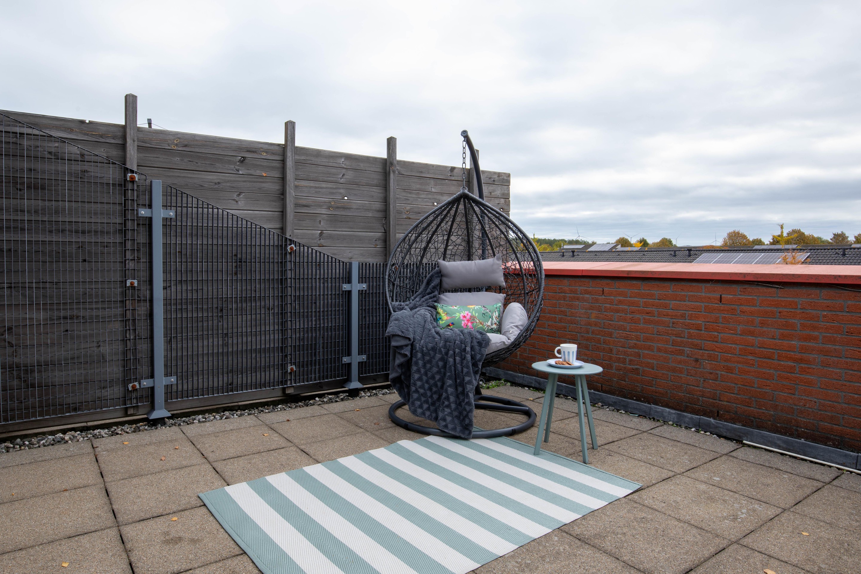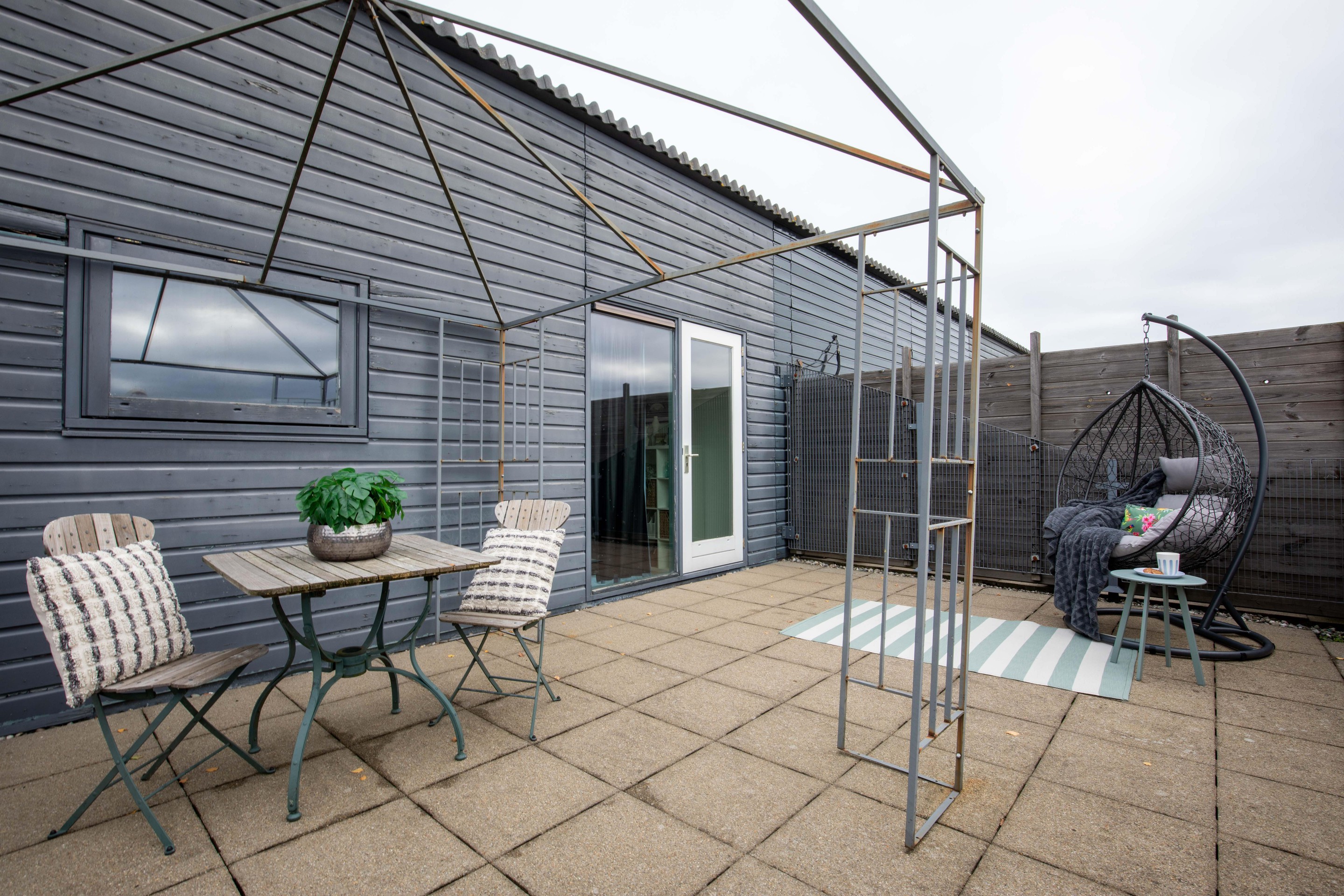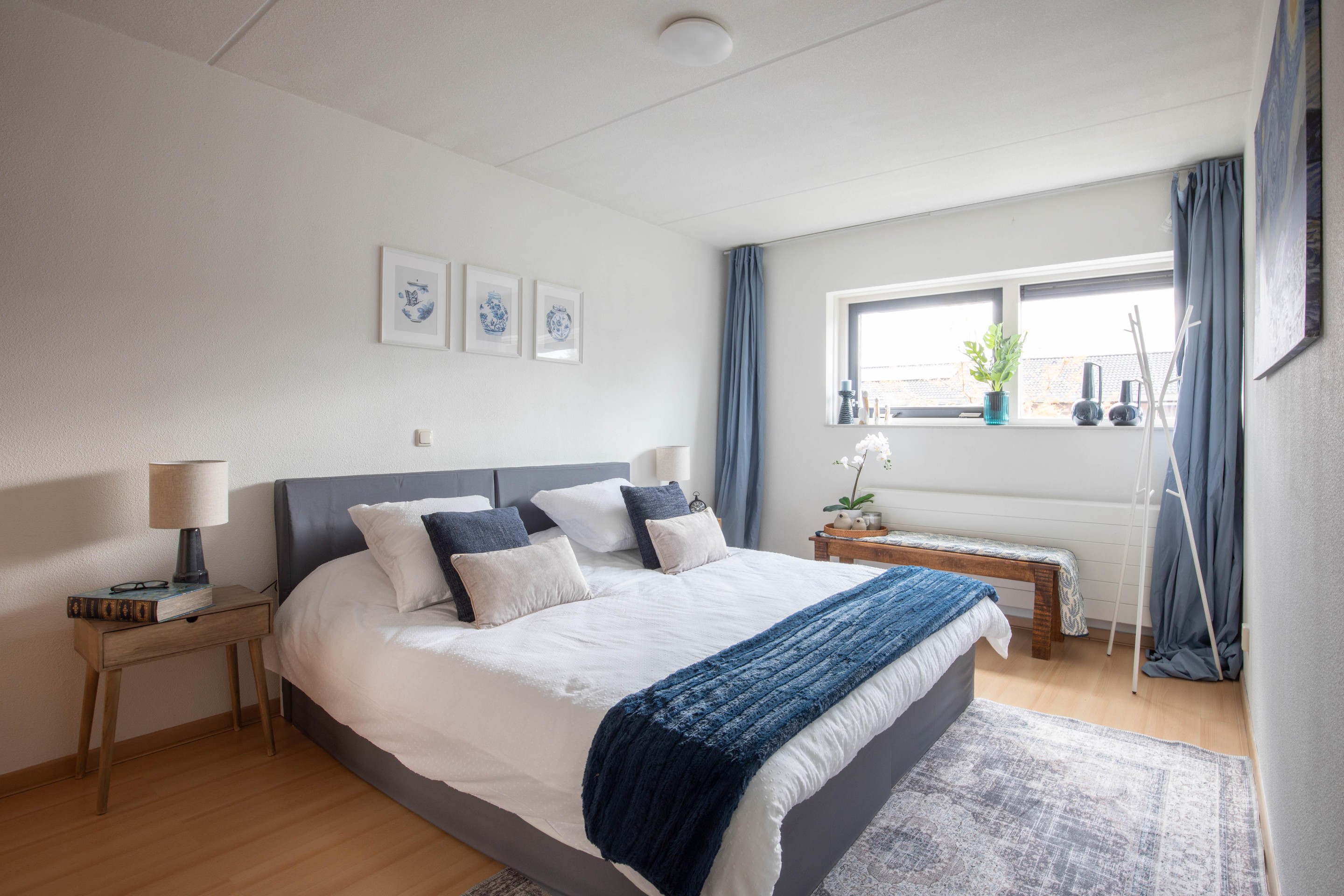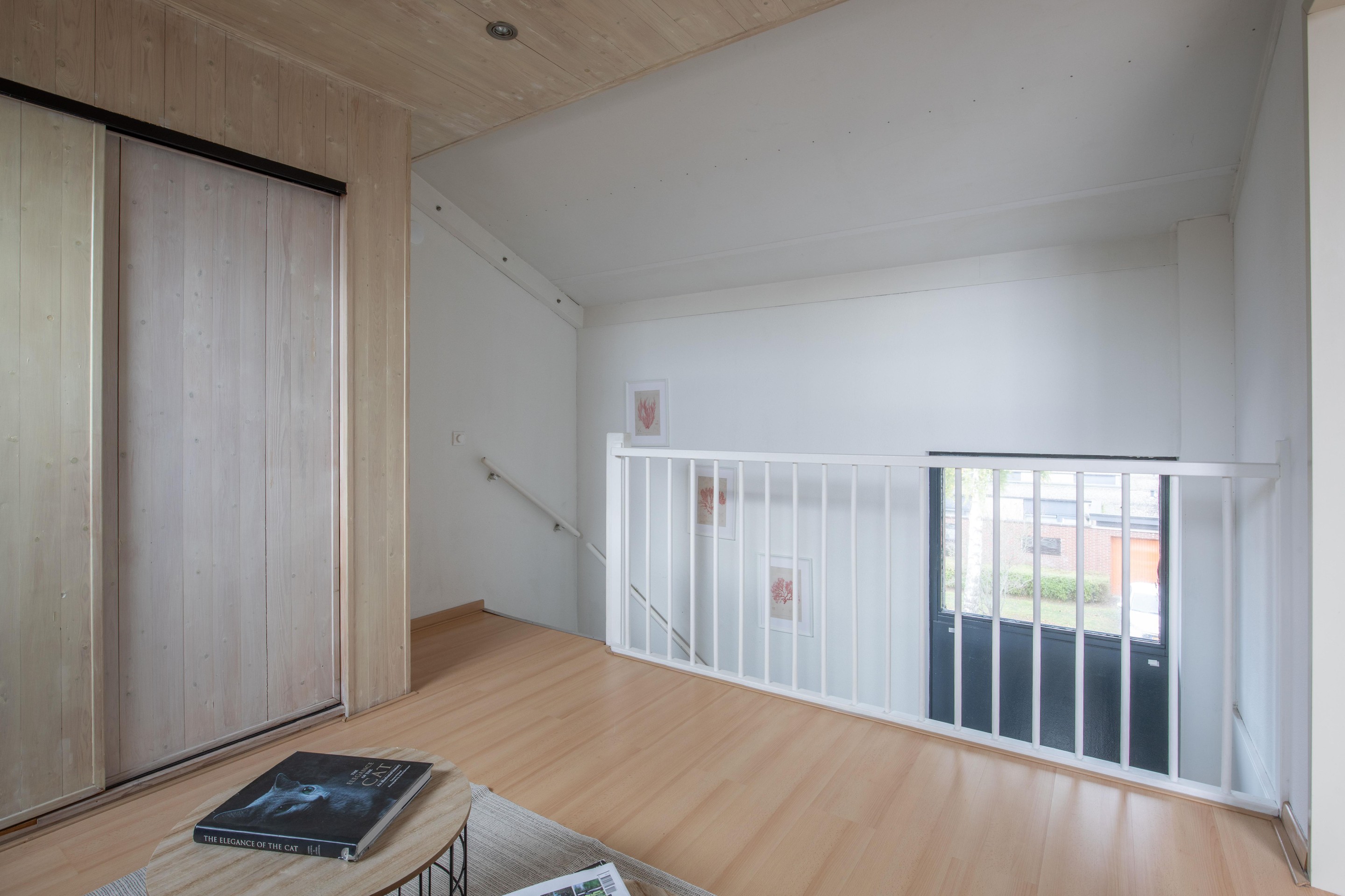 Tweede verdieping Voorzolder met wasmachine- en drogeraansluiting en een vierde slaapkamer met toegang tot het brede, zonnige dakterras – een heerlijke plek om te ontspannen.
