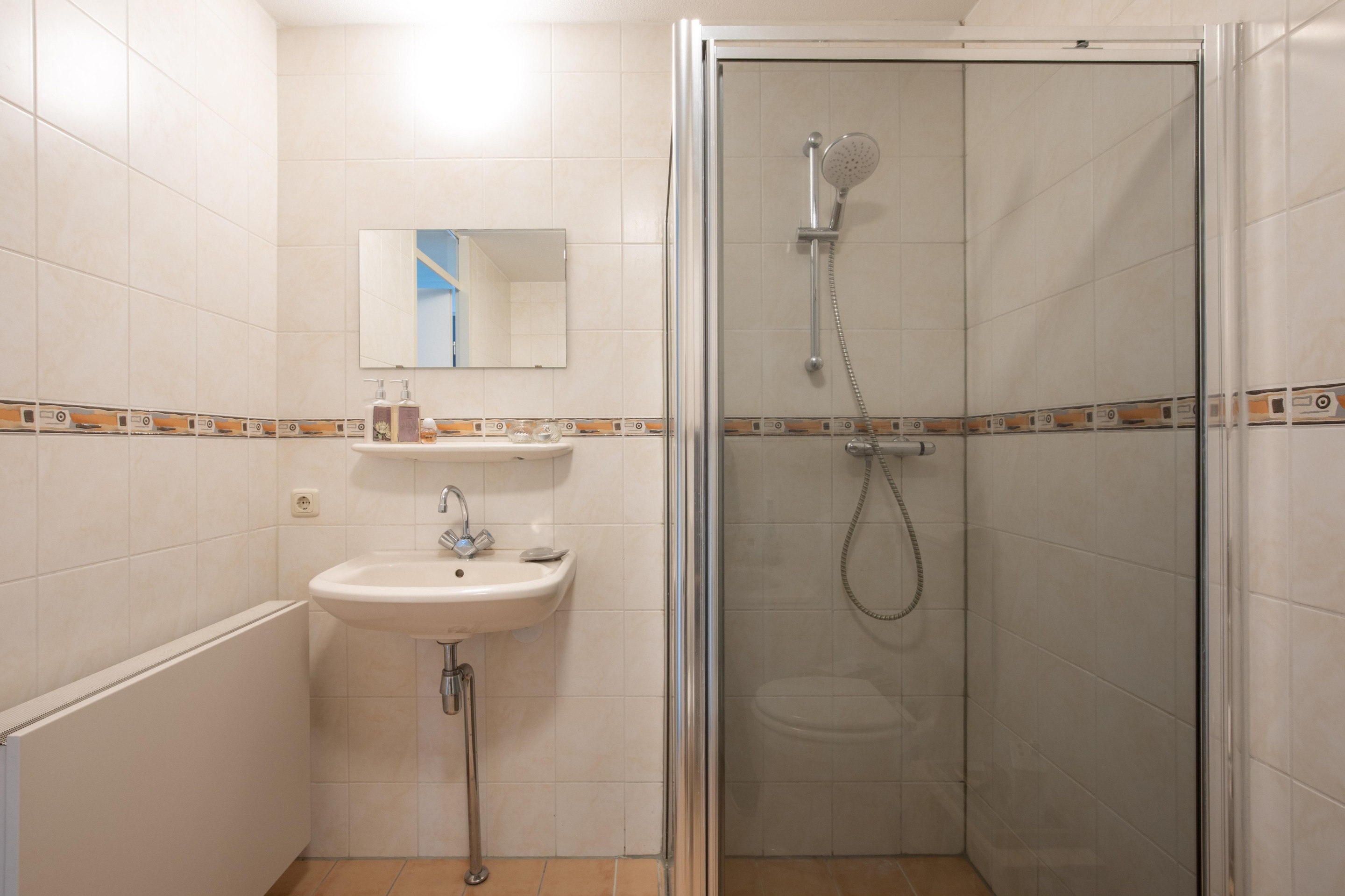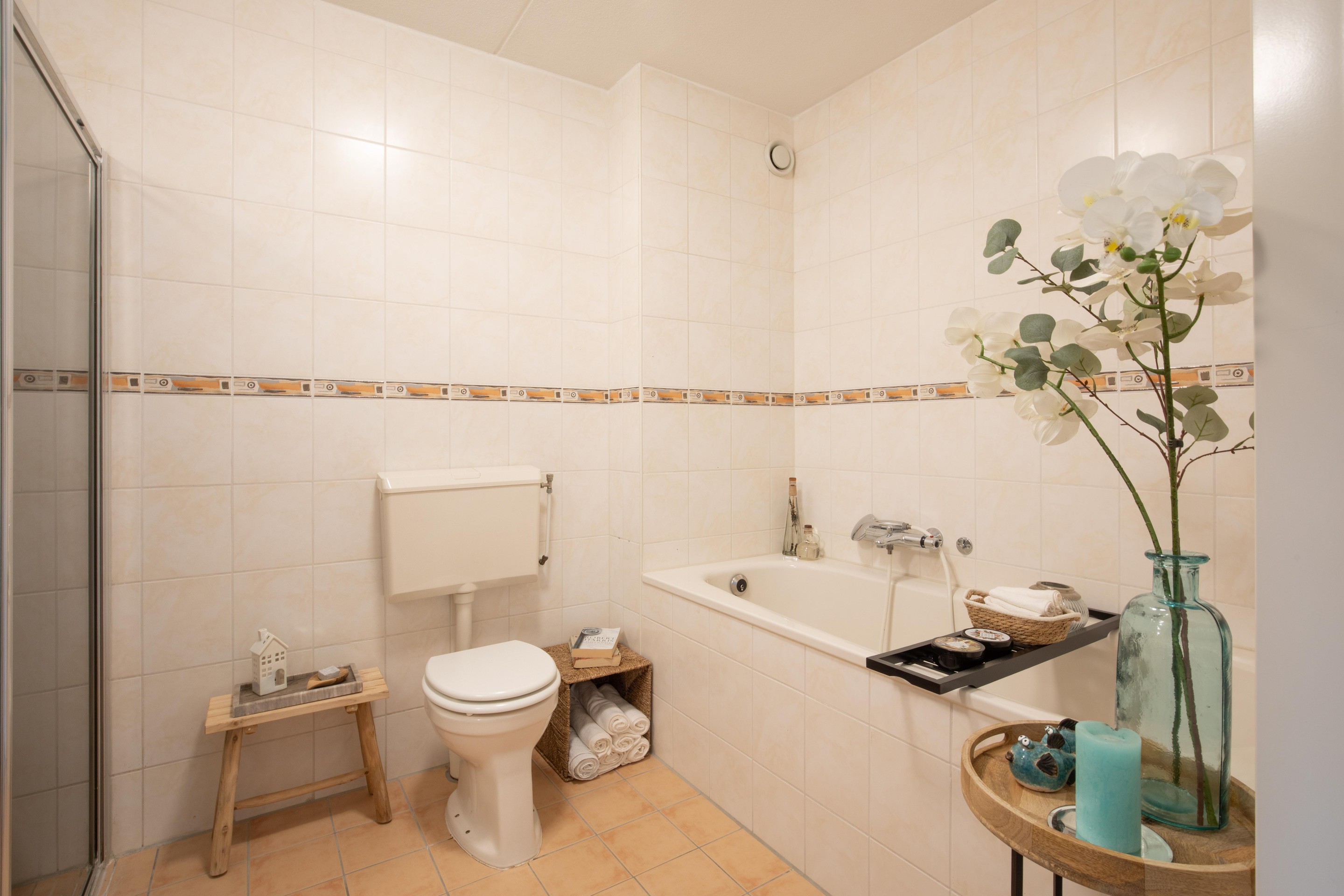 Eerste verdieping Overloop met toegang tot drie slaapkamers en een volledig betegelde badkamer met douchecabine, ligbad, toilet en wastafel.