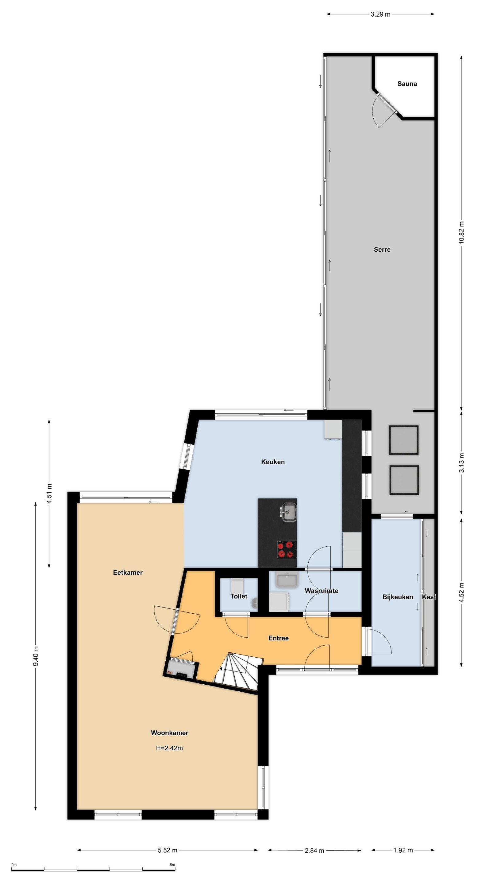 Begane grond Begane grond: entree, ruime hal met toiletruimte, woonkamer, eetkamer, open keuken met naastgelegen wasruimte met doorgang naar de hal. Bijkeuken voorzien van inbouw opberg- voorraadkasten, te bereiken via de hal en de serre.
