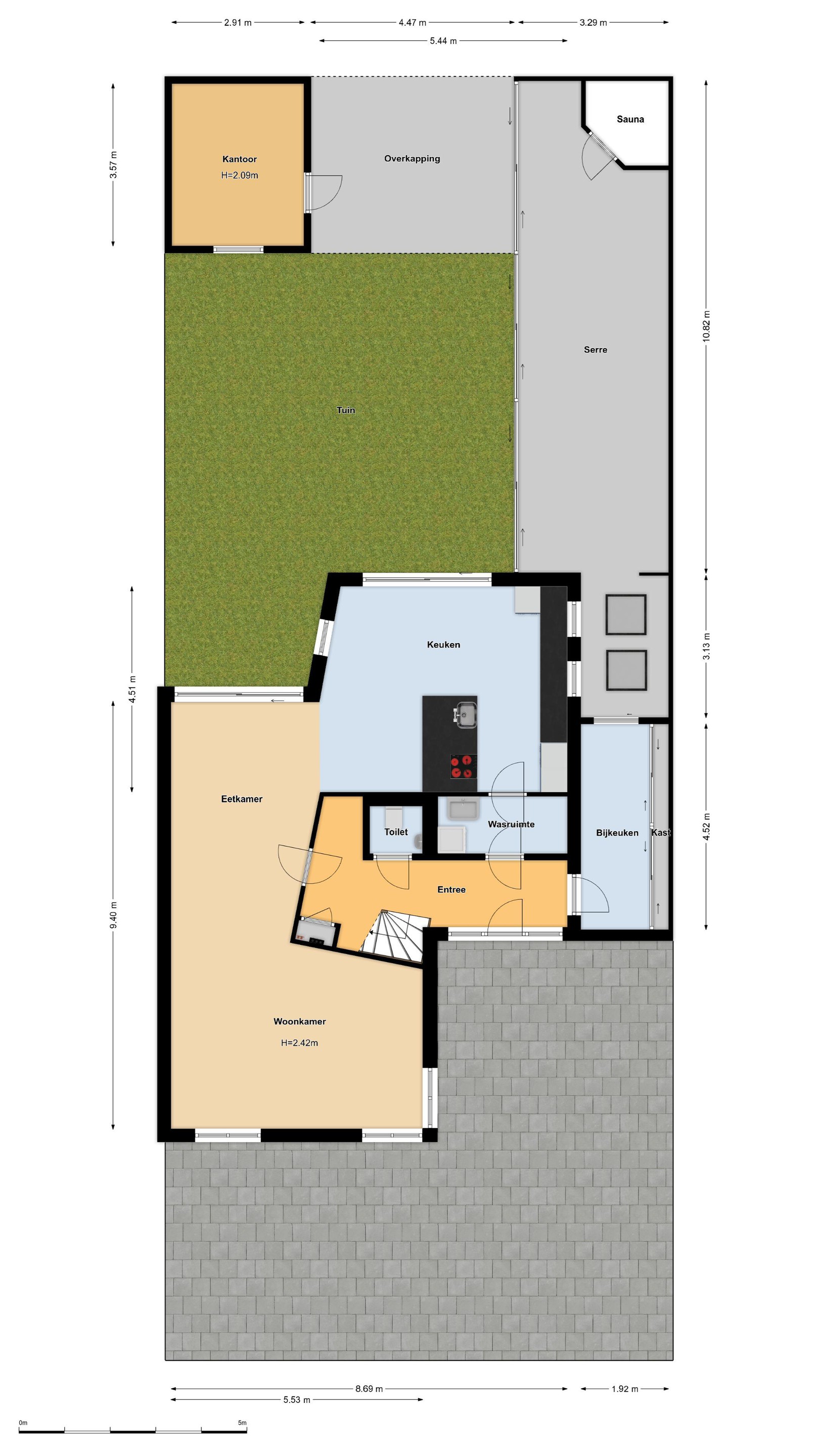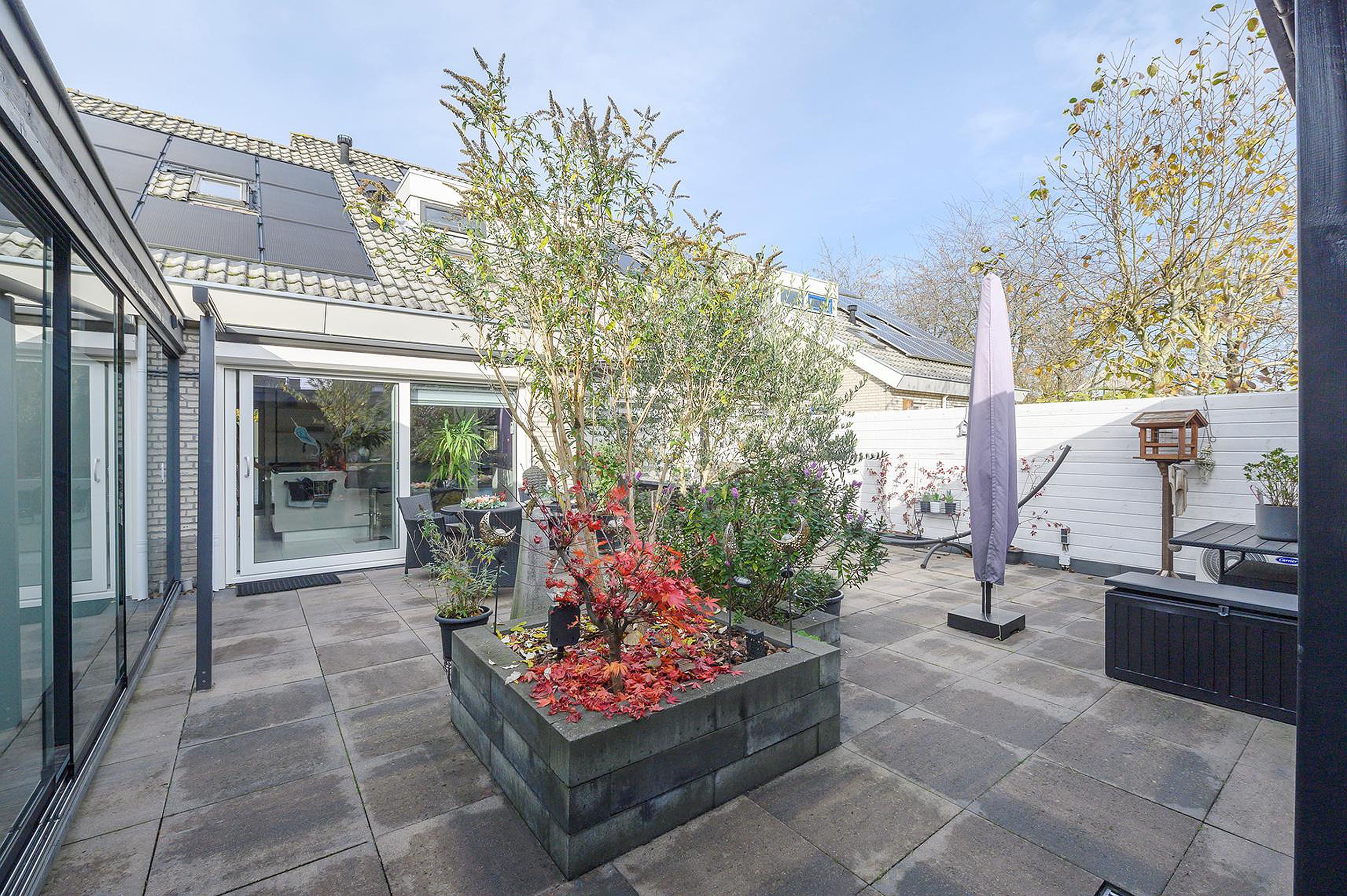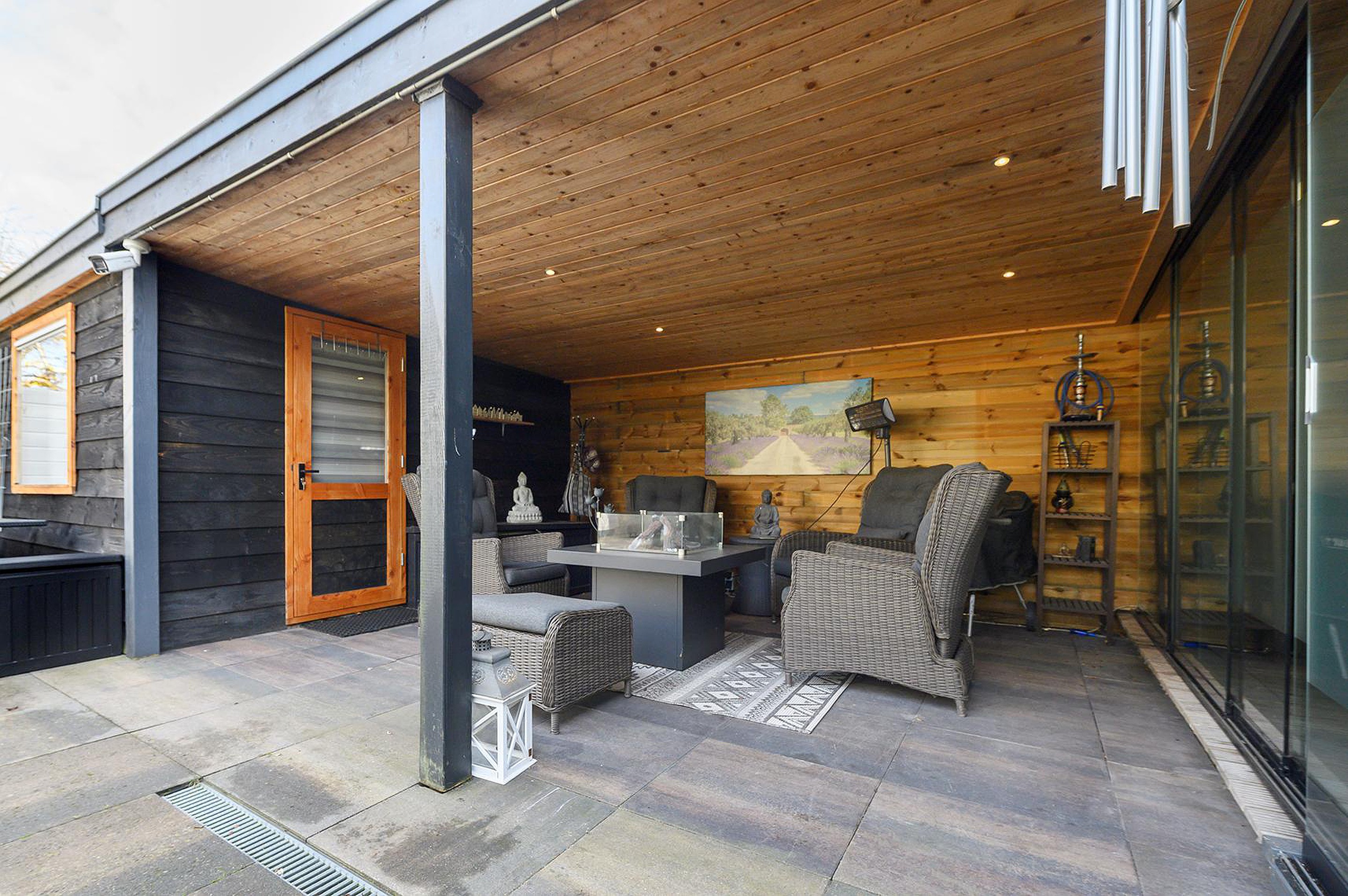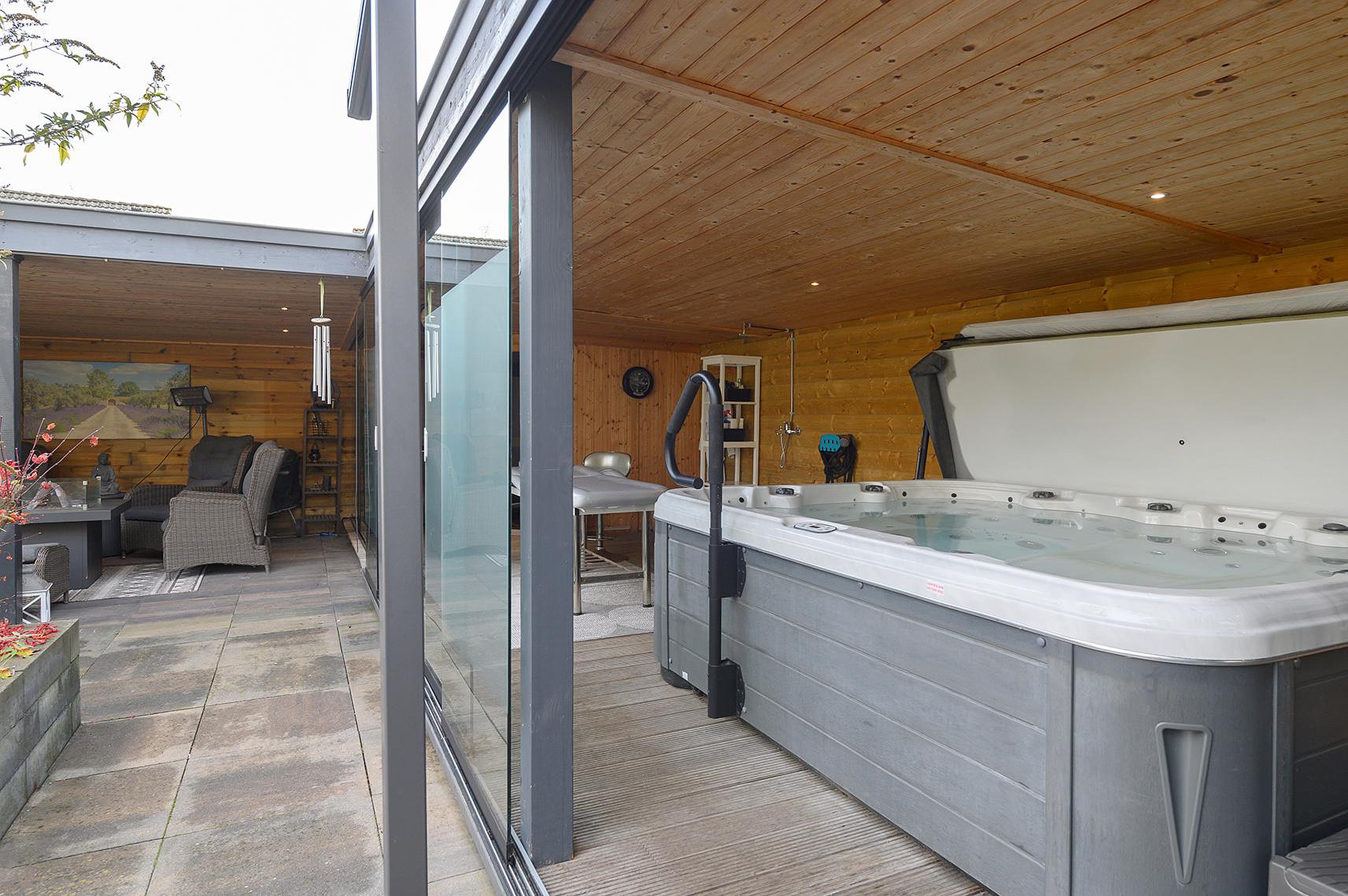 Tuin aan de achterzijde, met serre voorzien van jacuzzi, sauna en douche. Deze serre is gedeeltelijk te openen door middel van glazen schuivende panelen. Overkapping voorzien van buitenhaard. Kantoorruimte, thans in gebruik als gastenkamer.