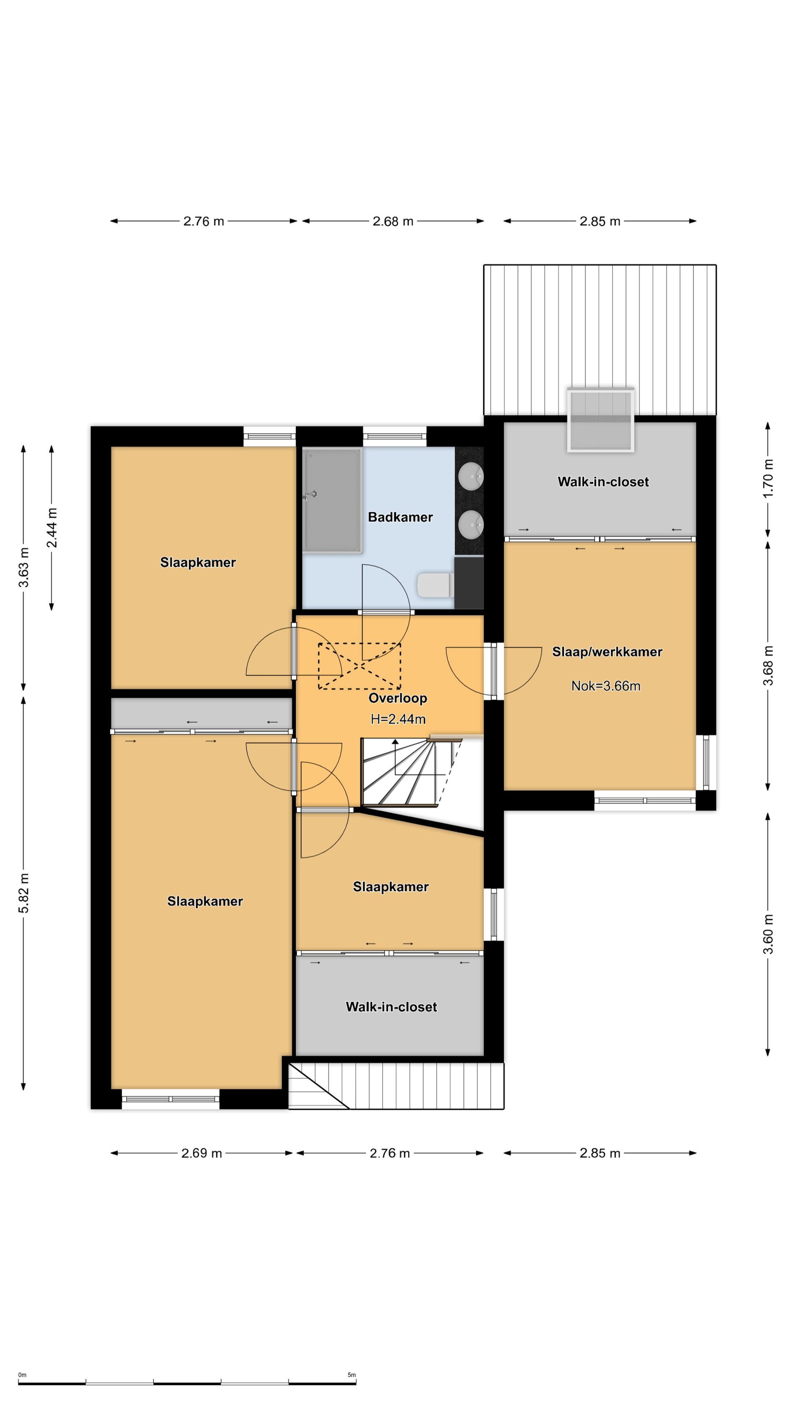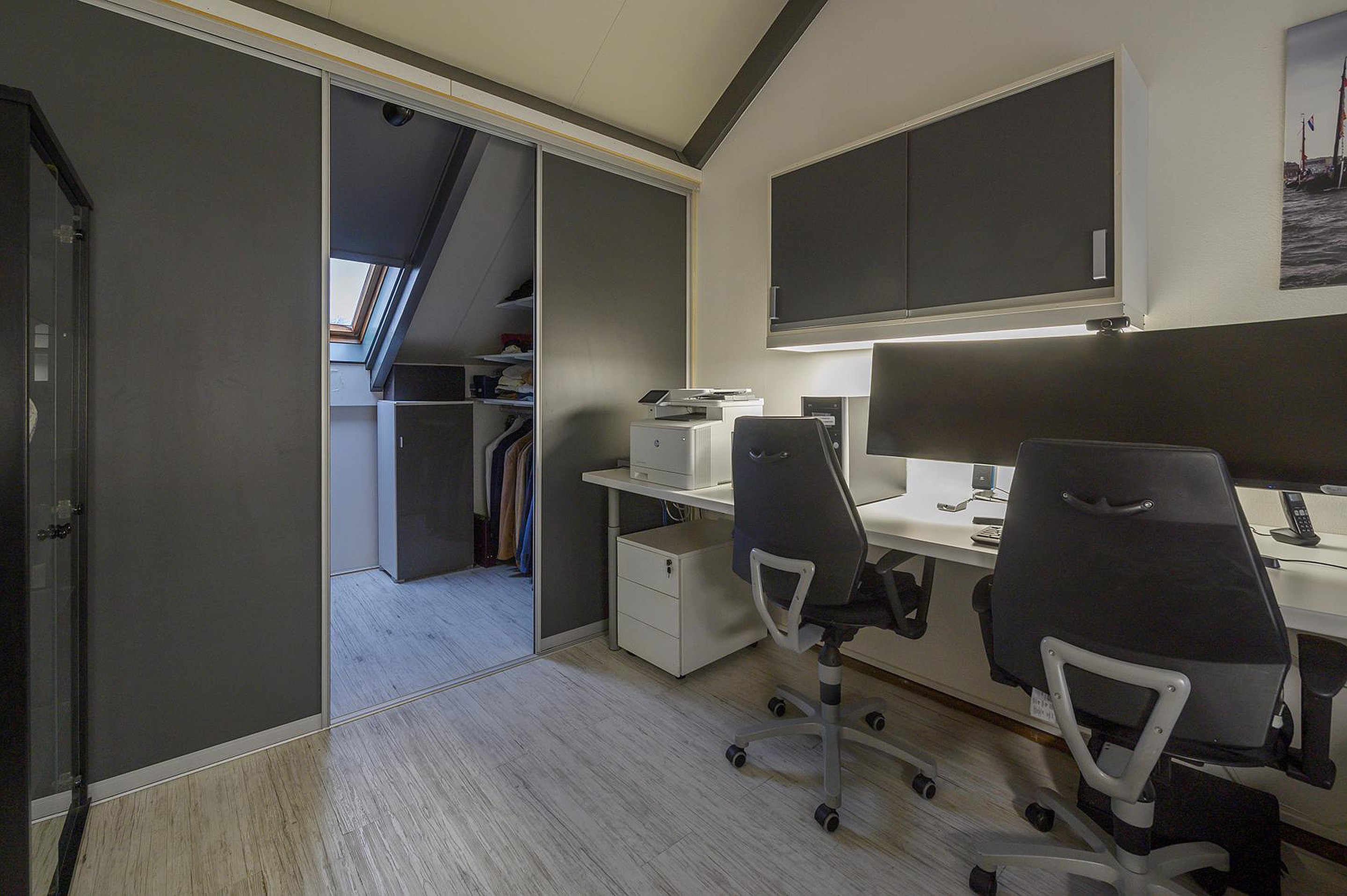 1e Verdieping: 4 slaapkamers, waarvan twee met een walk-in closet en één met een kastenwand. Eén van de slaapkamers is thans in gebruik als werkkamer.