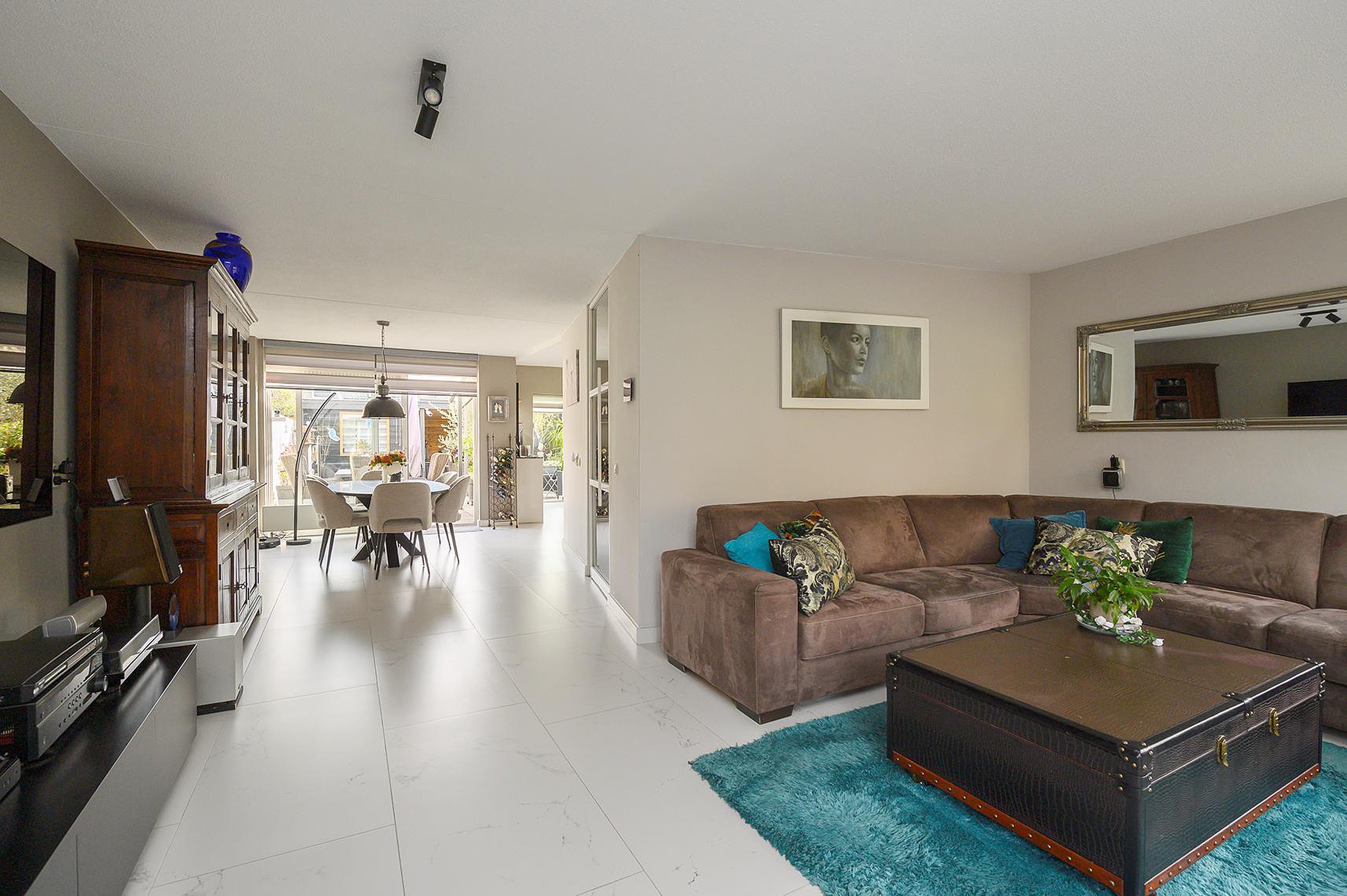 Stoffering 2023: begane grond: mooie grote keramische vloertegels met marmer-look, 1e verdieping PVC vloer met uitzondering van de badkamer.