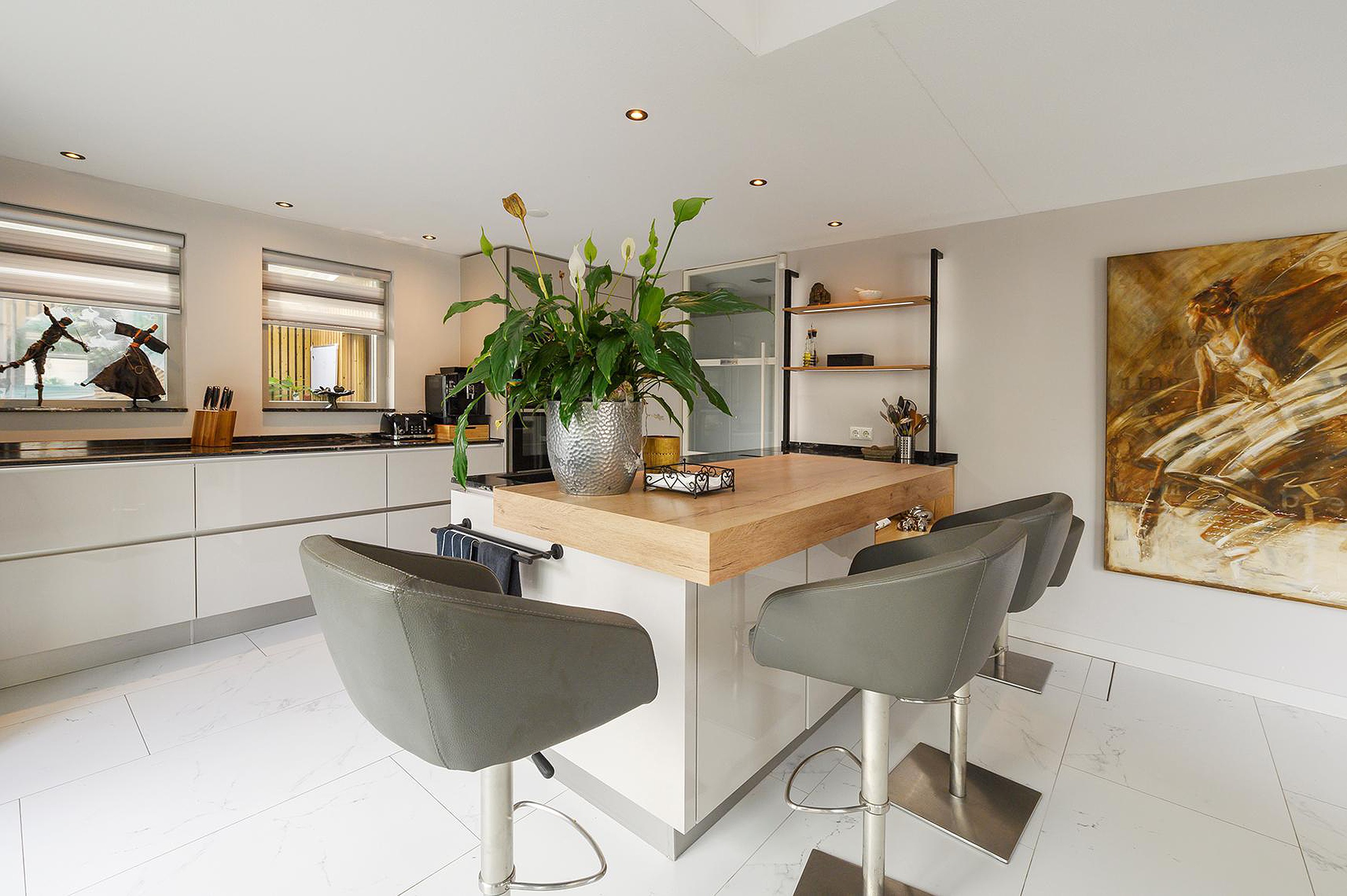 - Kitchen: modern luxury kitchen extended and renovated in 2021, consisting of several kitchen units with various base and wall cabinets, as well as a cooking and washing-up island with a breakfast bar. The kitchen is finished in a beautiful soft and light colour with a solid black granite worktop. The kitchen has various built-in appliances, namely a fridge-freezer, climate cabinet, steam oven, combi-oven, induction hob with cooktop extractor, dishwasher and Quooker, which can also be used optionally with a CO2 cartridge for sparkling water. The kitchen has air conditioning and a second sliding door (2021) to the garden.