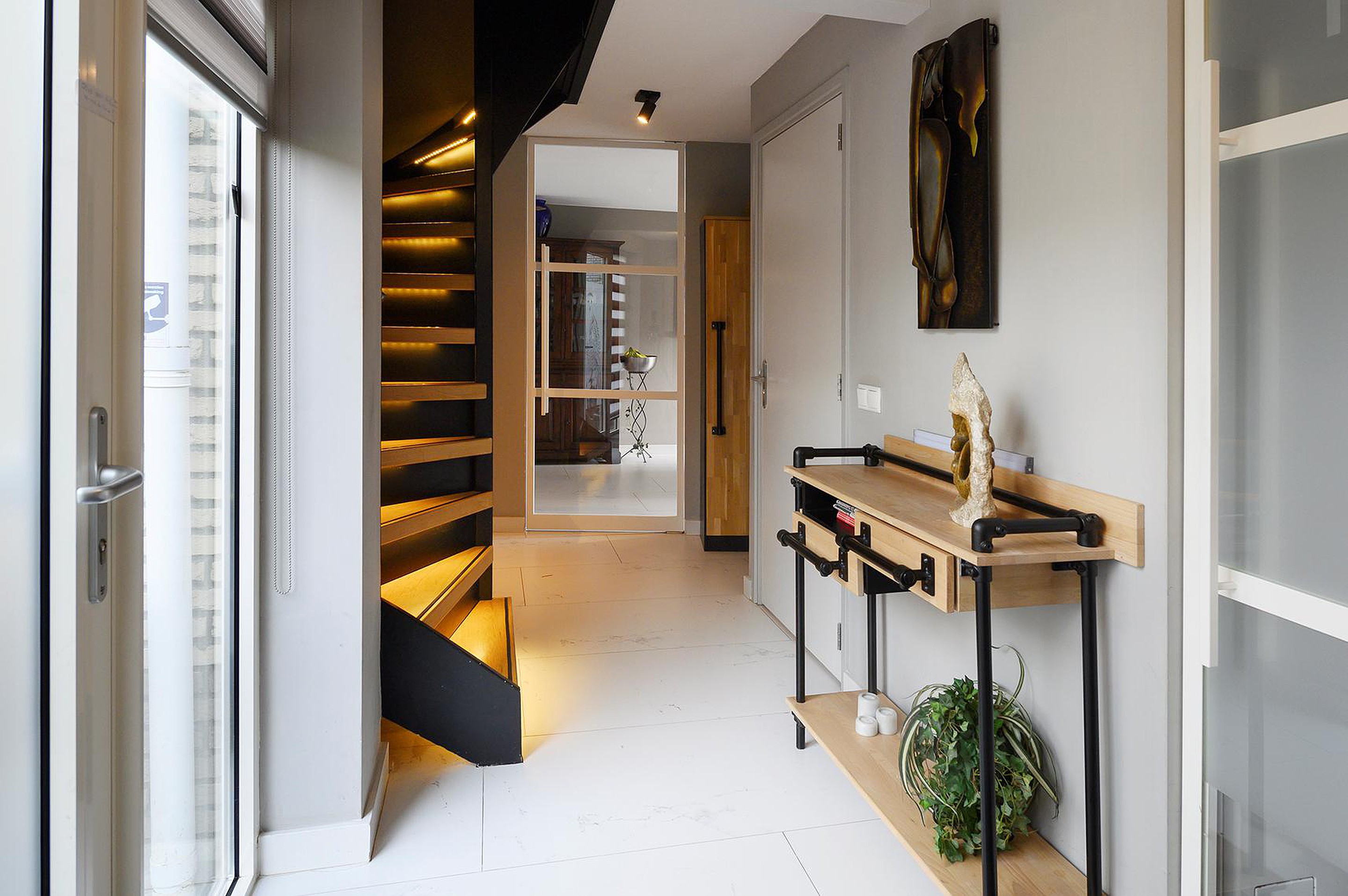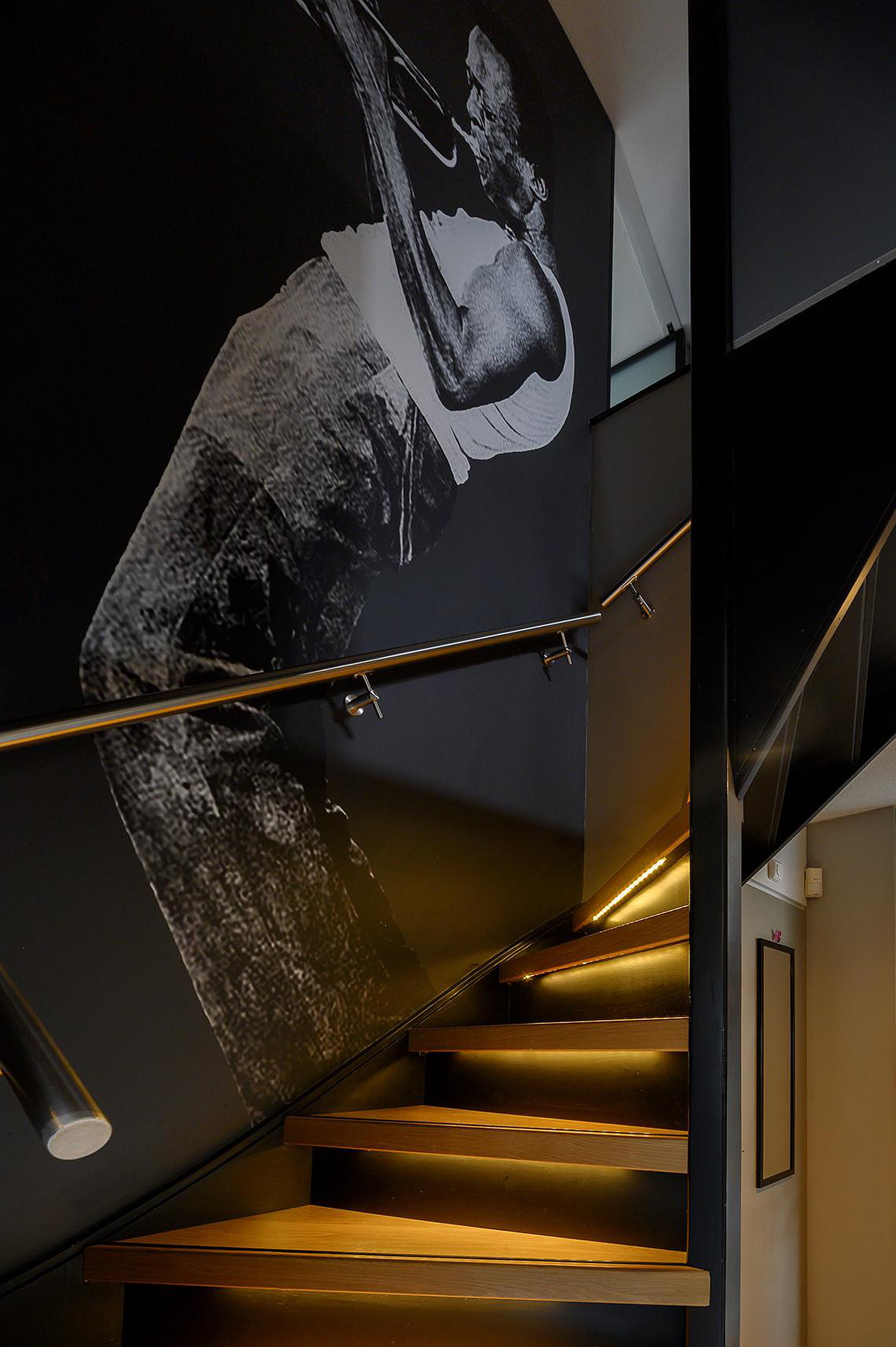 Dichte trap naar de eerste verdieping: in 2021 voorzien van verlichting en treden met eikenhout.