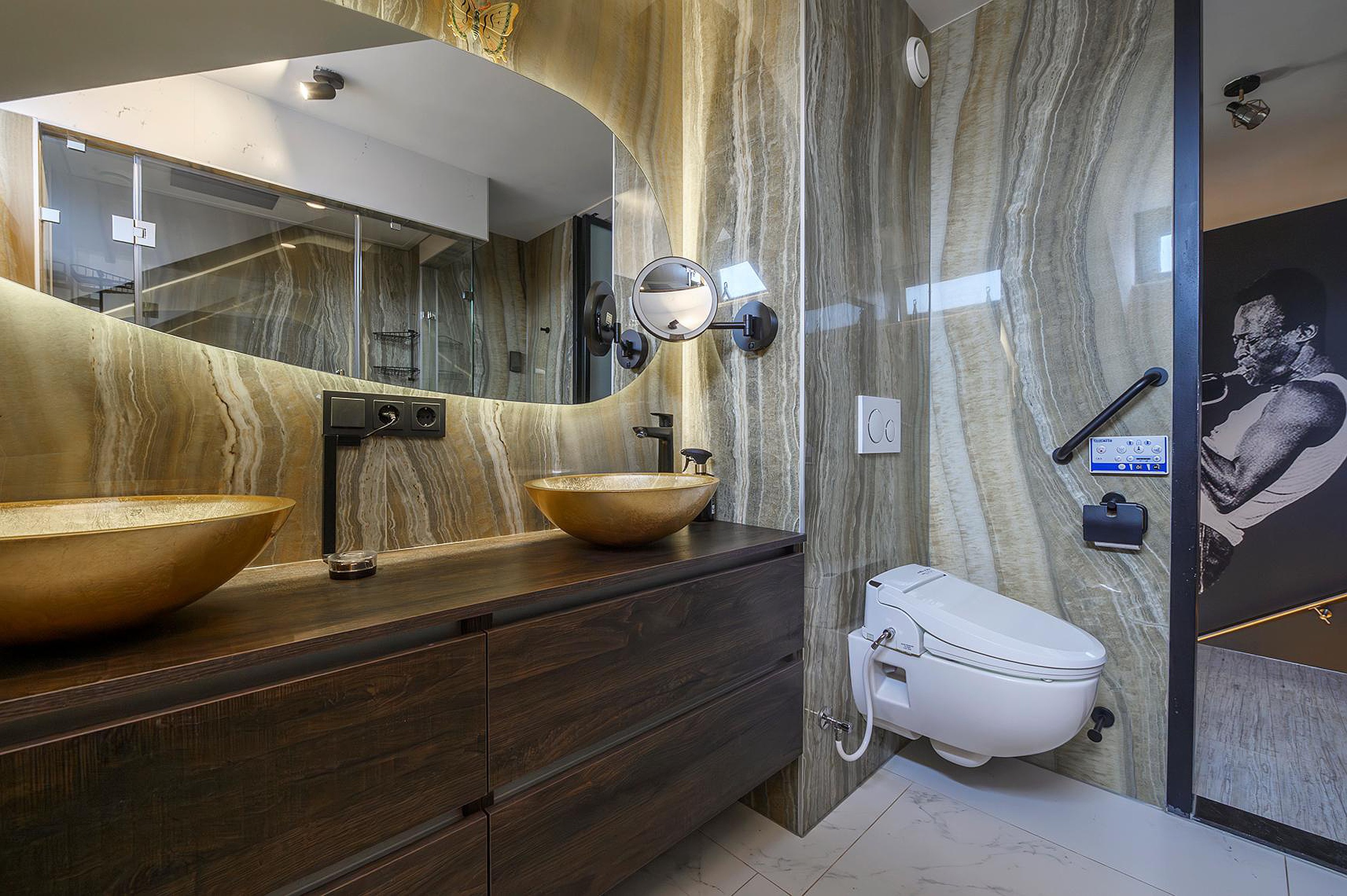 - Ground floor toilet: equipped with a modern toilet combination that heats, dries and can be used as a bidet, washbasin and mirror with LED lighting. The floor is covered with ceramic floor tiles and the walls are fitted with beautiful ceramic wall panels with natural stone.