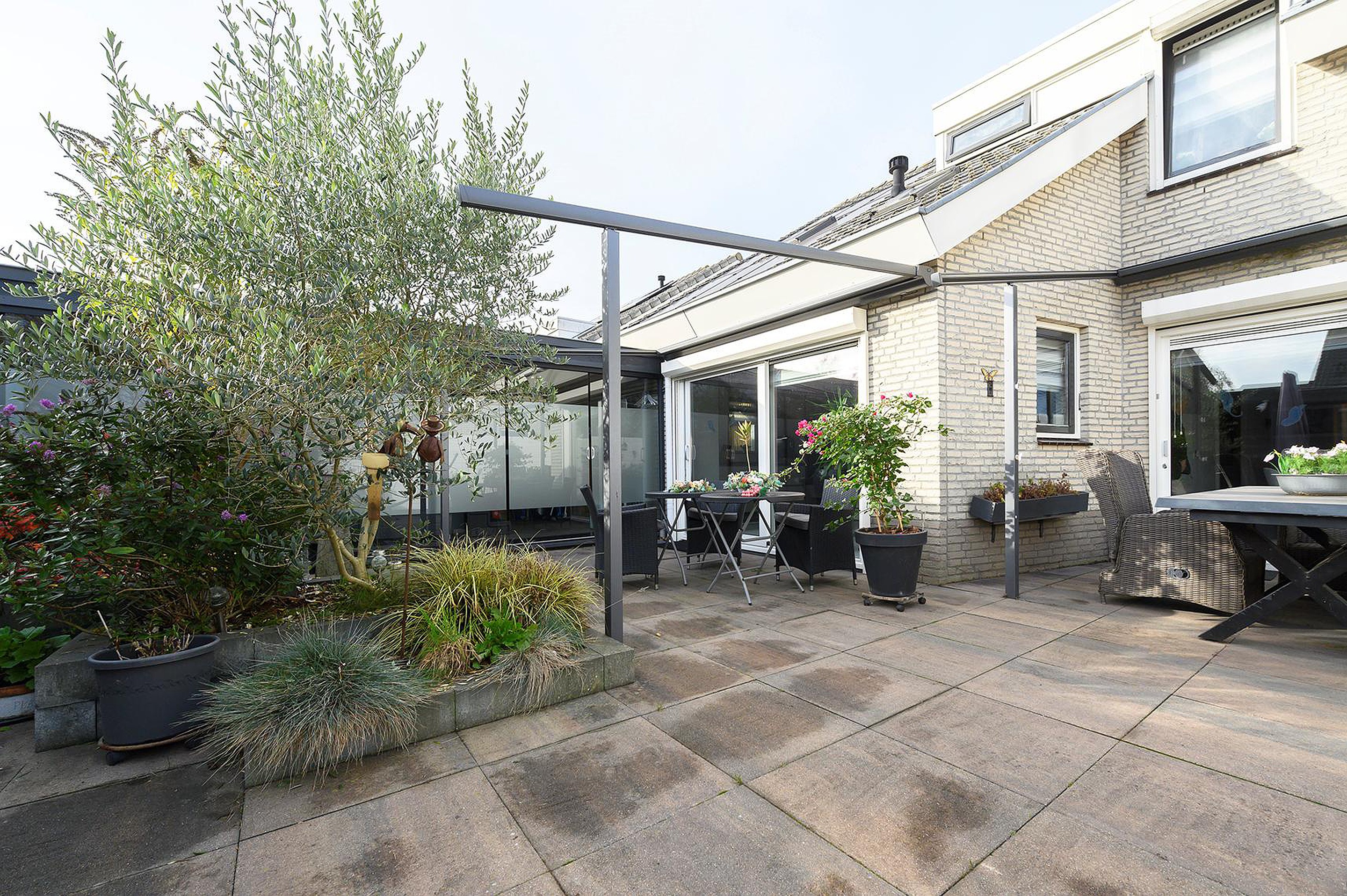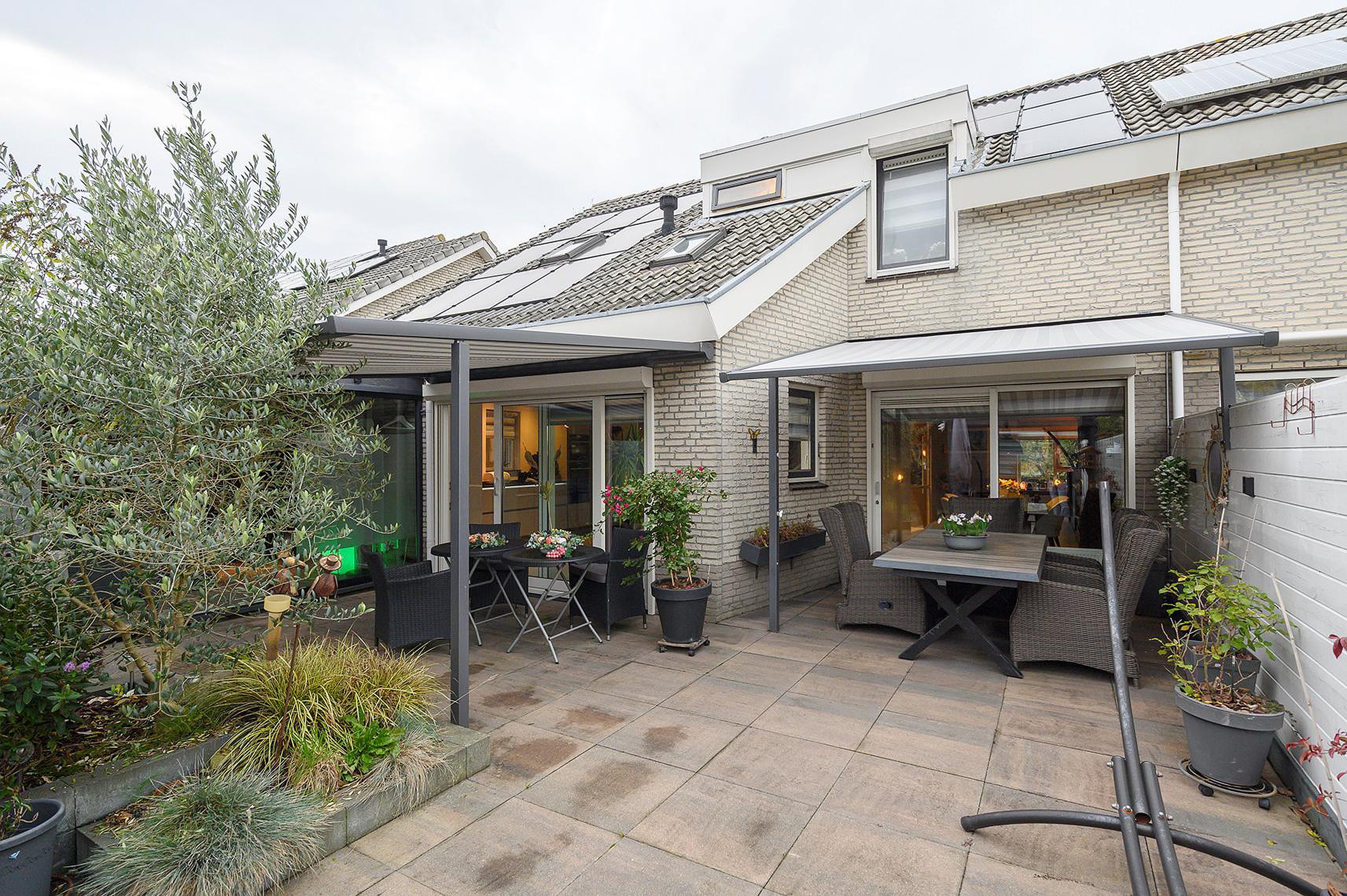 Twee electrisch te bedienen zonneschermen bij de twee schuifpuien aan de achterzijde.