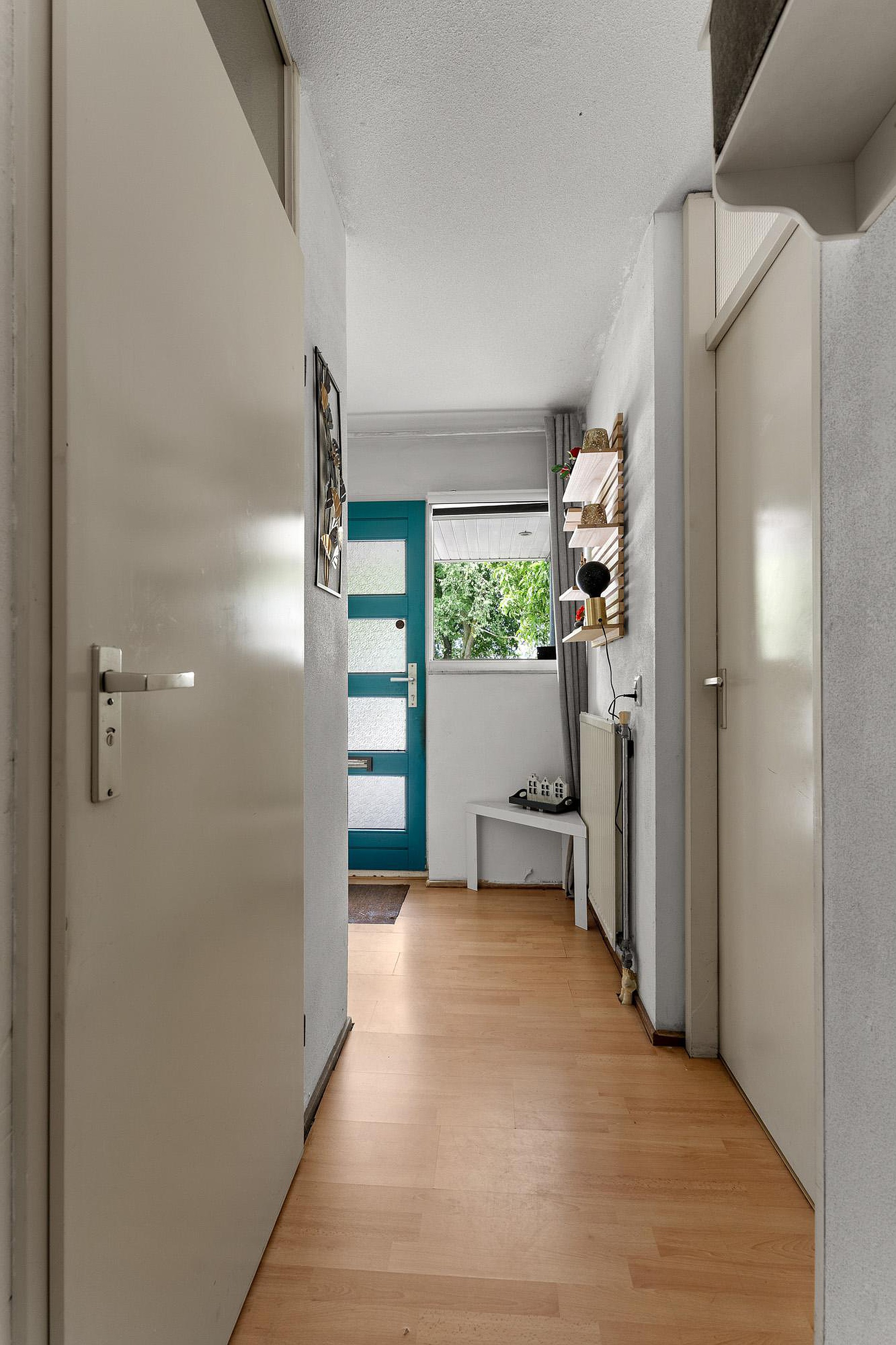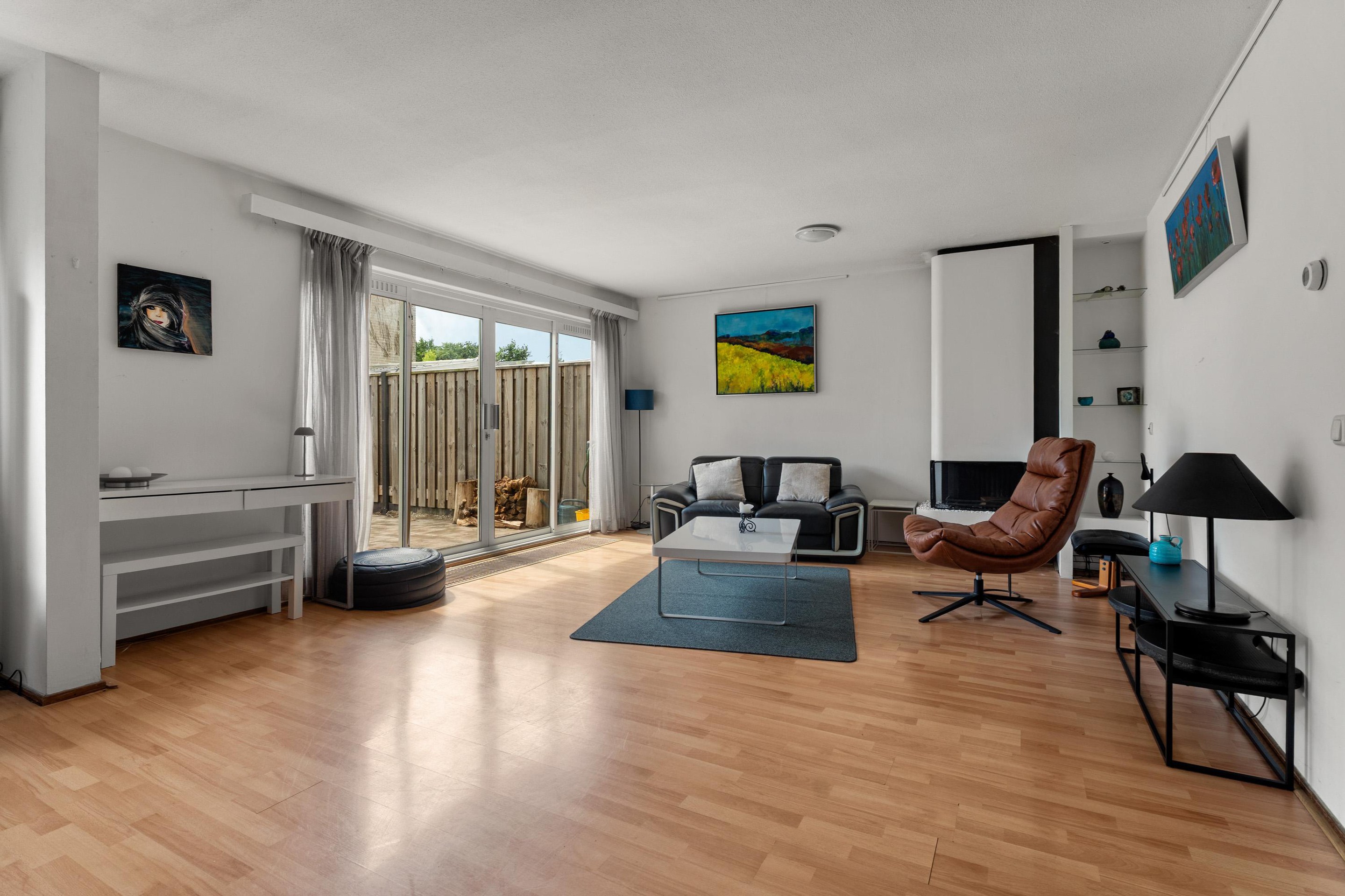 In the frontyard a roofed front door welcomes you to the hallway. The hallway containing the meter cupboard, restroom and acces to the kitchen, the living room and the indoor garage. The living room is attached to the kitchen which makes for a sizeable ground floor space. It has a fireplace and a big aluminium sliding doors to the backyard providing the room with lots of natural light. The kitchen is equipped with an oven, gas hob stove, extractor hood, dishwasher and sufficient working and storage space. The indoor garage is also accessible through its own segmented garage door at the front of the house connected to the driveway.