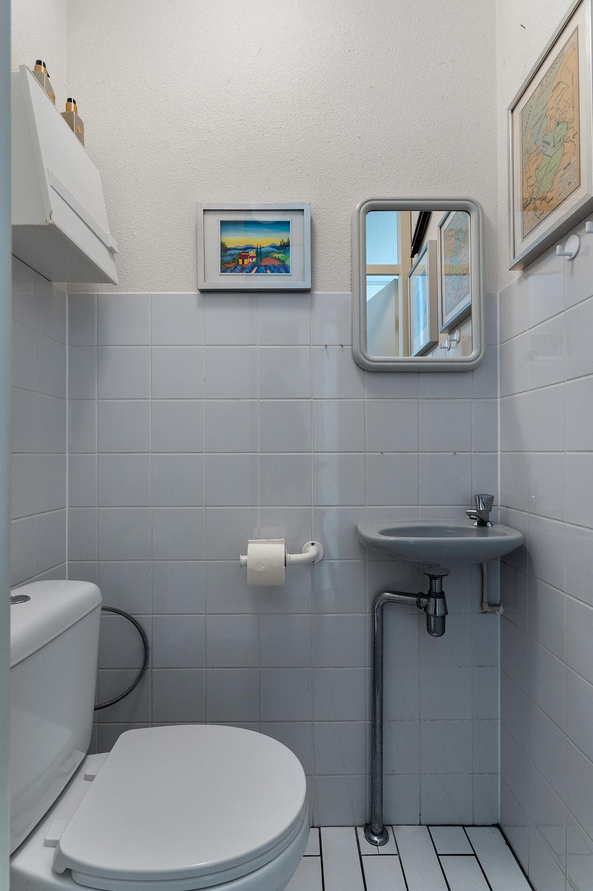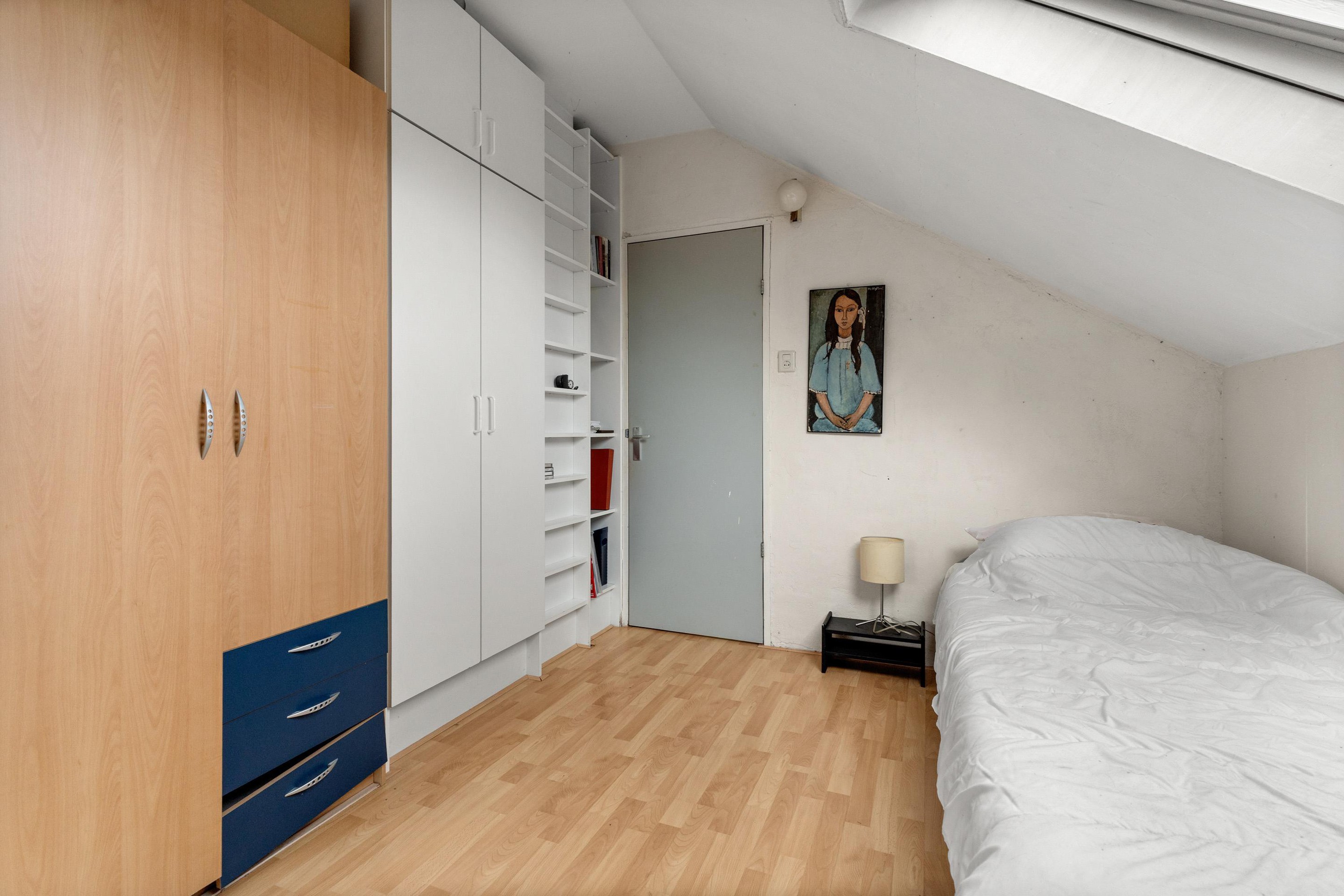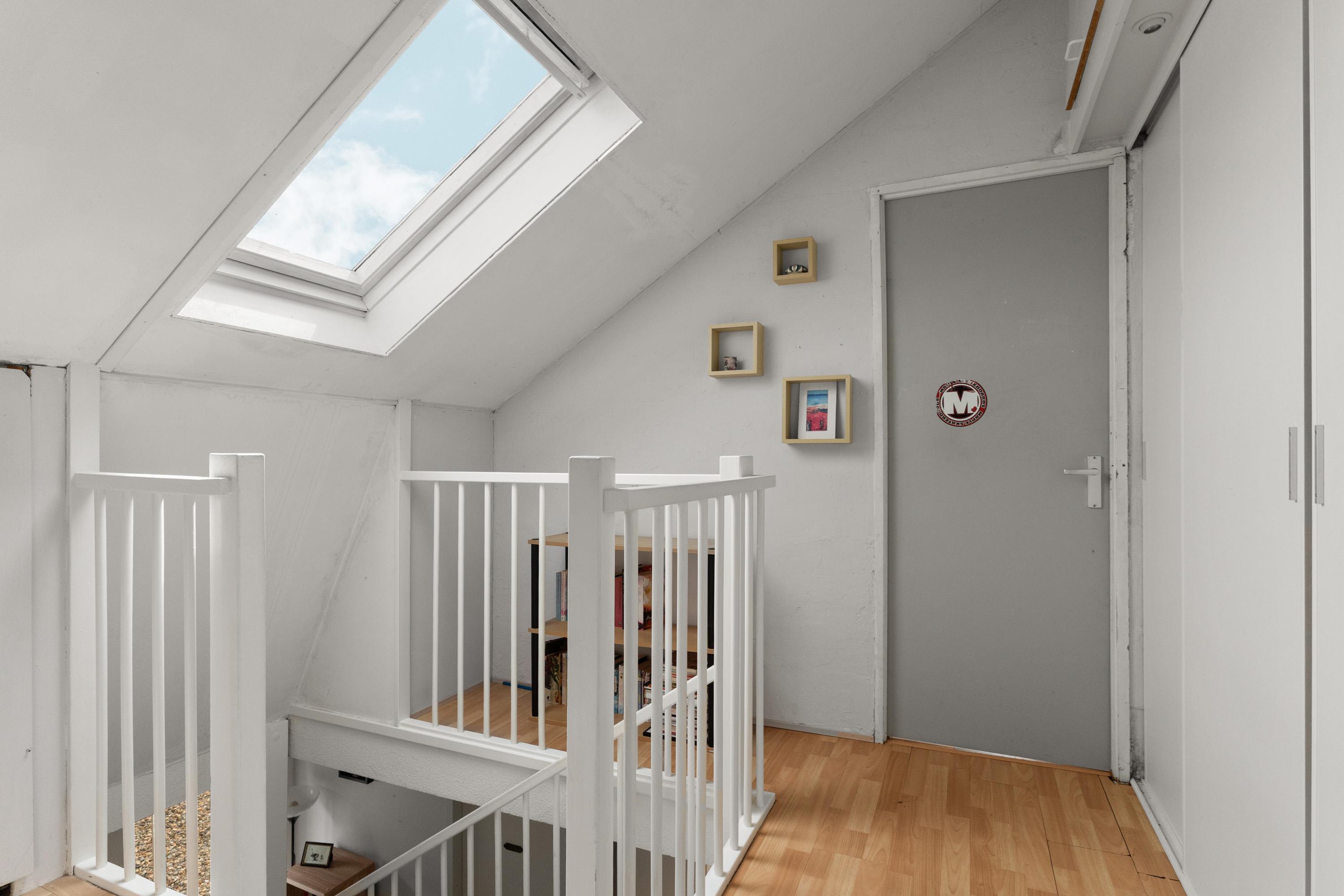 Going up on the second fixed staircase there is another vast floor. It comes with a landing containing the central heating system (neatly situated in a cupboard) and storage space and acces to two more bedrooms. The bedrooms come equipped with both skylights and 'regular' windows on either side of the house making the attic surprisingly well-lit with lots of natural light during the day. The attic is complete with a generous amount of storage space underneath the sloping walls alongside the entire side of the house.