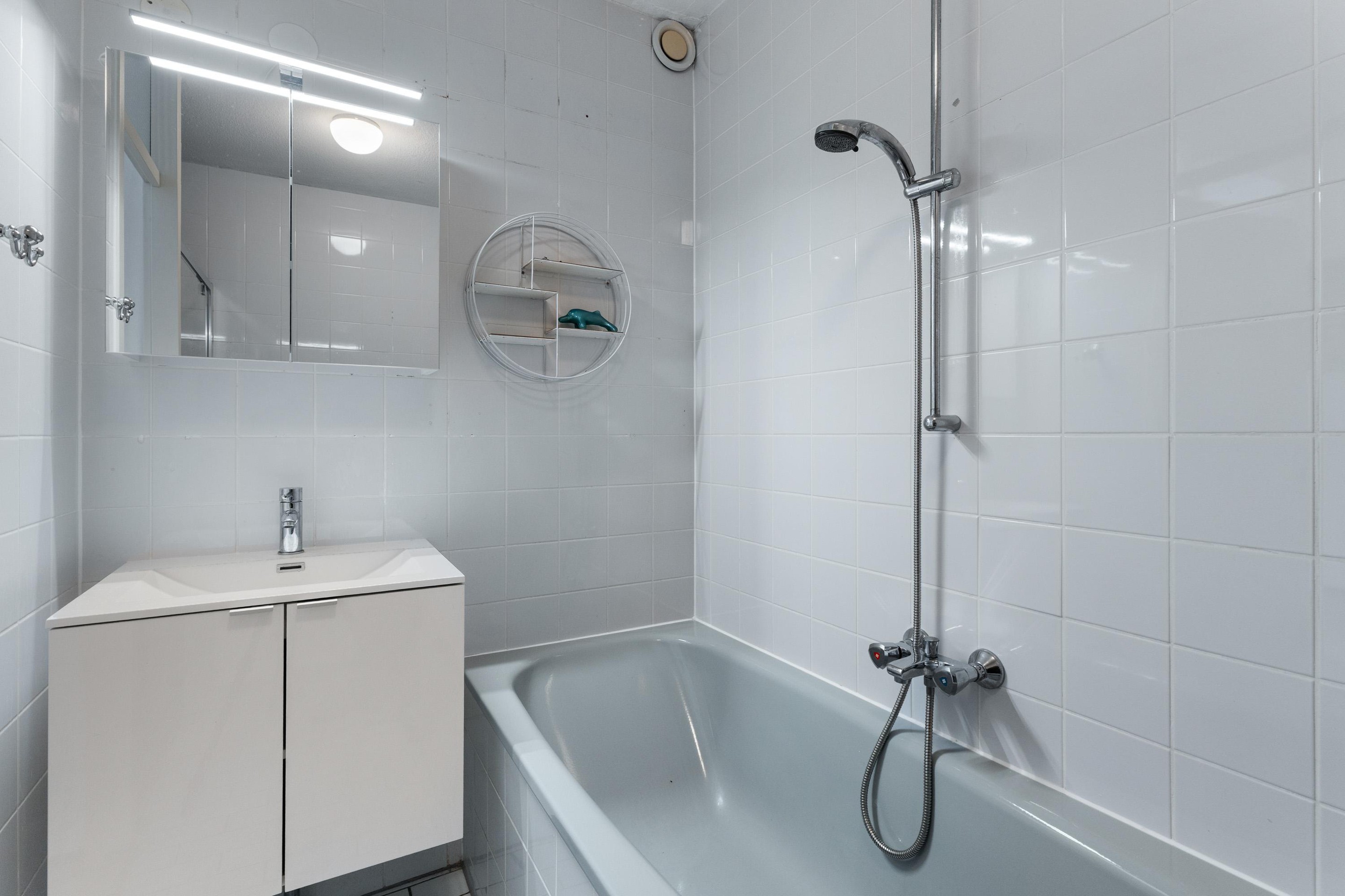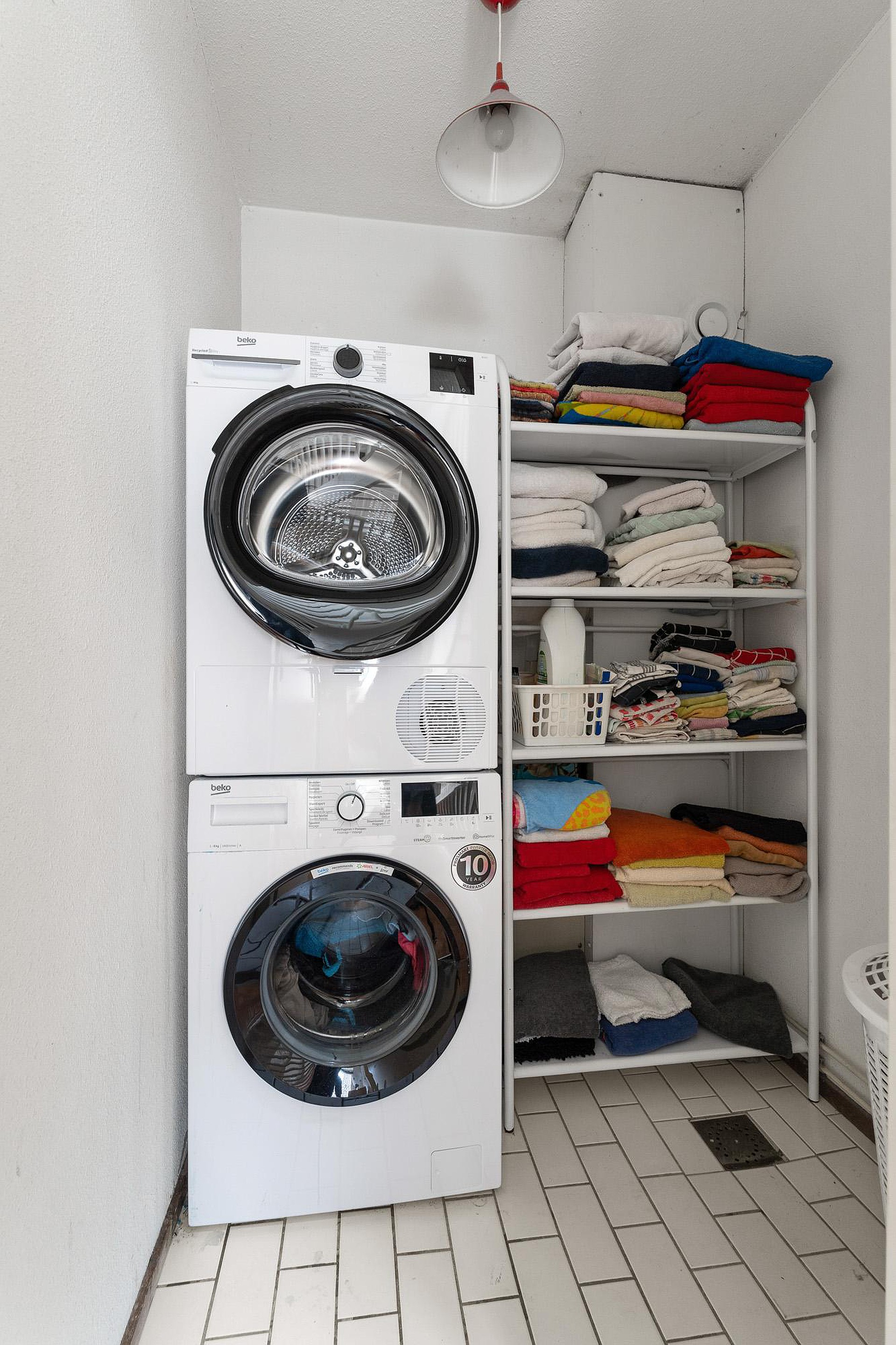 Eerste verdieping De ruime overloop geeft toegang tot drie royale slaapkamers, een aparte wasruimte met aansluitingen voor wasmachine en droger, en een volledig betegelde badkamer met inloopdouche, ligbad en wastafel. De slaapkamers zijn afgewerkt met laminaat, de natte ruimtes met tegels.