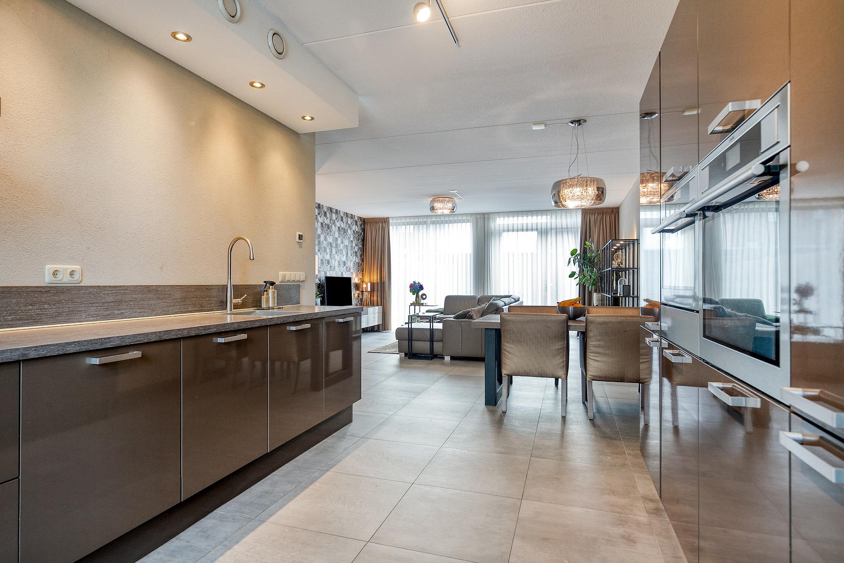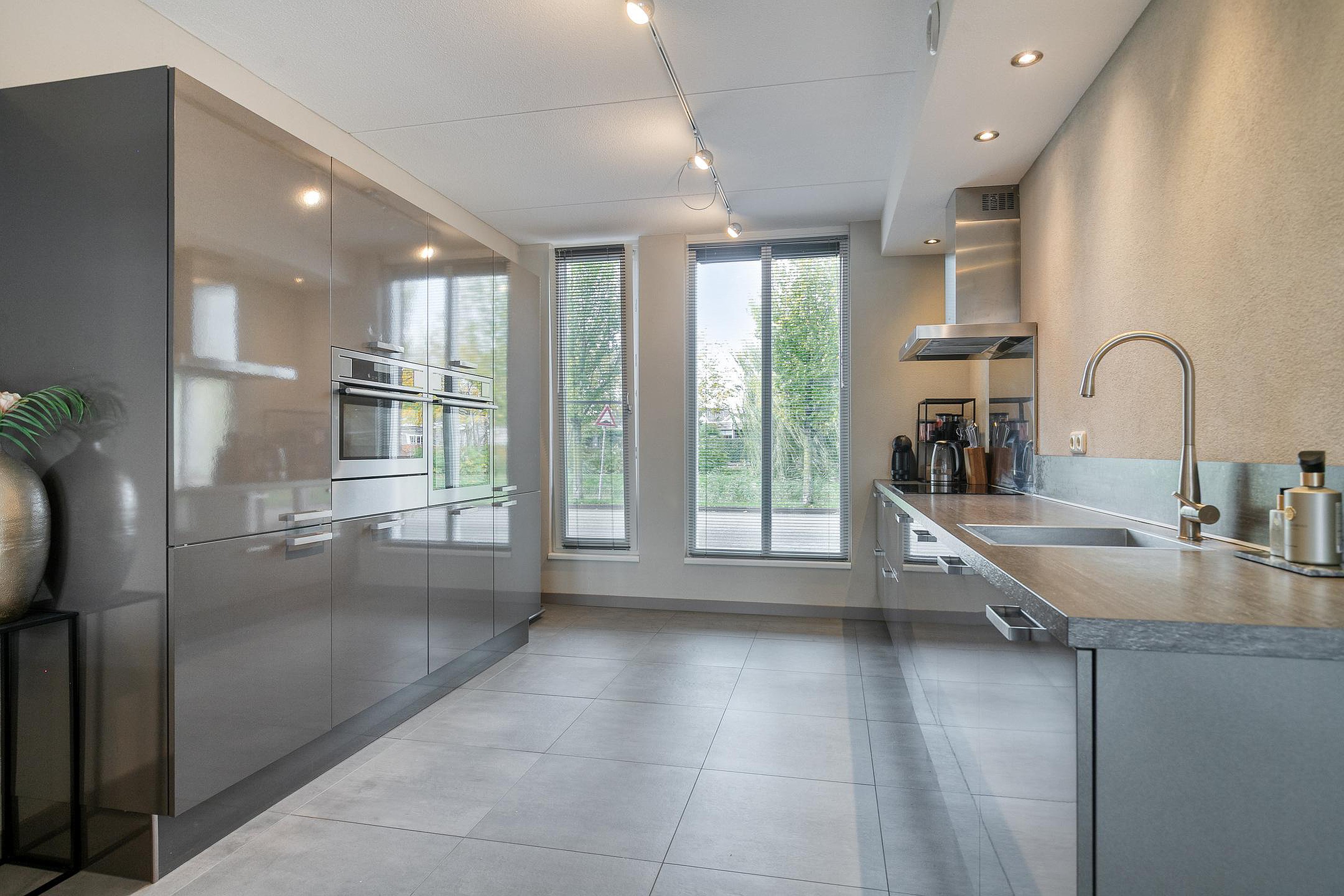 De keuken bevindt zich aan de voorzijde van de woning, met hoge ramen en fraai uitzicht richting het water. De keuken is praktisch ingedeeld en vormt een fijne plek om te koken. De opstelling en hoge kastenwand zijn uitgevoerd in een moderne stijl, met alle benodigde inbouwapparatuur: een inductie kookplaat, afzuigkap, vaatwasser, oven, combi en een koel/vries combinatie.