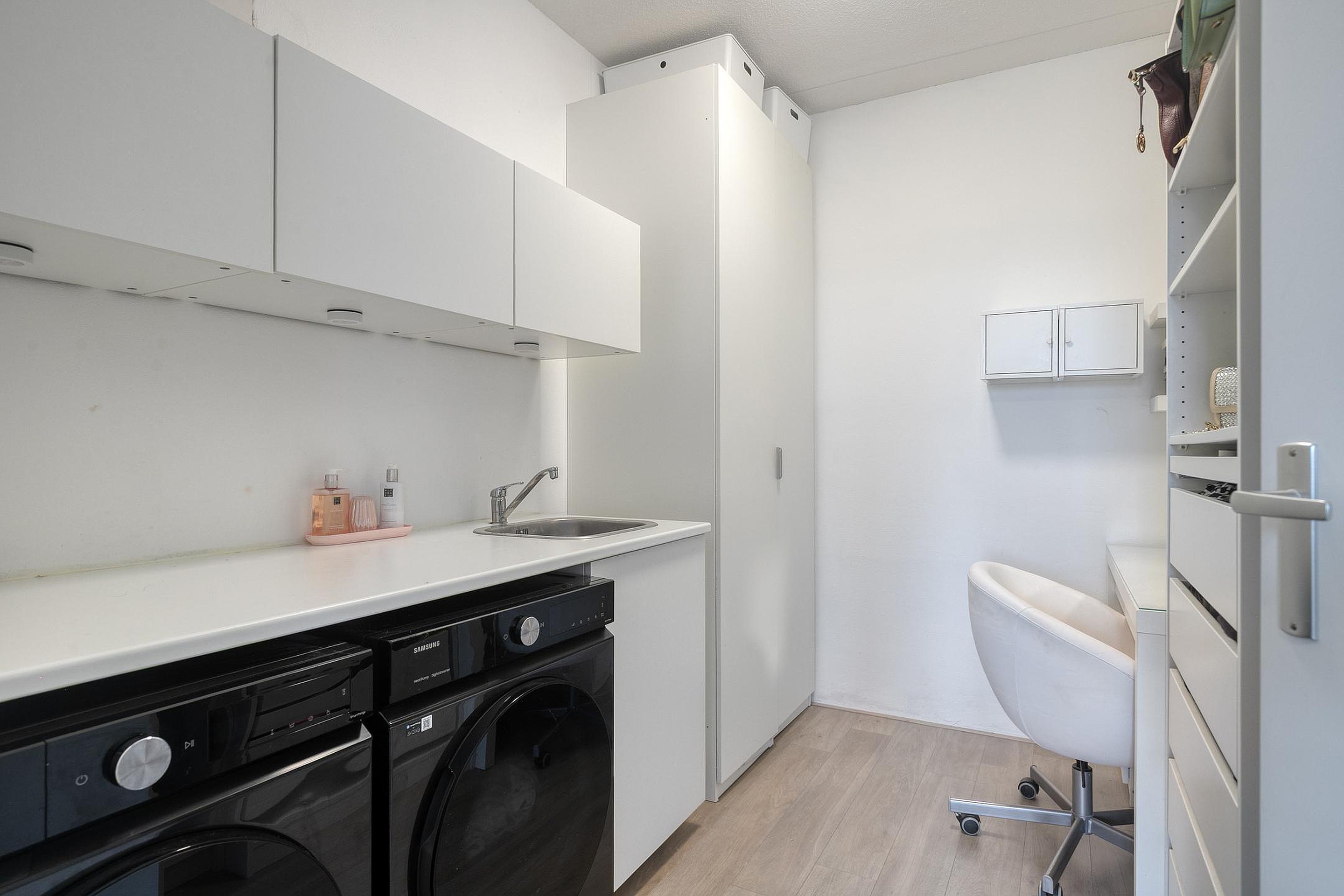 De tweede verdieping biedt nog meer leefruimte met een lichte overloop, een vierde slaapkamer met eigen walk-in-closet, een praktische wasruimte en toegang tot een ruim dakterras. Dit dakterras is perfect om te ontspannen en te genieten van de zon.