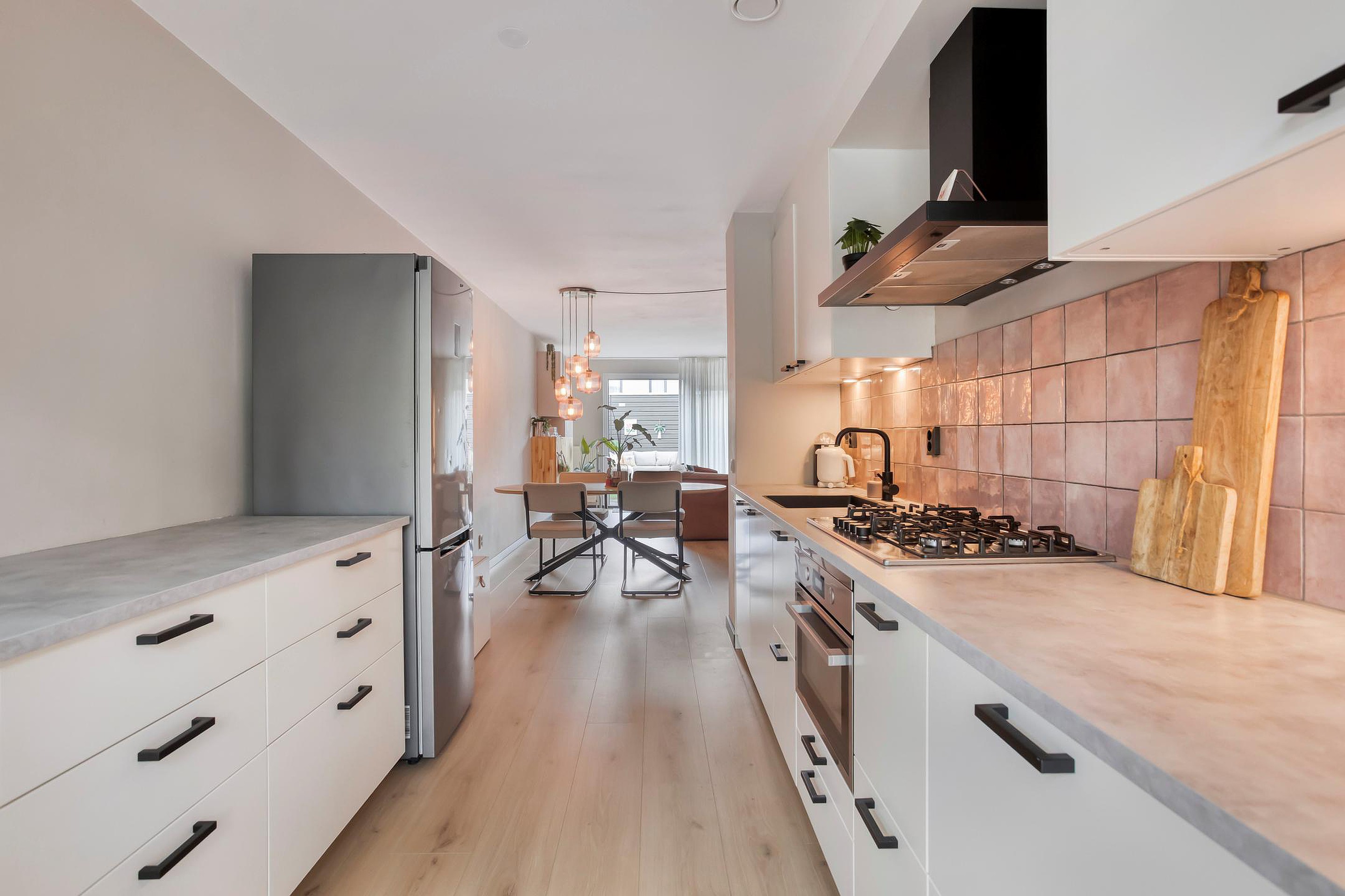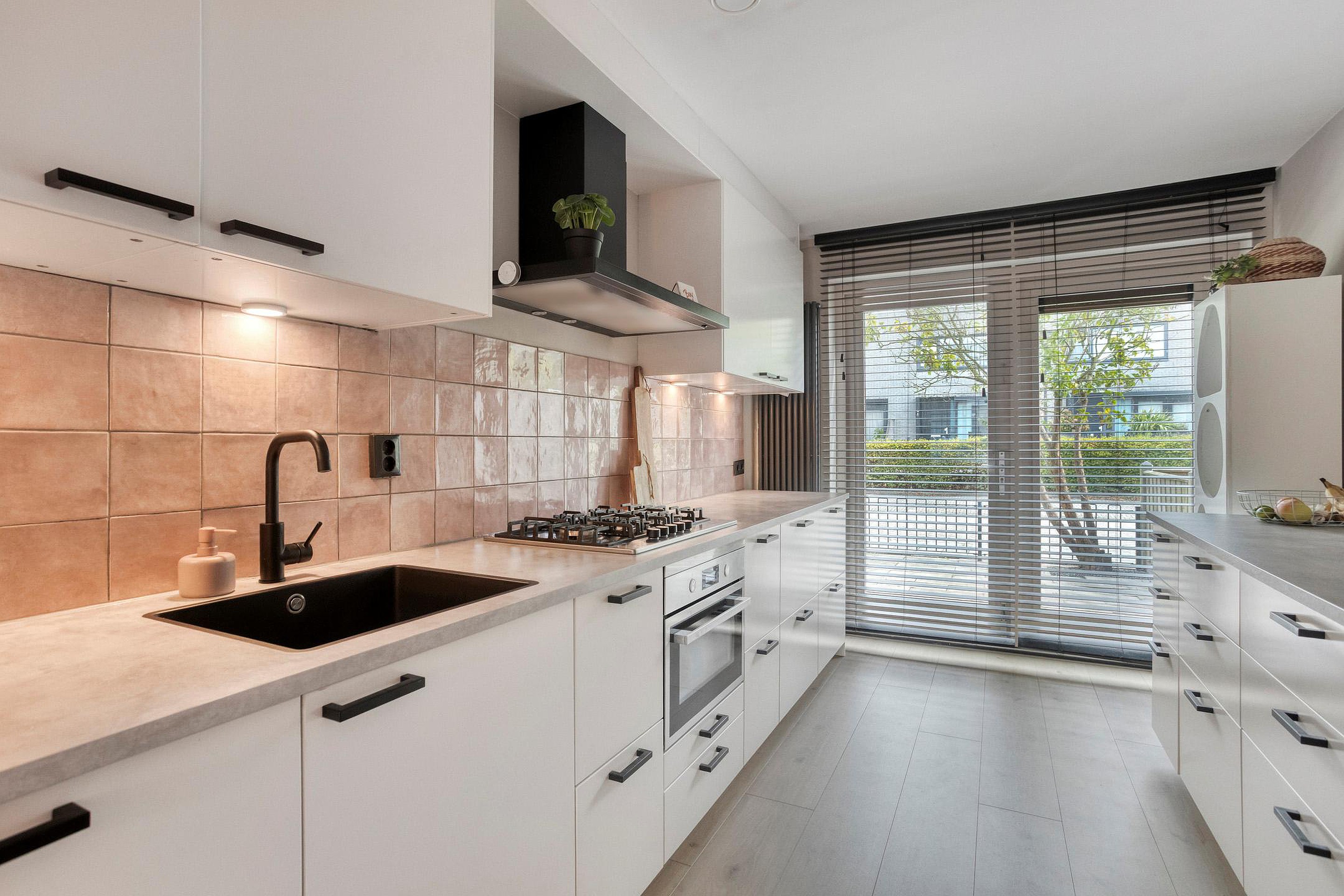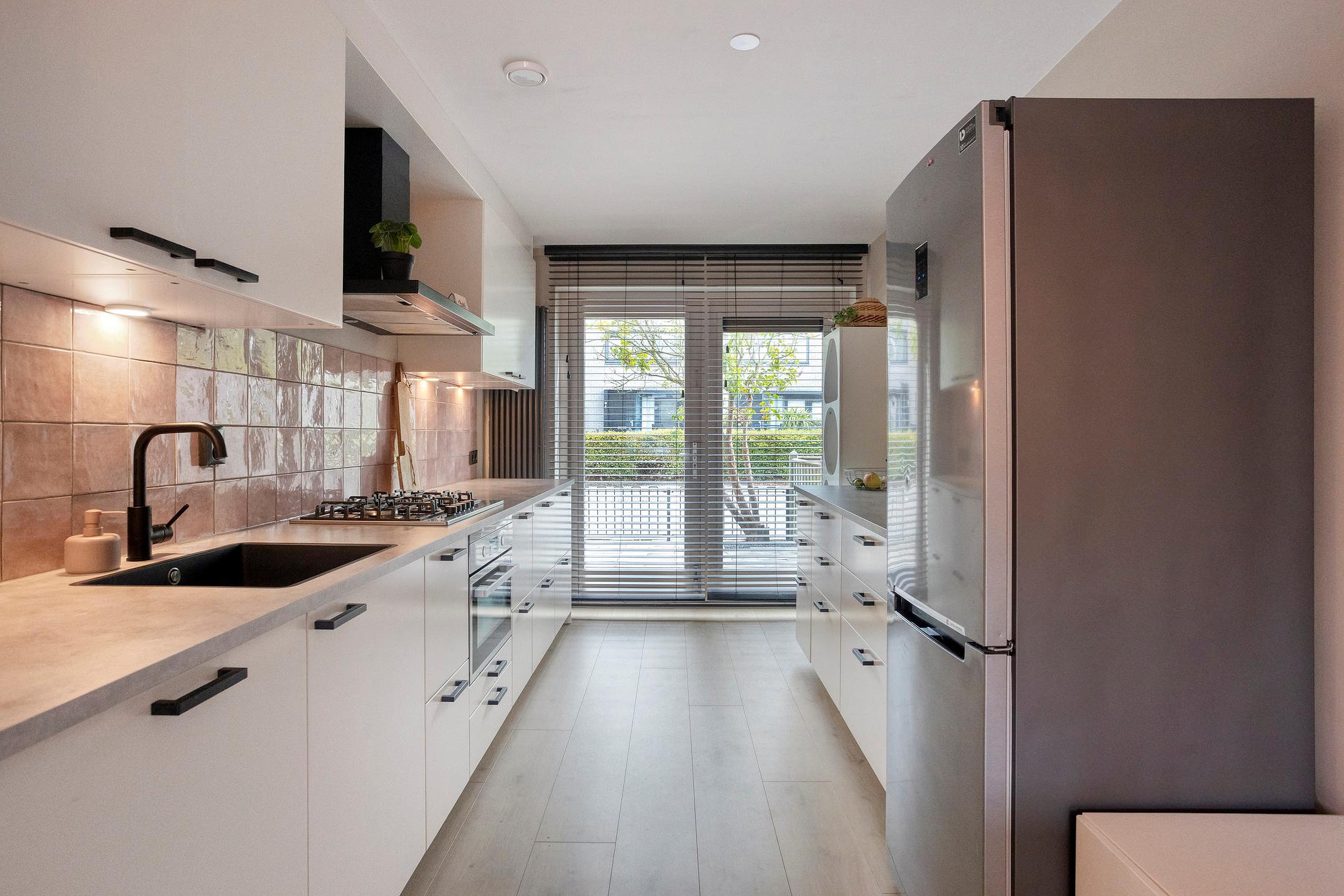 De keuken, geplaatst in 2023, vind je aan de voorzijde van de woning. Met de openslaande deuren heb je toegang tot de voortuin. De moderne keuken is praktisch en compleet, met een losse koelkast, 5-pits kookplaat, afzuigkap, vaatwasser en combi-oven. De gehele benedenverdieping is voorzien van een nette laminaatvloer.