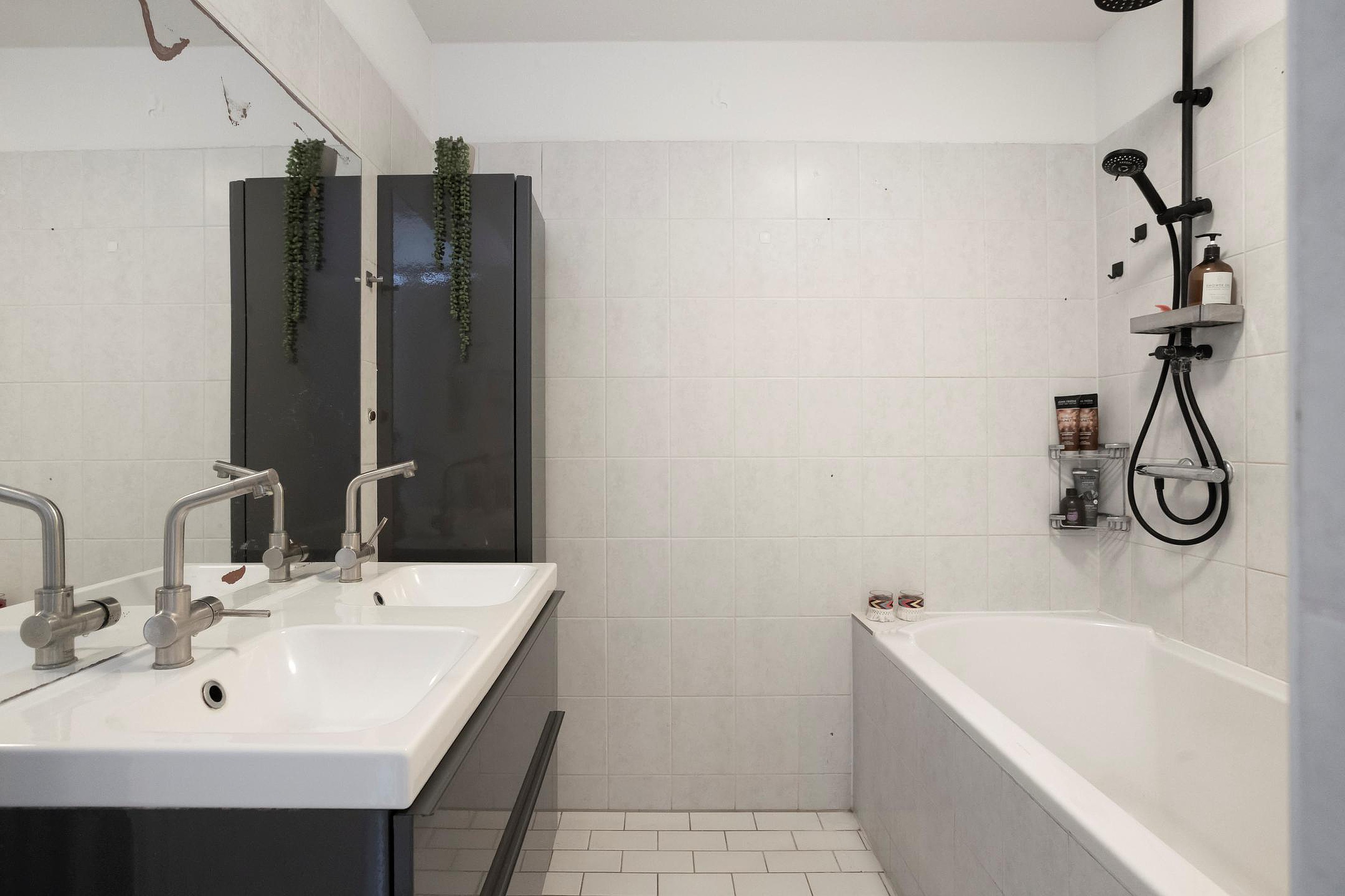De badkamer is betegeld en uitgerust met een bad/douchecombinatie, een dubbel wastafelmeubel, een extra kast voor opbergruimte en er is een aansluiting voor het plaatsen van een toilet aanwezig.