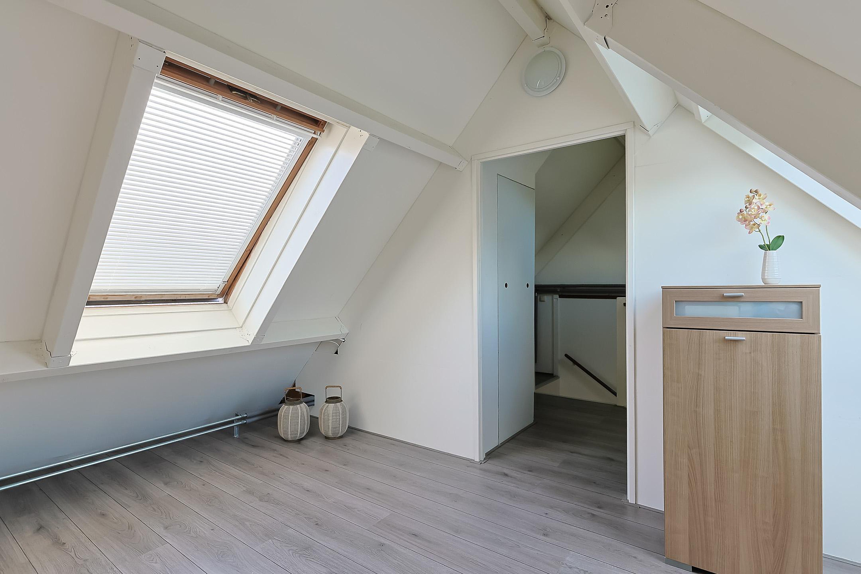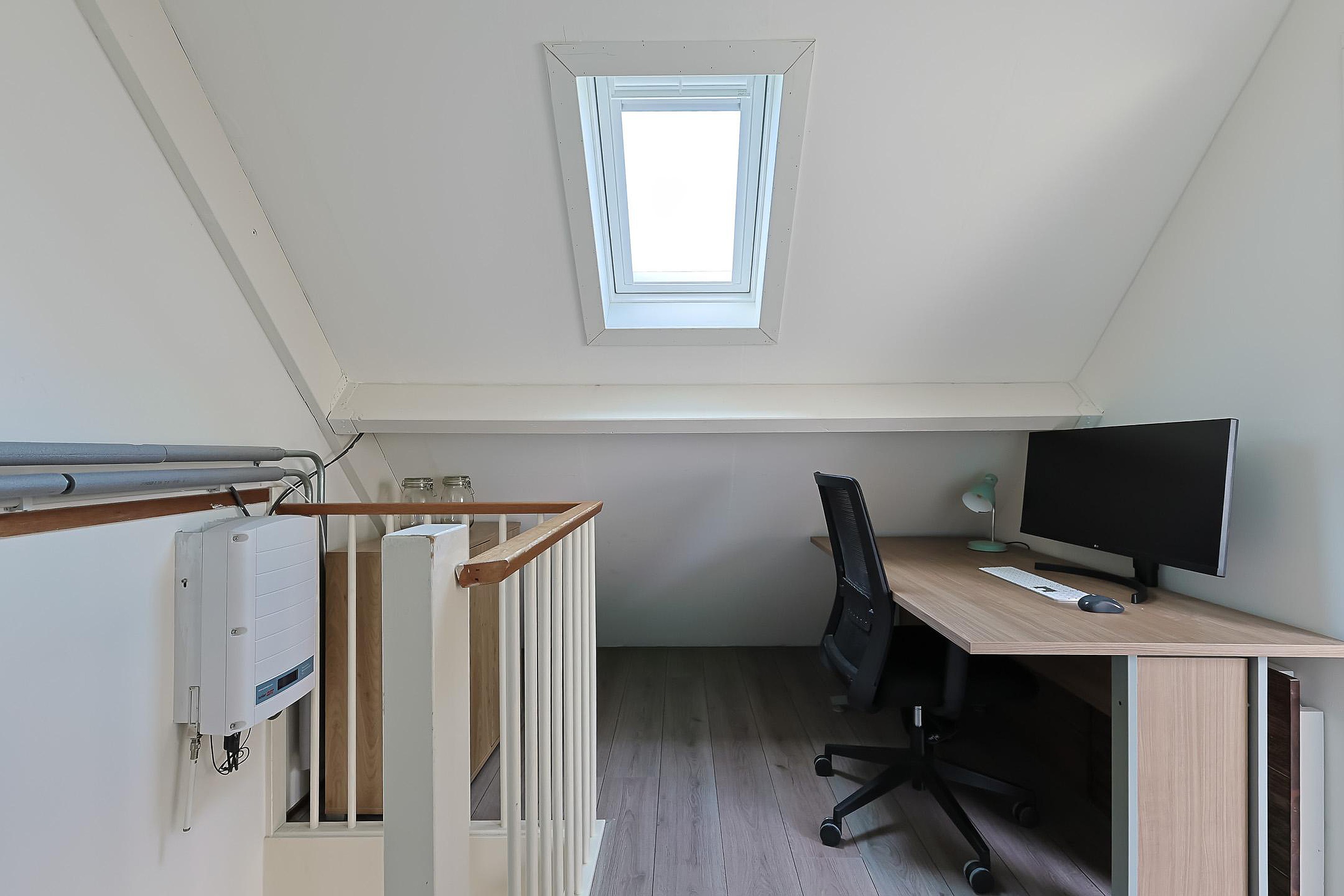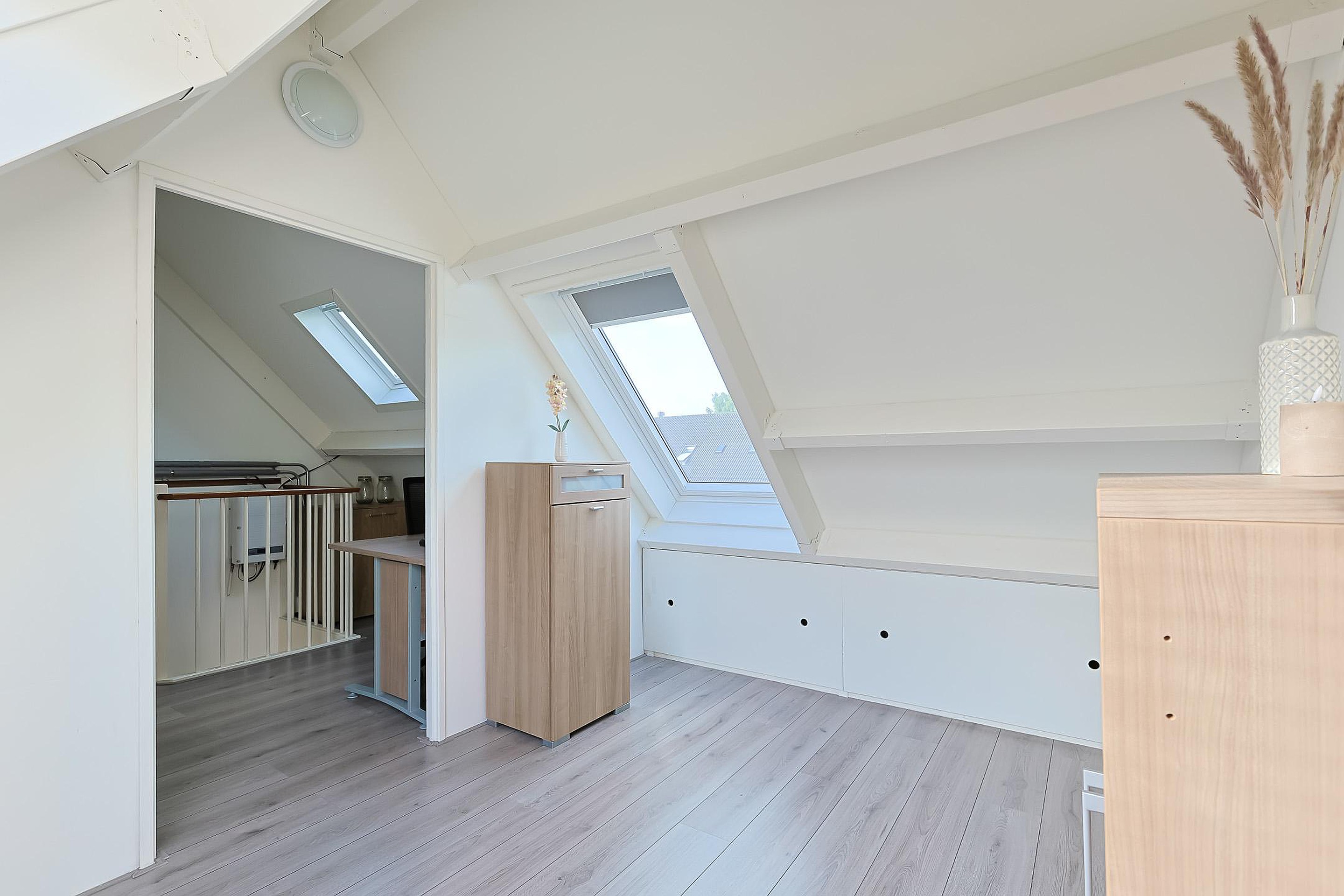 De zolderverdieping is slim ingedeeld met een werkruimte op de overloop en een vierde slaapkamer. Daarnaast vindt u hier de cv-installatie, wasmachineaansluiting en drie dakramen die zorgen voor veel daglicht.