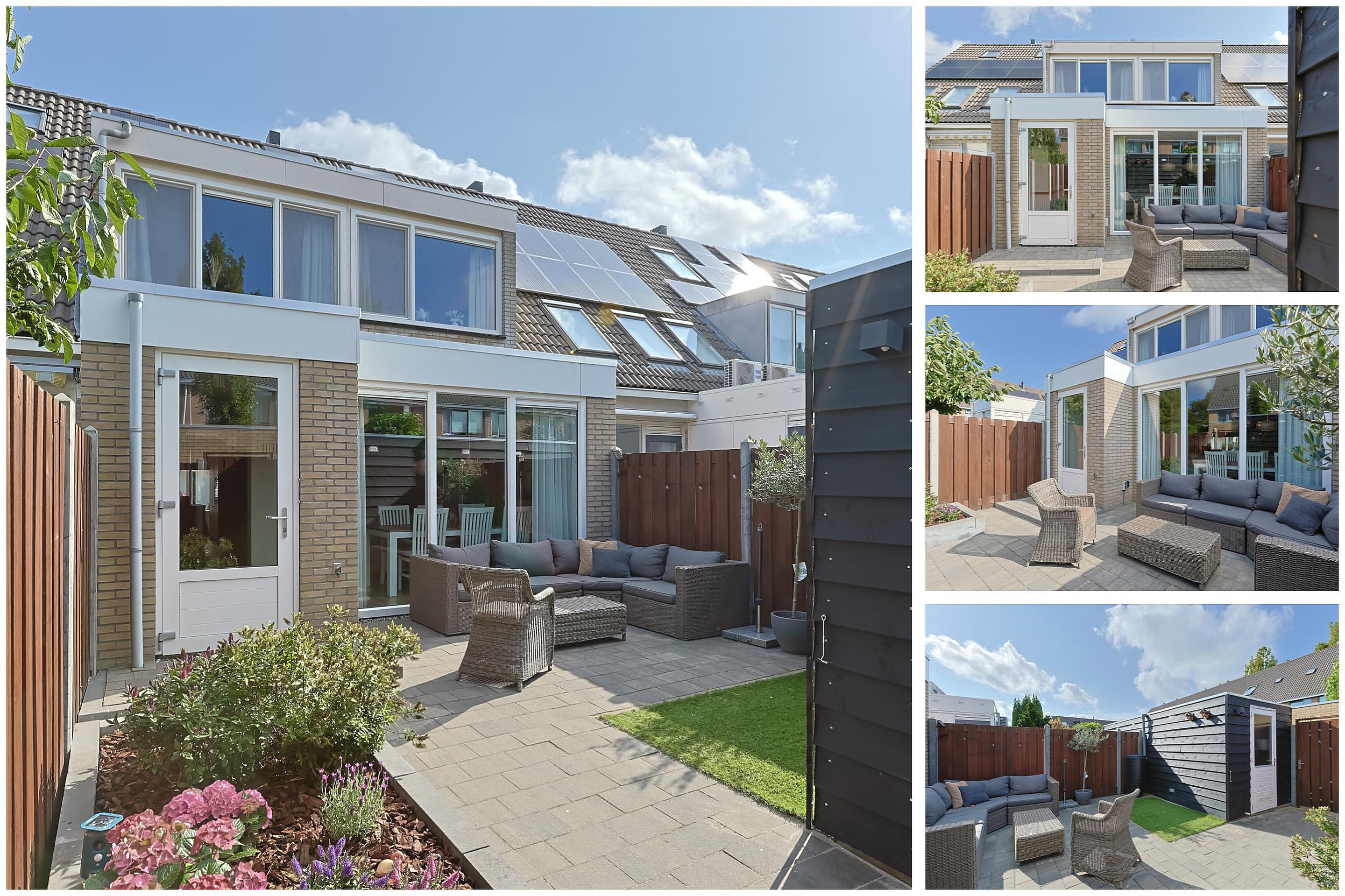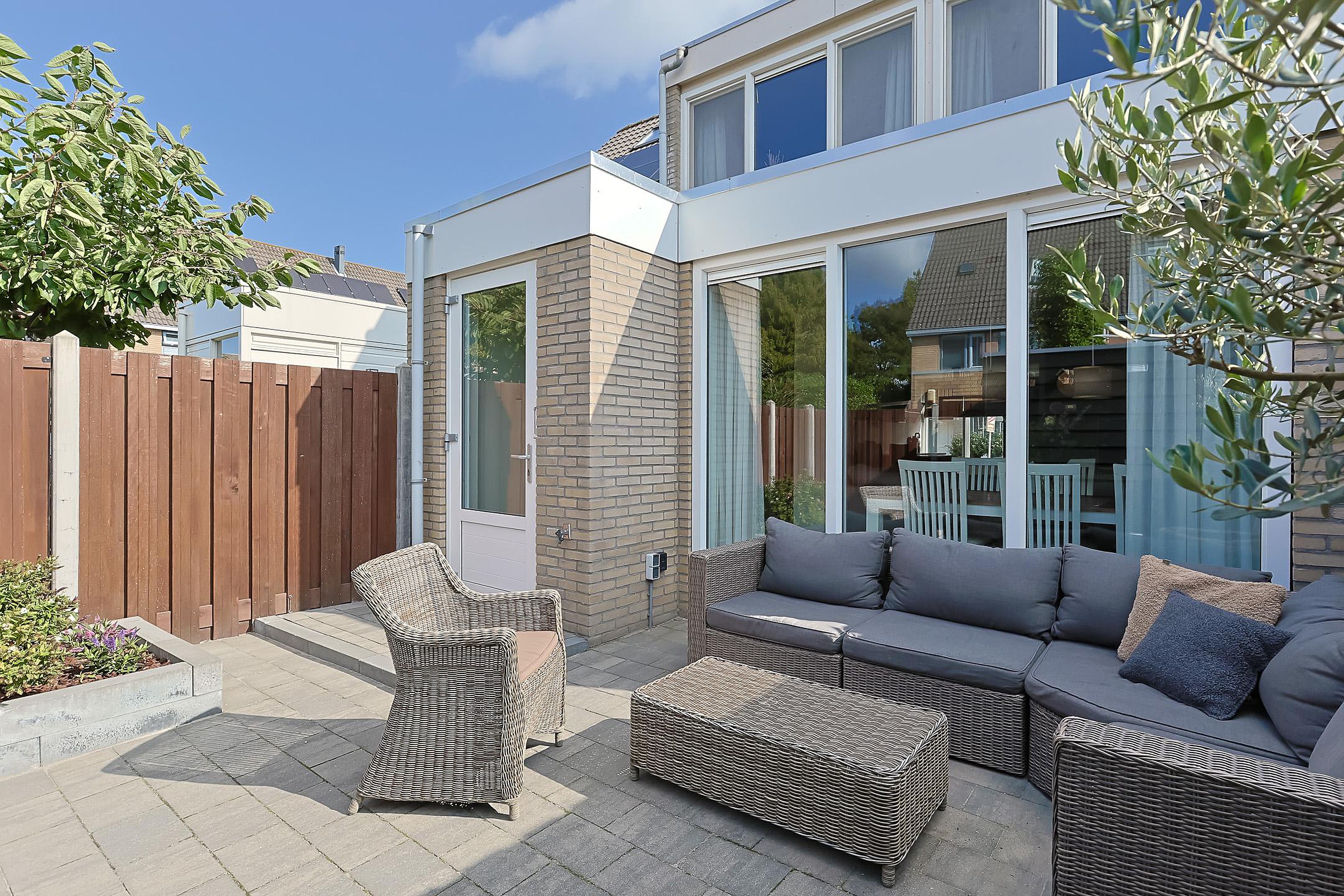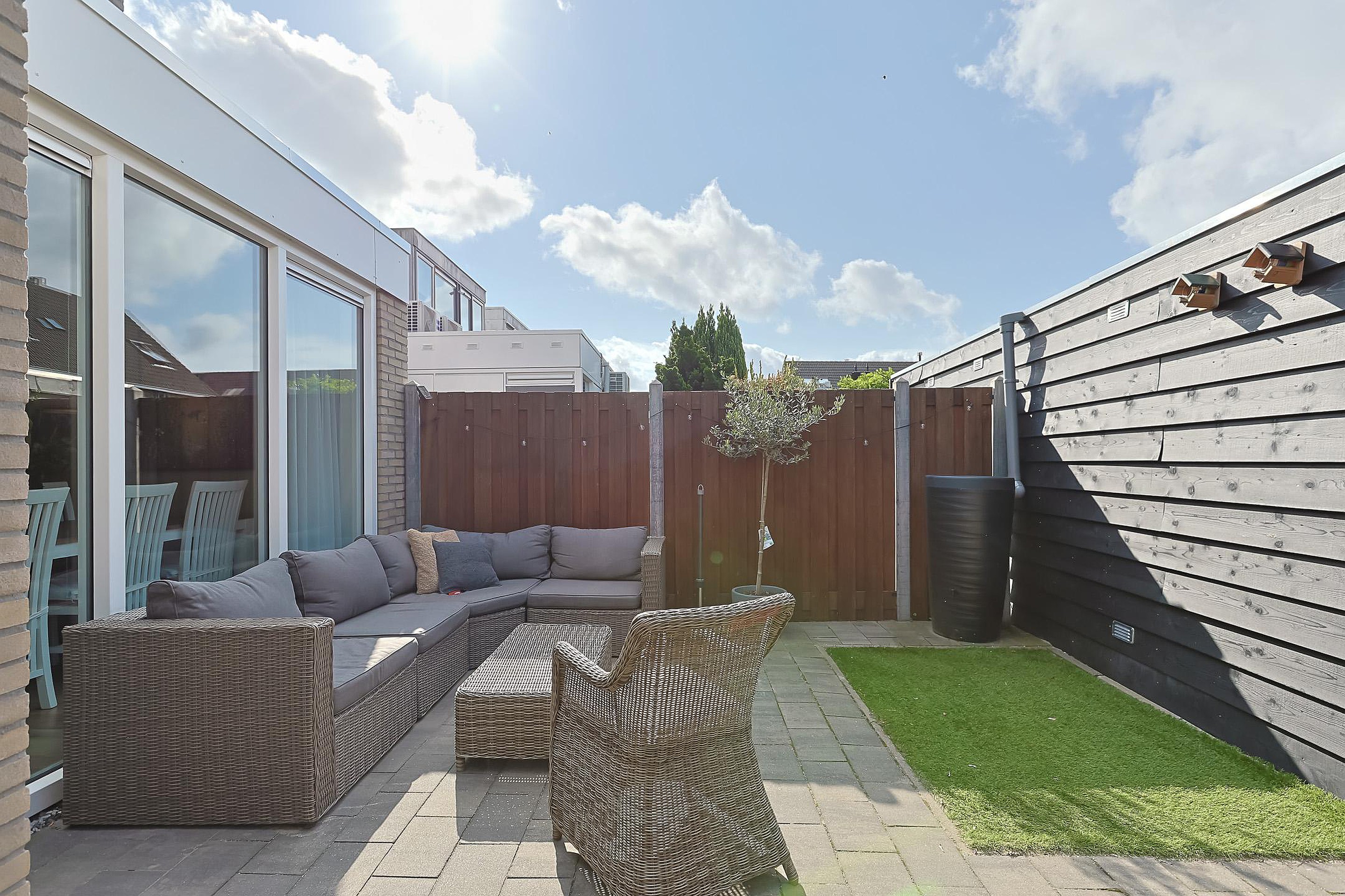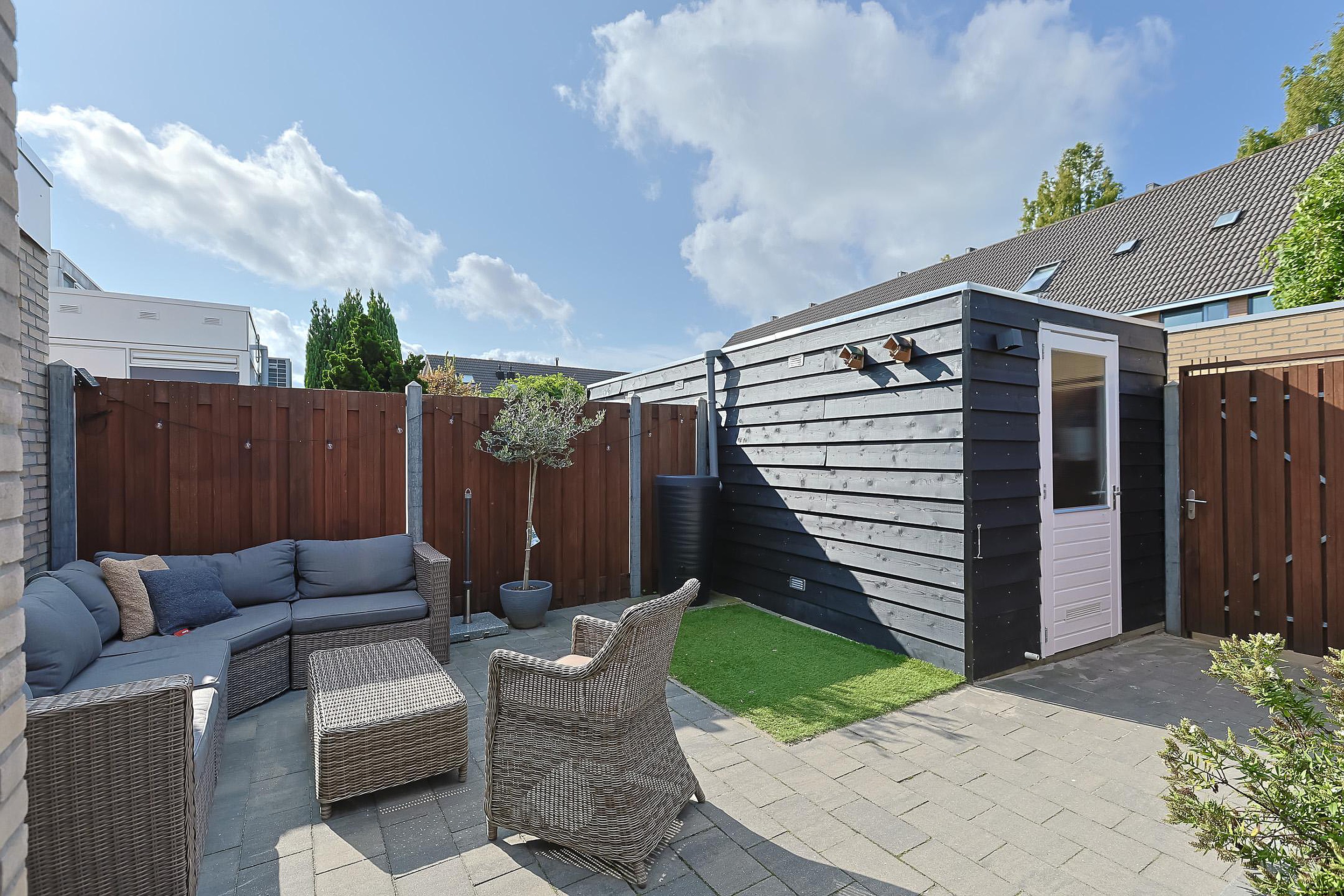 De fraai aangelegde achtertuin is diep, zonnig en gelegen op het zuidwesten. In 2022 is er een nieuwe berging geplaatst, ideaal voor fietsen en tuinspullen.