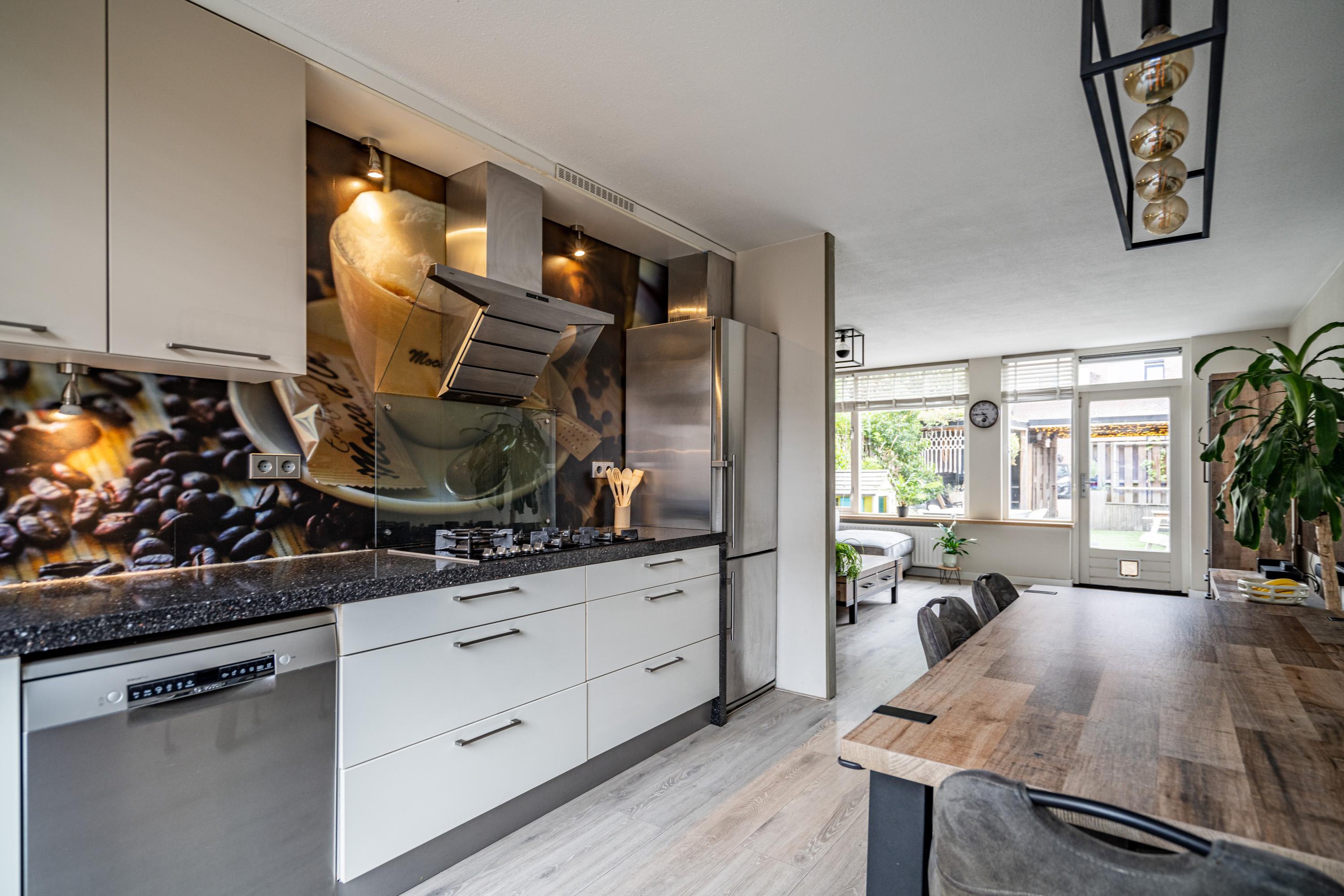Via de hal met garderoberuimte betreedt u de lichte woonkamer, waar het royale vloeroppervlak en het uitzicht op de tuin direct in het oog springen. De open keuken aan de voorzijde is voorzien van een 4-pits fornuis, afzuigkap, vaatwasser, combi magnetron en volop bergruimte. Vanuit de keuken en woonkamer heeft u toegang tot de zonnige achtertuin die gelegen is op het zuiden met meerdere zithoeken en een praktische berging door de overkapping en schuur.