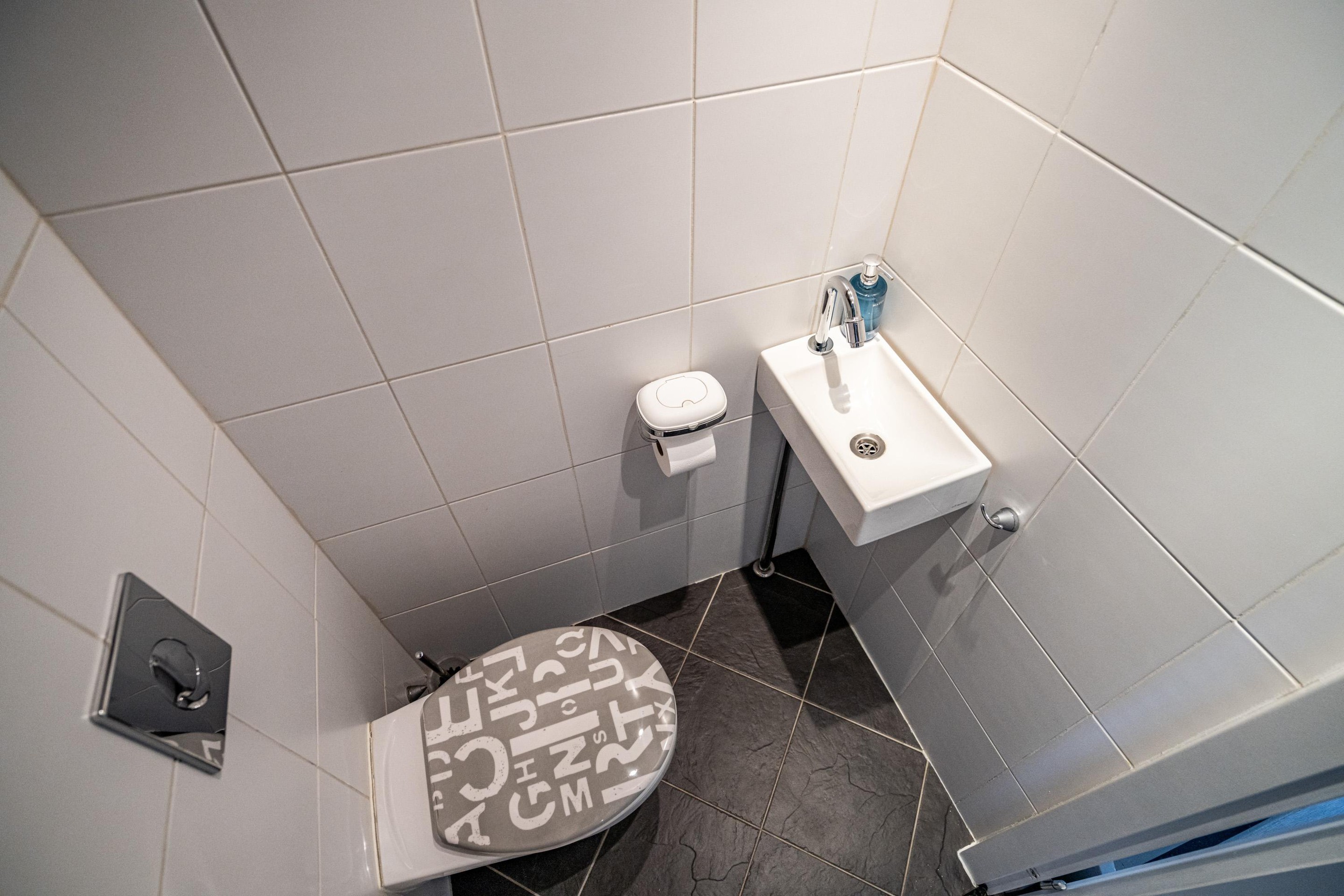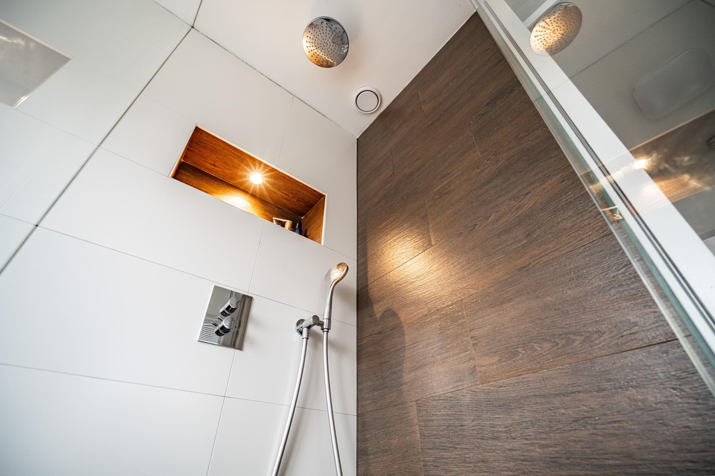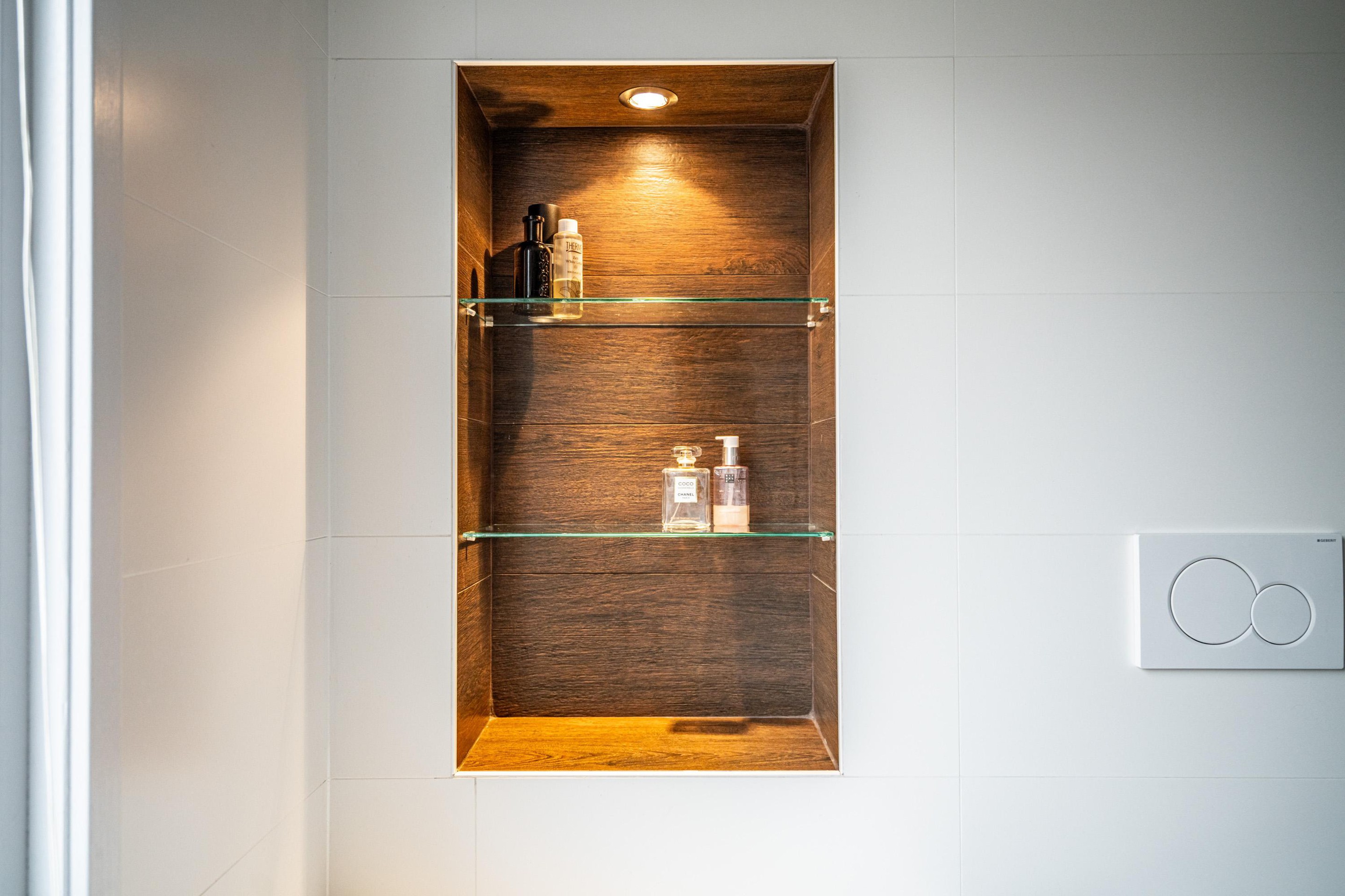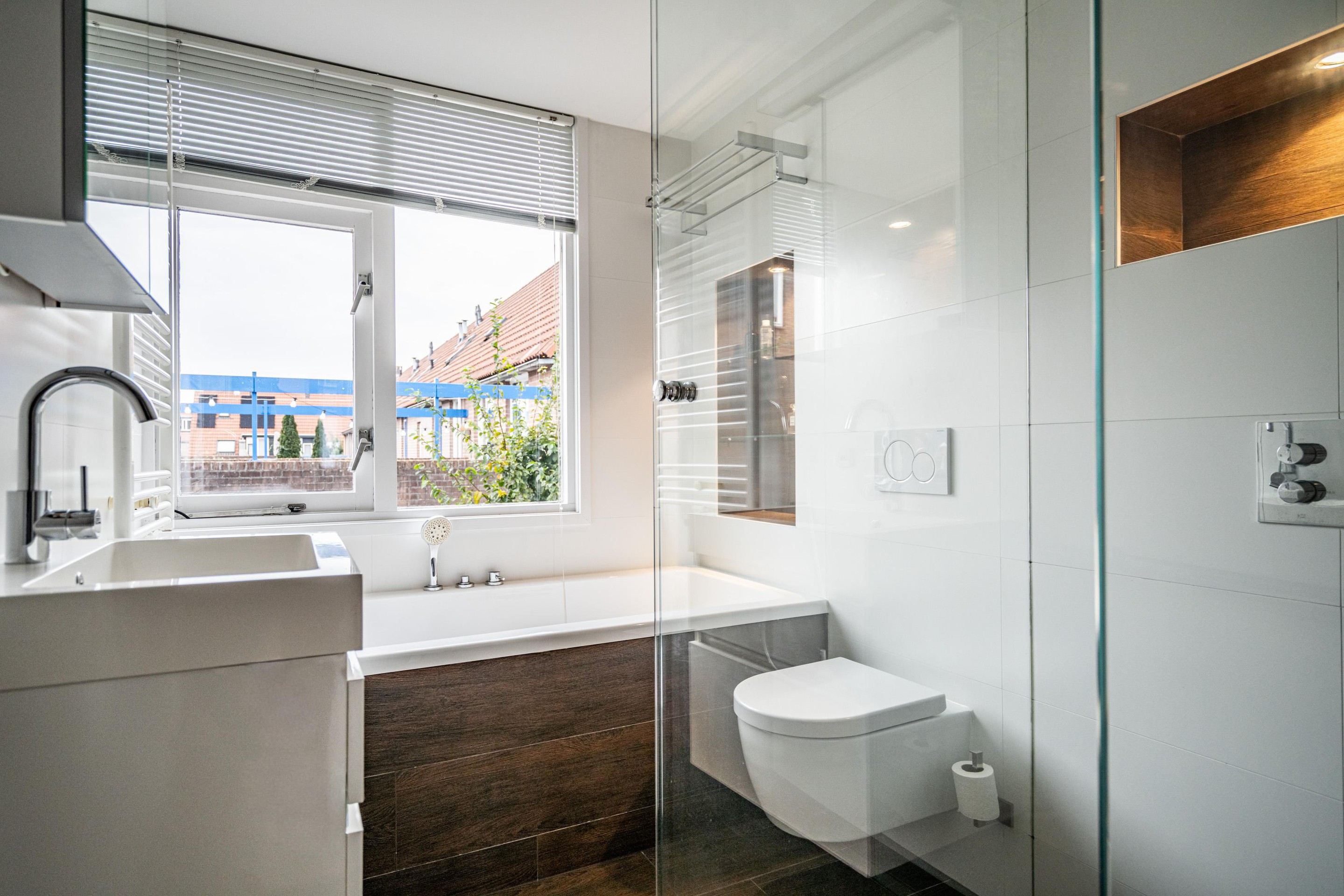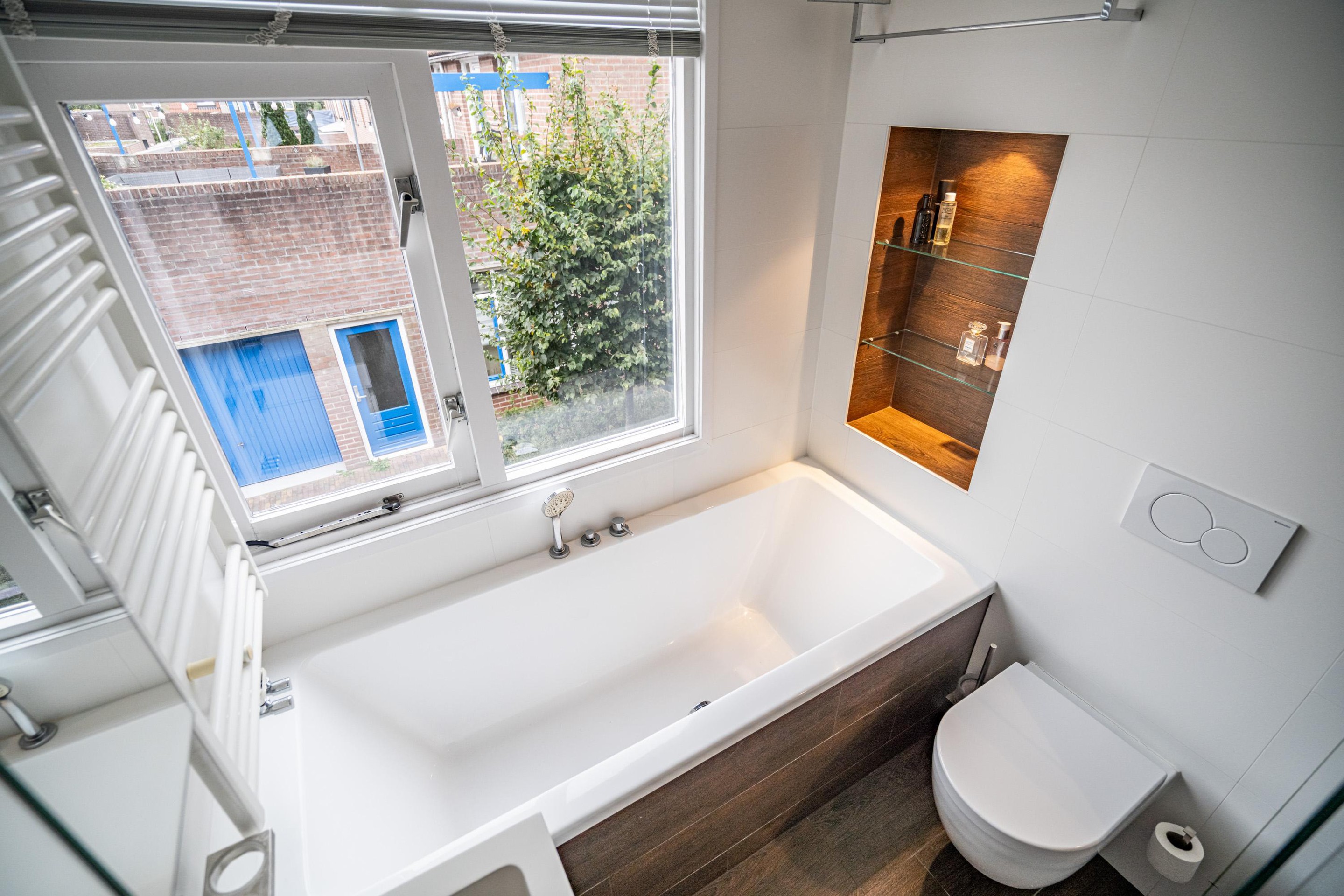 De moderne badkamer heeft een luxe uitstraling dankzij de mooie tegels en ingebouwde nissen. U vindt hier een hangend toilet, ligbad, douche met hand- en regendouche kraan, designradiator en een wastafelmeubel. De ruimte is uitstekend te ventileren via het draai-/kiepraam en het mechanische ventilatiesysteem. Wat tevens ook veel licht geeft in deze ruimte.
