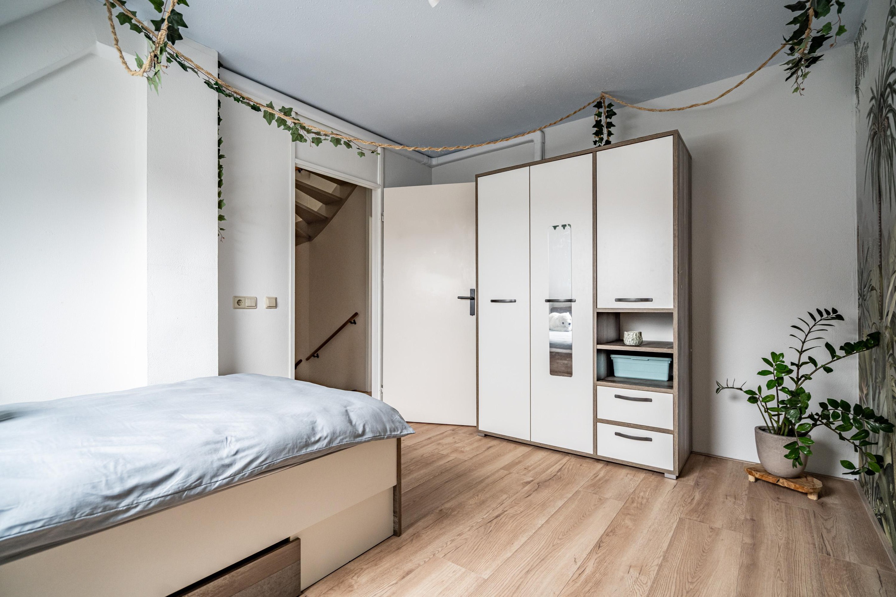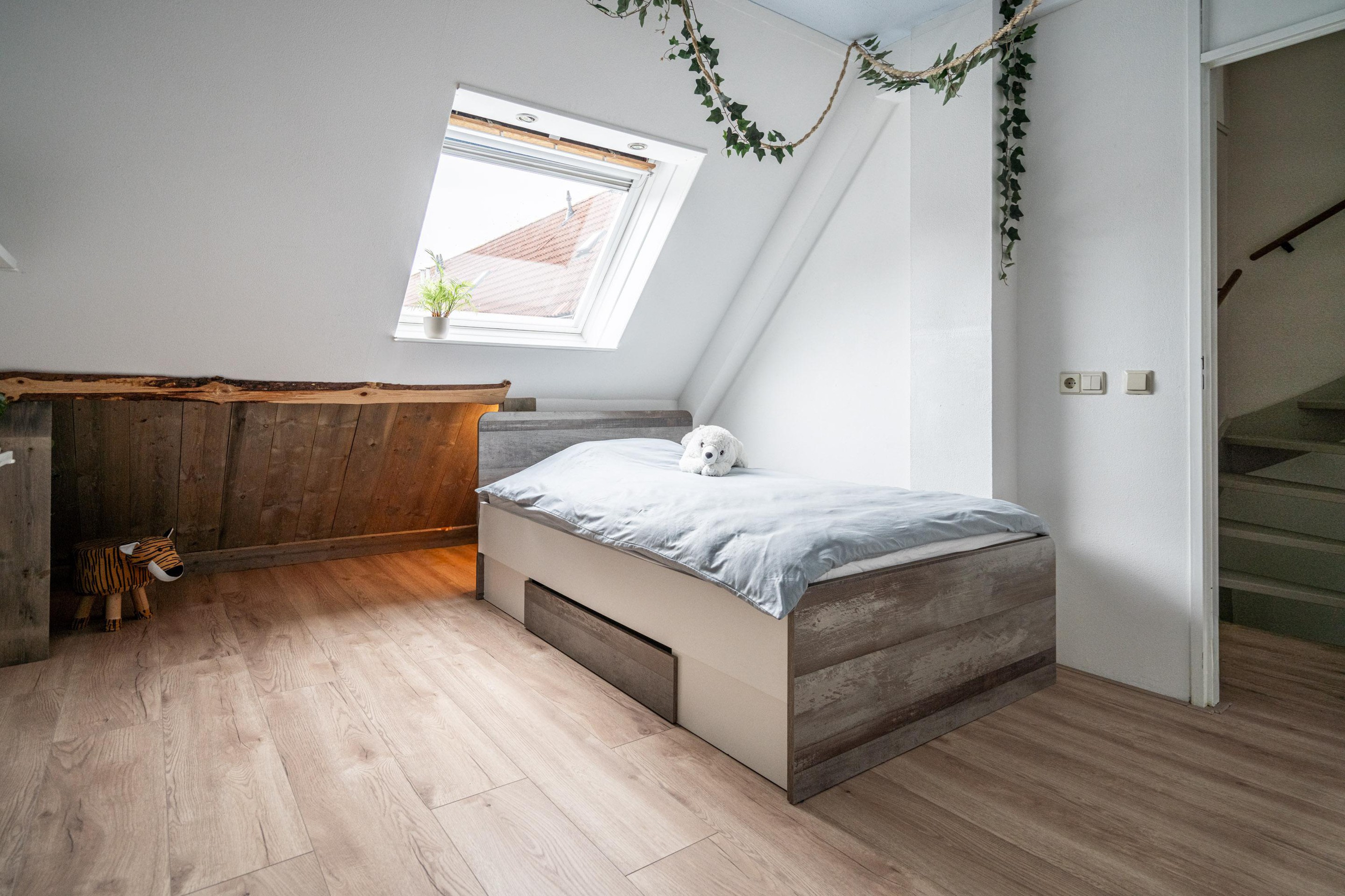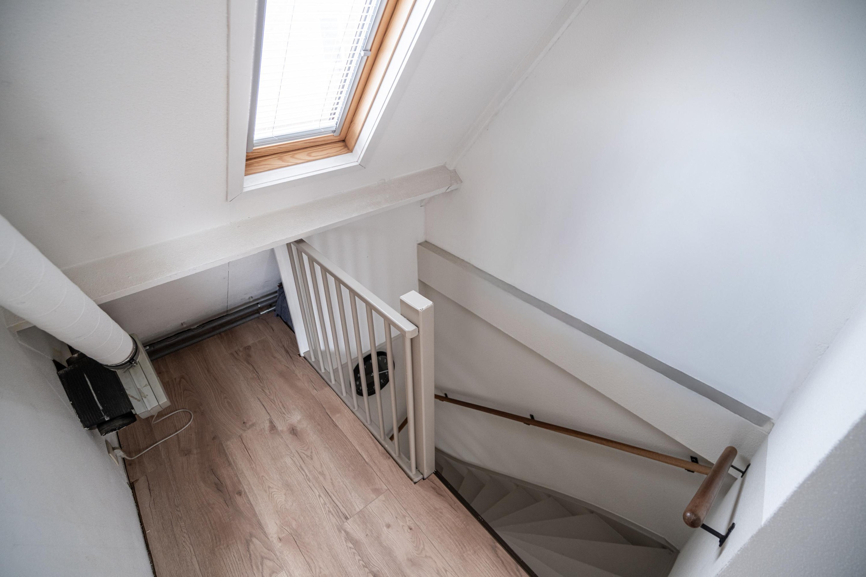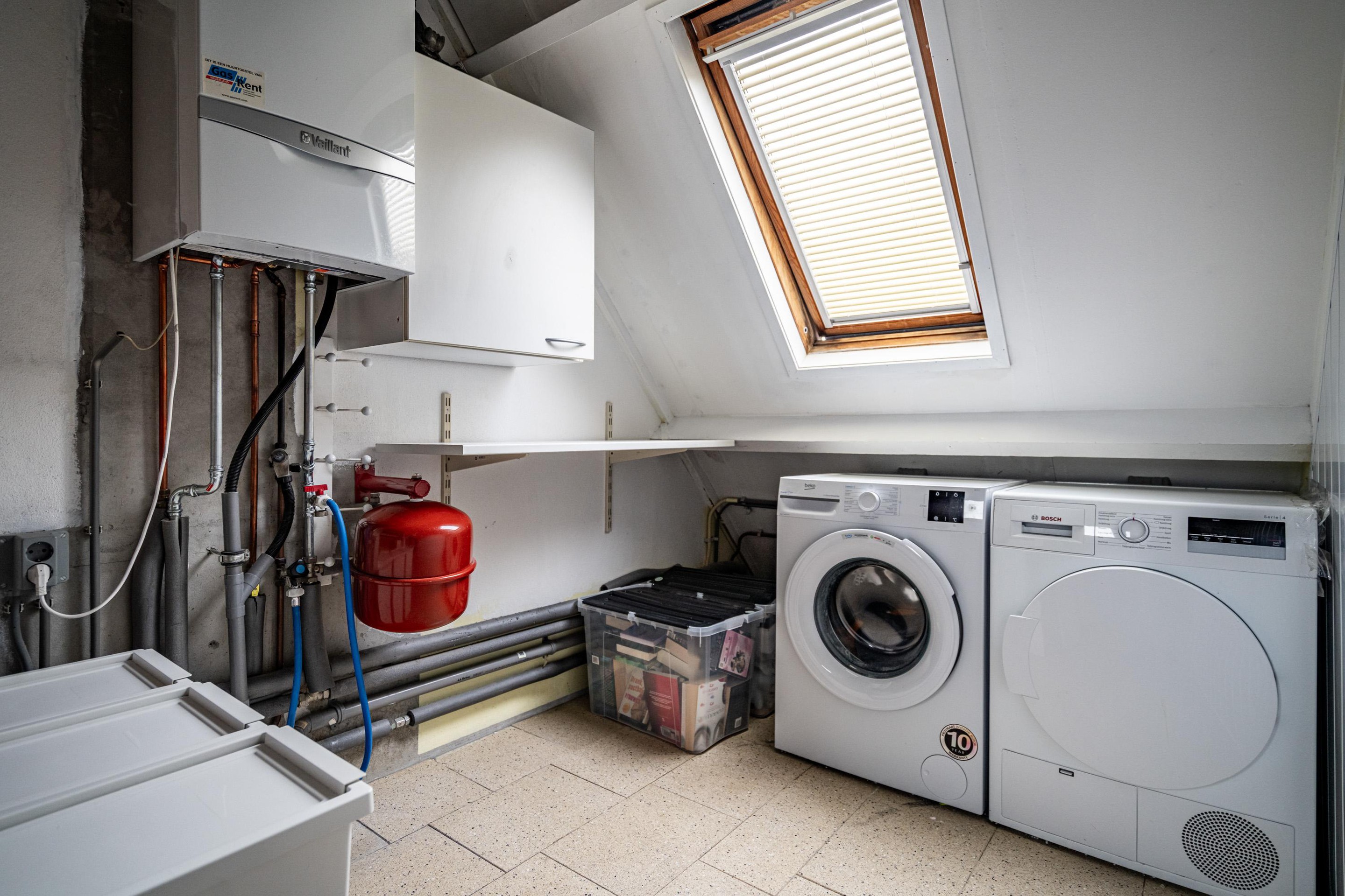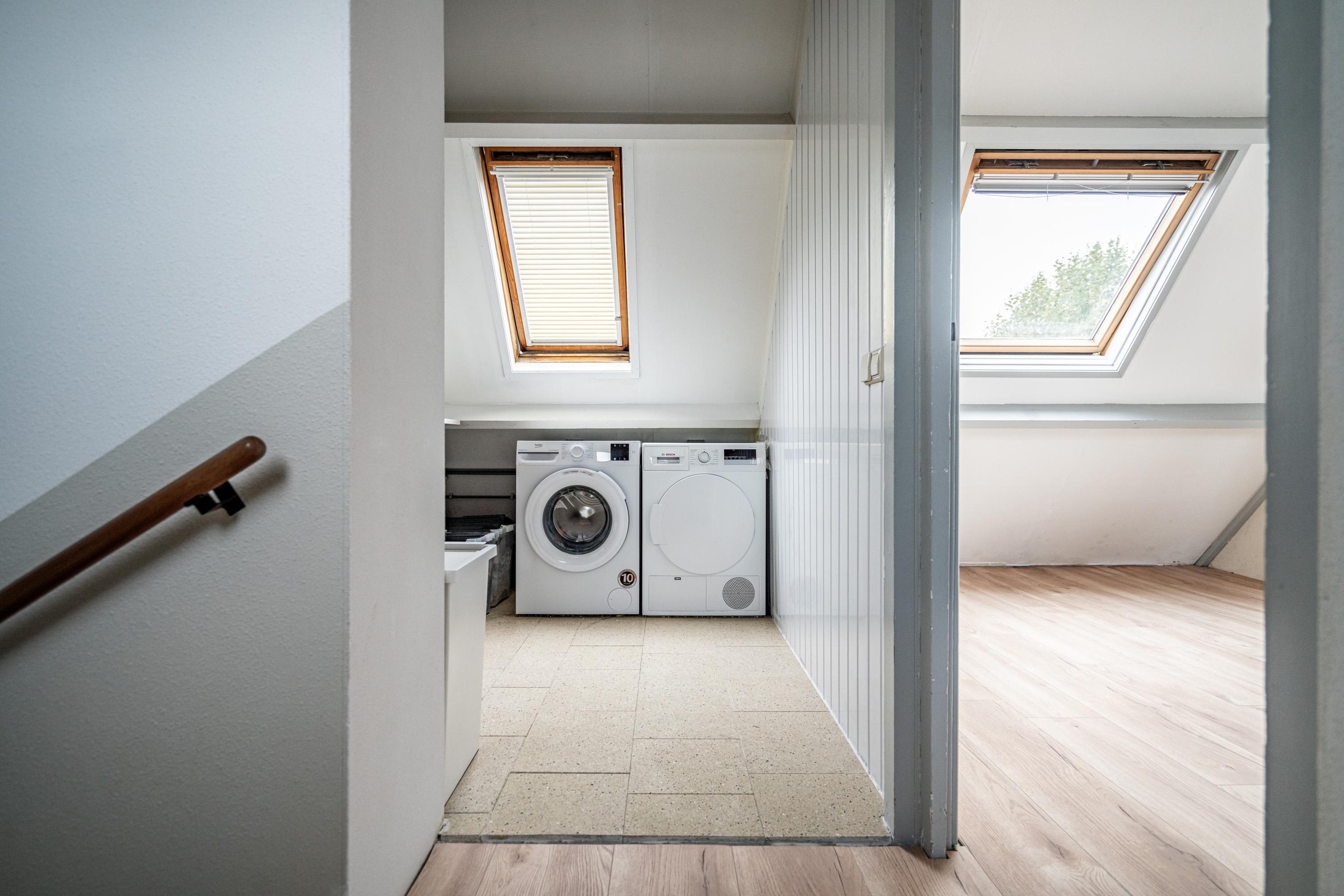 Via de vaste trap bereikt u de tweede verdieping met een ruime overloop. Hier bevinden zich de aansluitingen voor wasmachine en droger, evenals de cv-installatie. De derde slaapkamer is ruim en licht dankzij meerdere dakramen, wat de verdieping een prettige, open sfeer geeft.