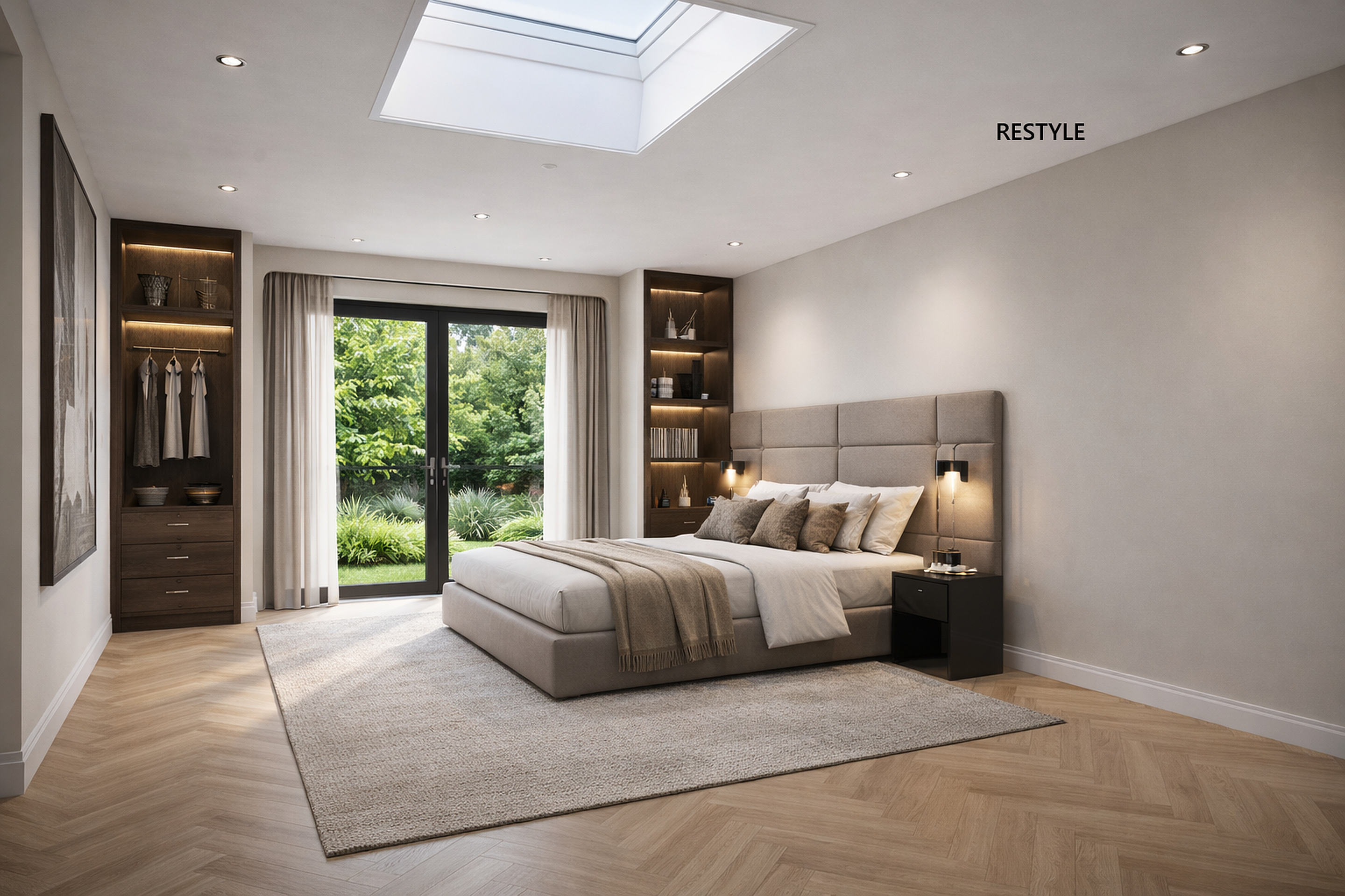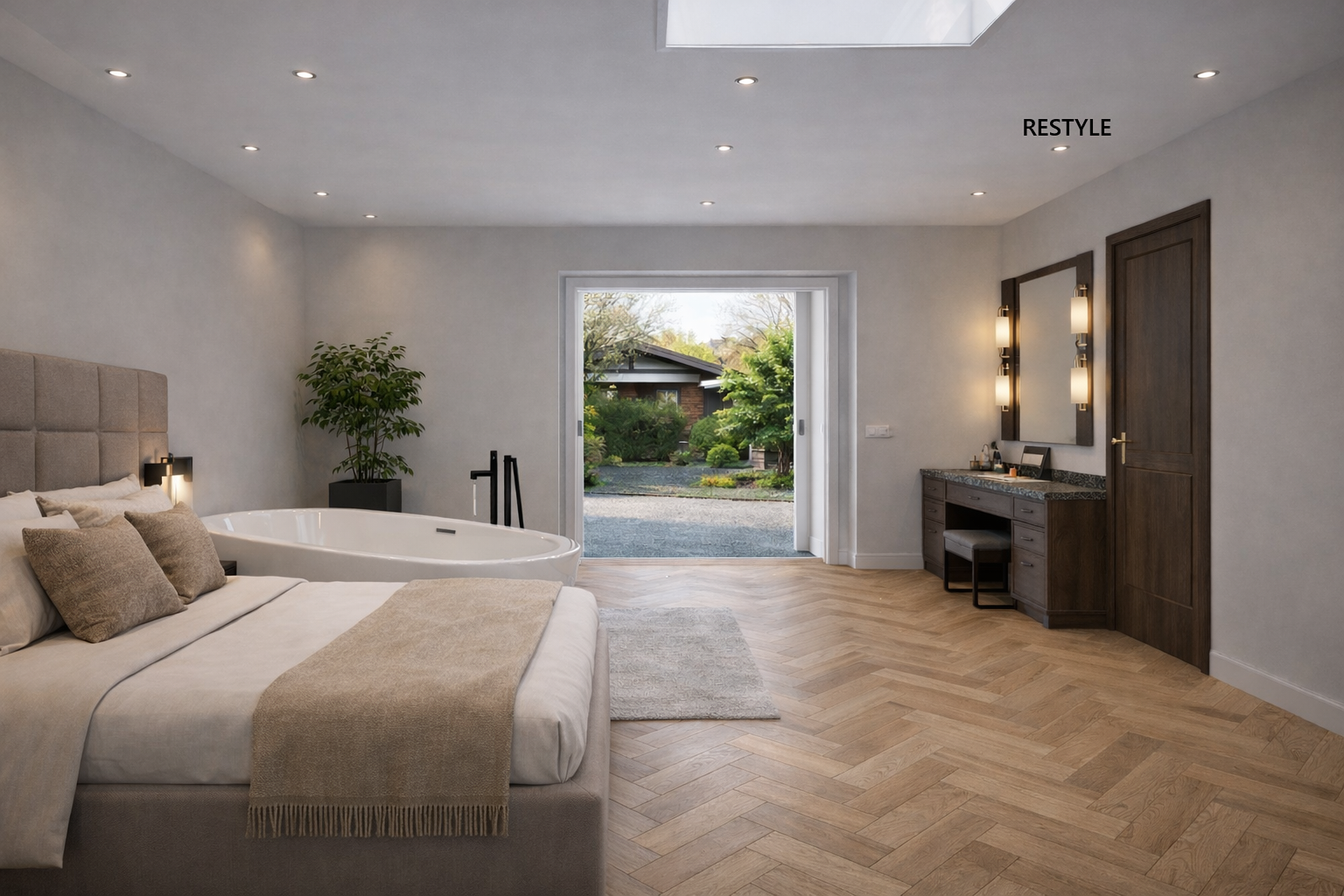 De woonkamer aan de voorzijde is licht en ruim, met een grote raampartij en strak gestuukte wanden. In het verlengde ligt de eetkamer met openslaande deuren naar het terras, en een heerlijke haard die de ruimte verwarmd. De moderne keuken is voorzien van een groot kookeiland met ontbijtbar en luxe inbouwapparatuur, zoals een inductiekookplaat, plafondafzuiging, combi-oven, koffiemachine, koelkast en vaatwasser. Achter de keuken ligt de bijkeuken met praktische kastenwand, de witgoedaansluitingen en een vlizotrap richting een bergzolder.