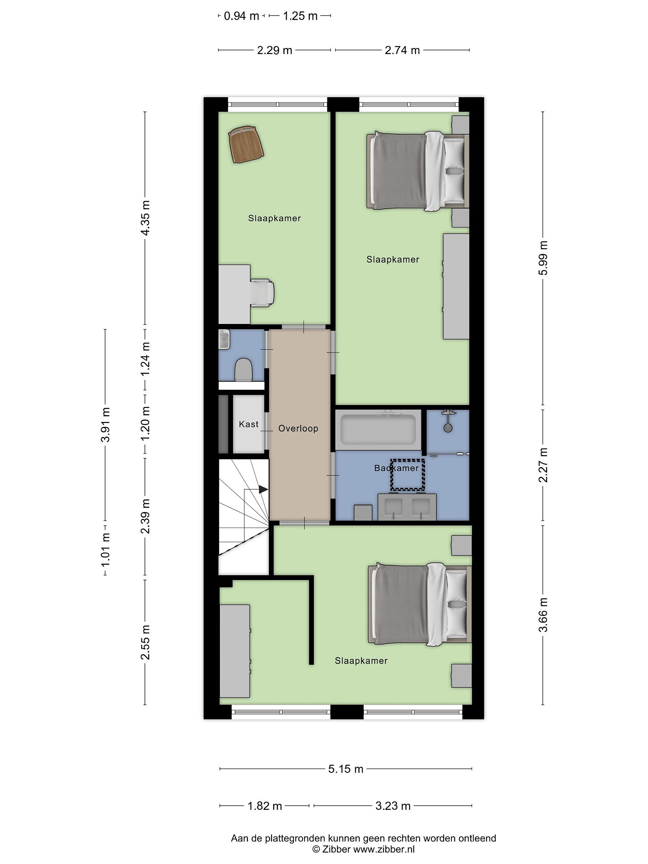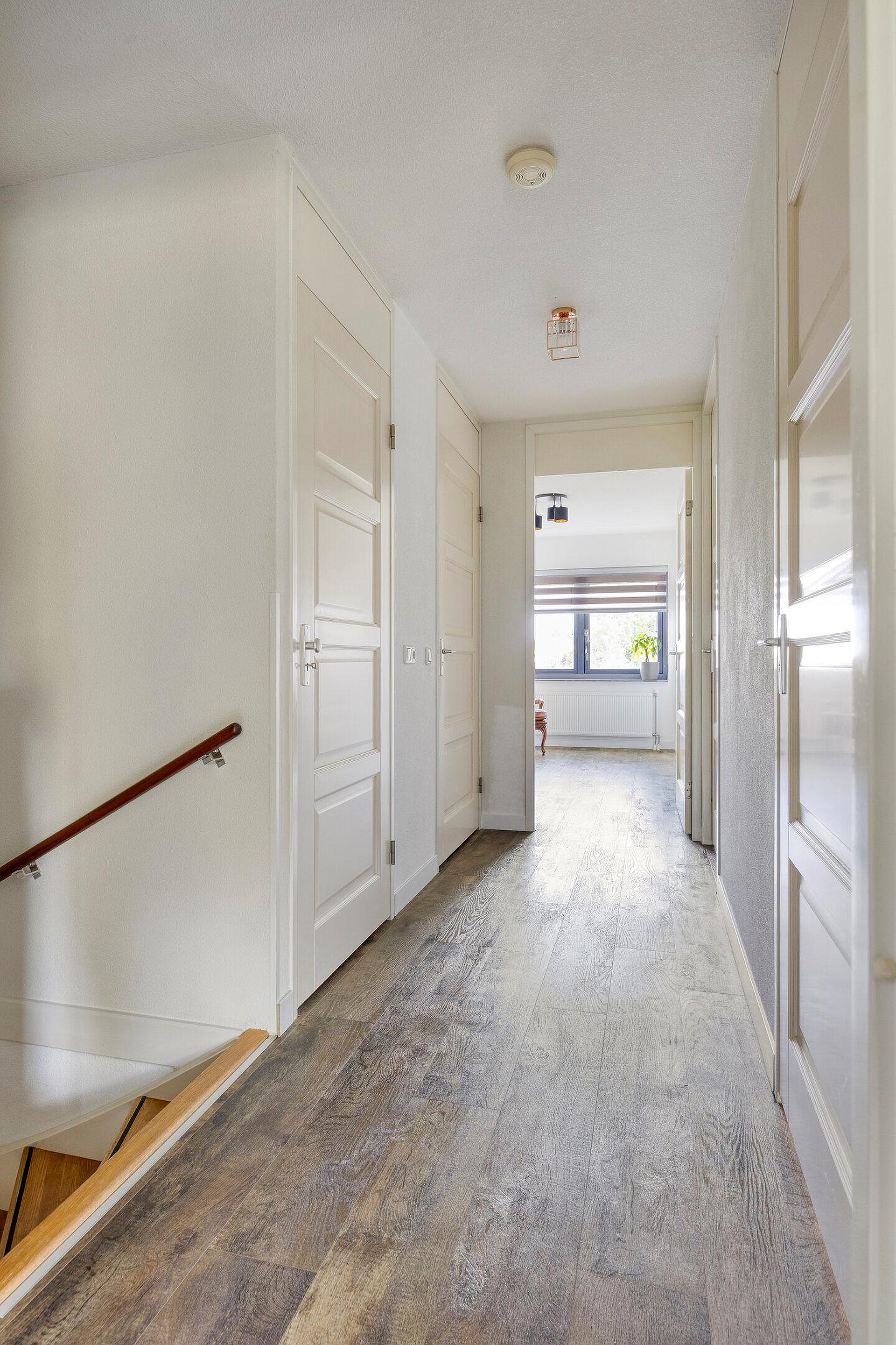 Een tweede vaste trap leidt naar de bovenste woonlaag, waar drie slaapkamers, een bergkast, de badkamer en een separate toiletruimte samenkomen op de overloop. De indeling is praktisch en optimaal voor gezinsbewoning.