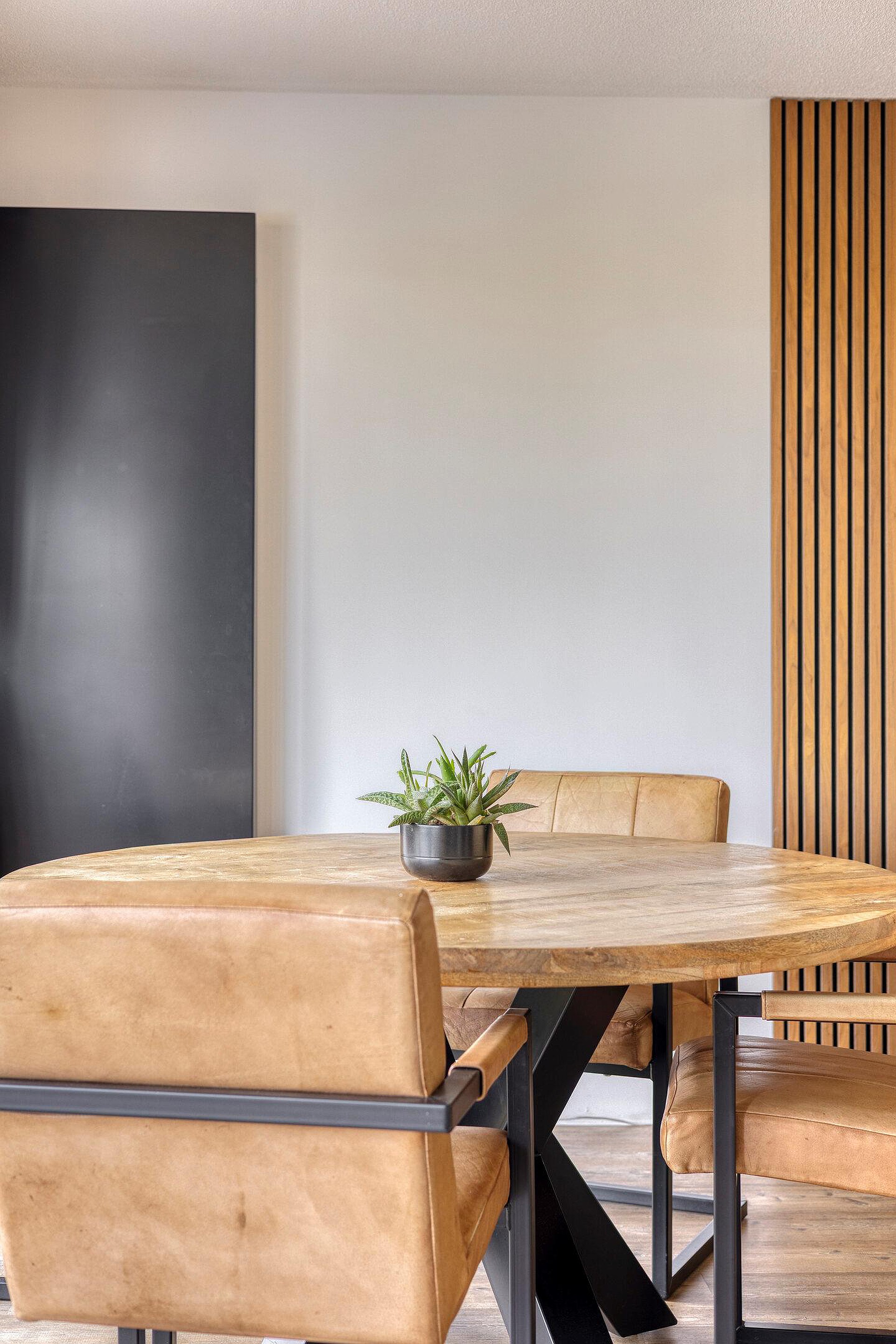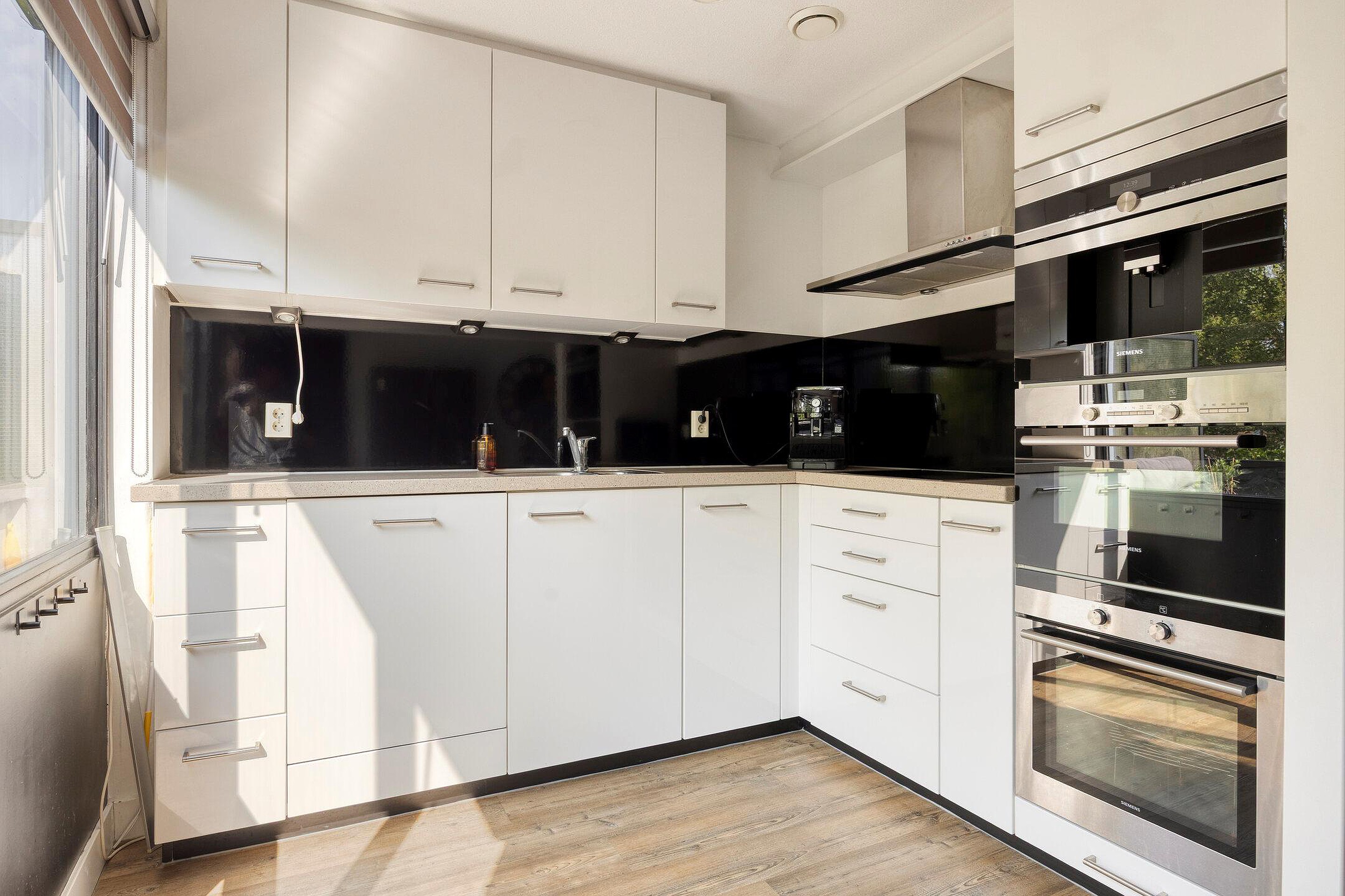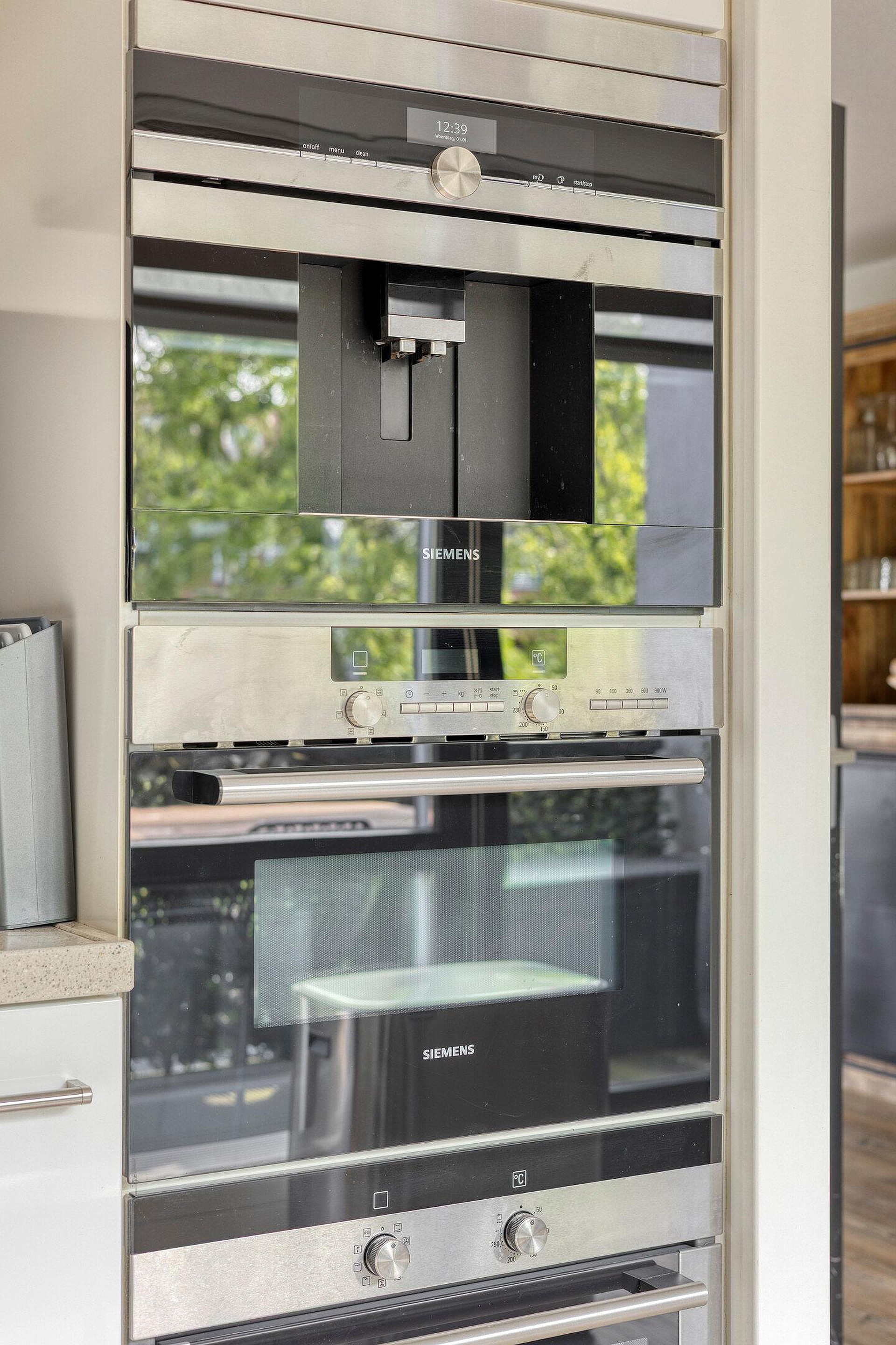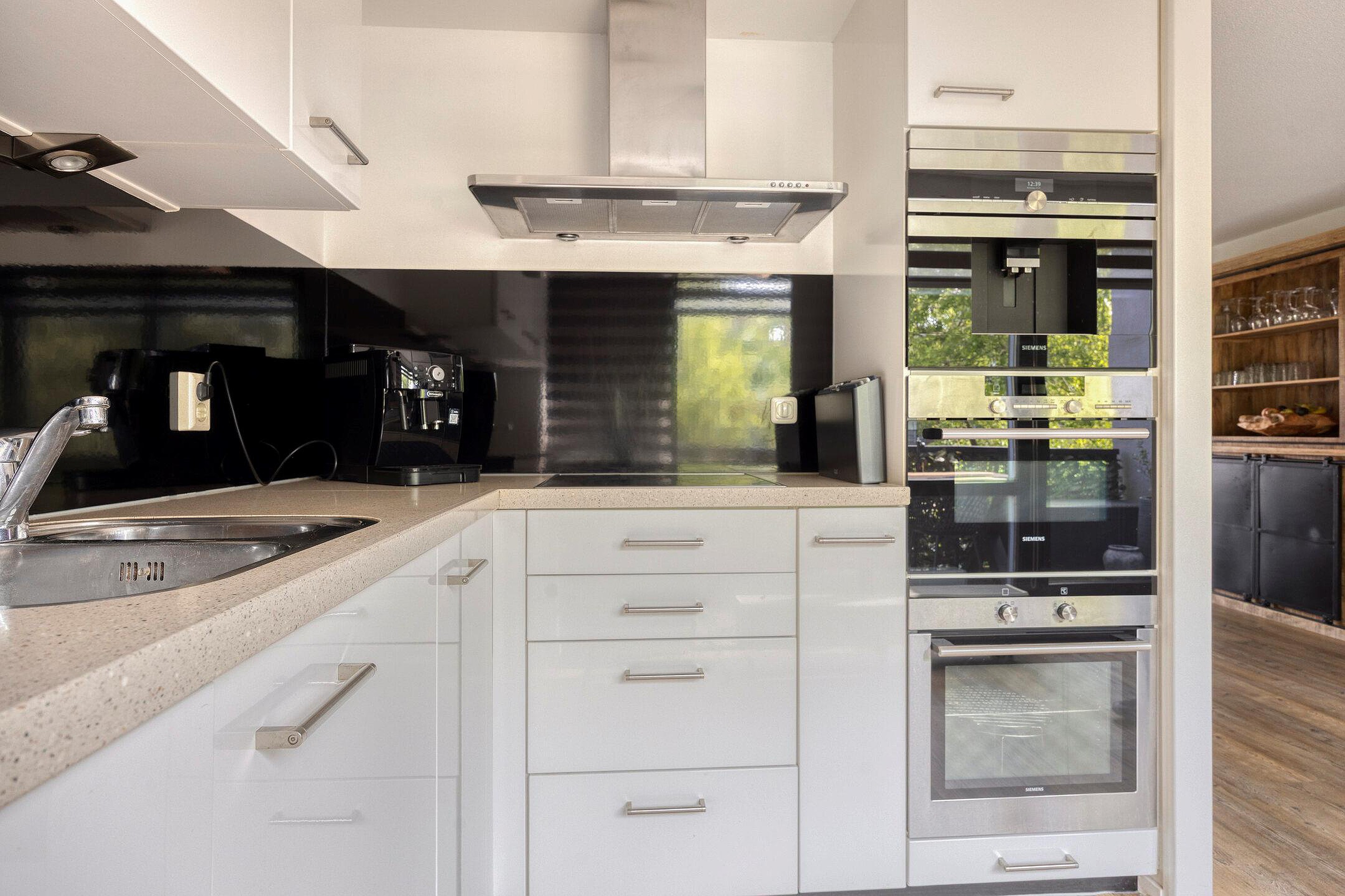 De moderne L-vormige keuken is van alle gemakken voorzien. Het ruime werkblad en de vele kasten bieden u alle opbergruimte die u nodig heeft. U beschikt over een inductiekookplaat, afzuigkap, ingebouwde koffiemachine, vaatwasser, ovencombinaties, en een dubbele spoelbak. Hier kookt u met gemak voor familie en vrienden, terwijl u toch verbonden blijft met de woonkamer.