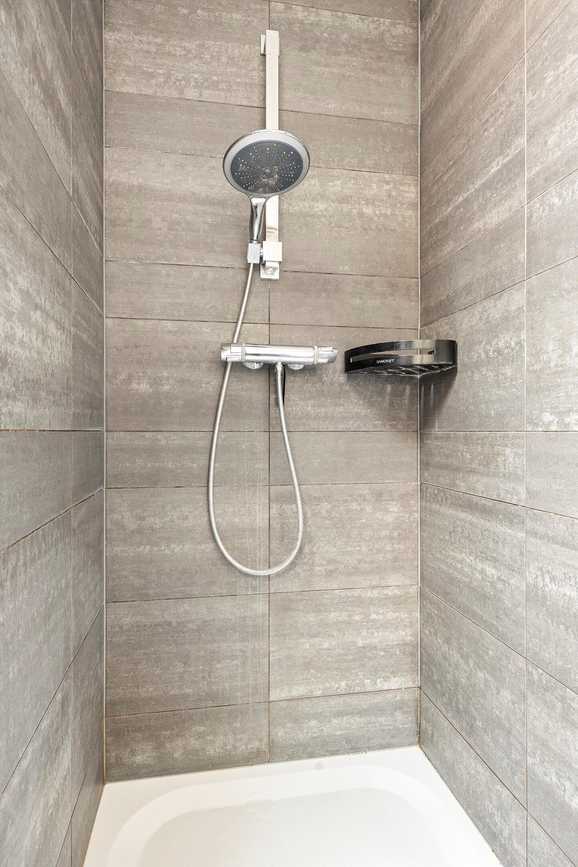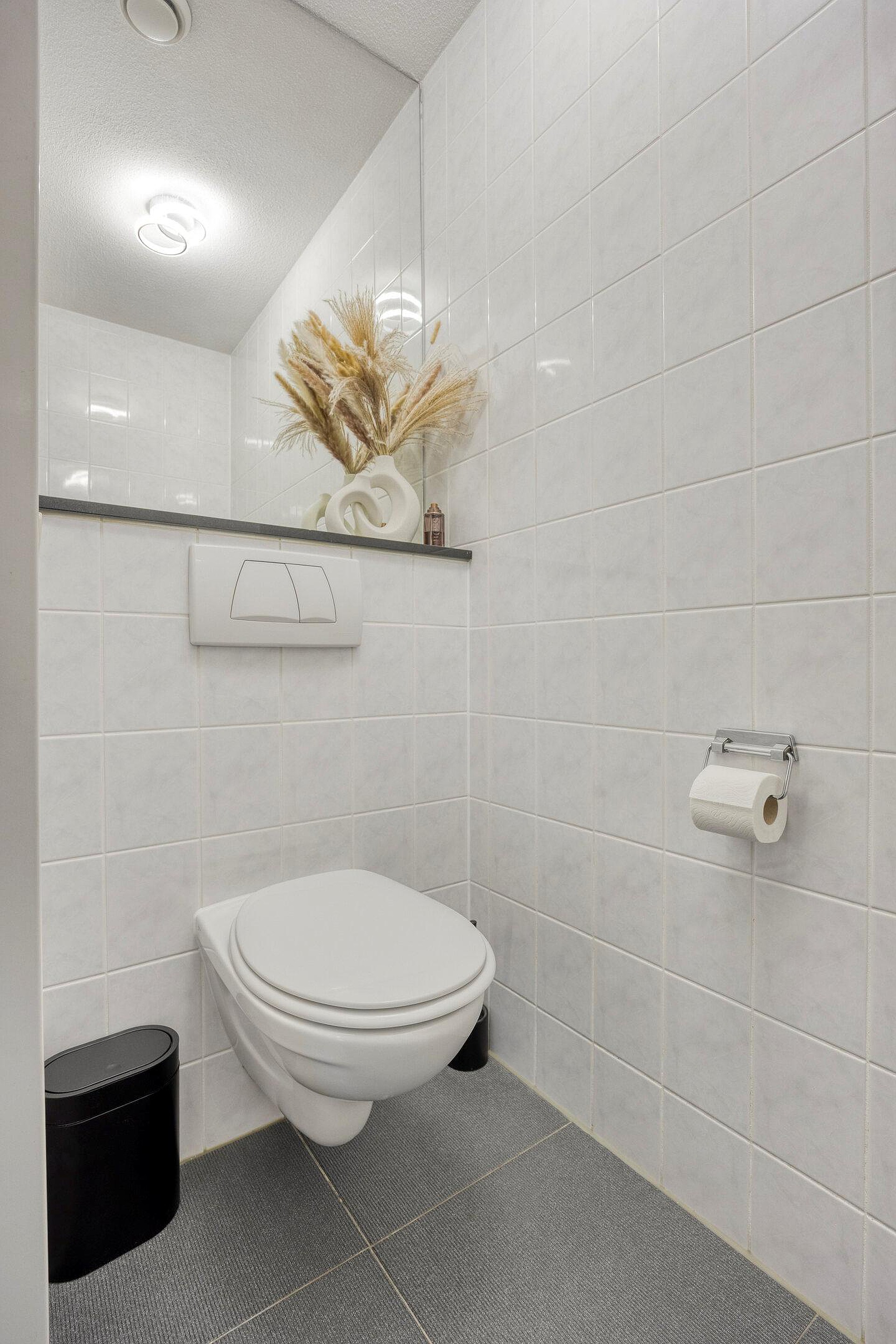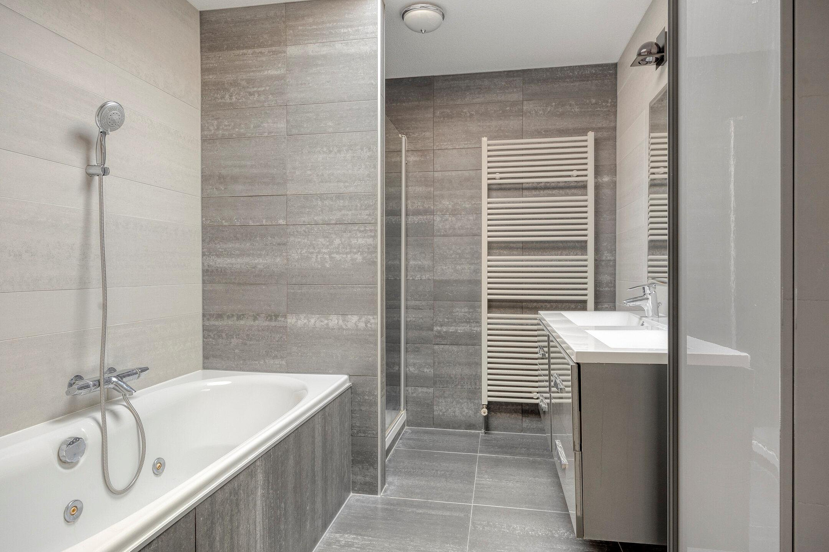 De nette, volledig betegelde badkamer beschikt over een ruime douchecabine, een ligbad, een handdoekradiator en een dubbele wastafel met opbergmeubel. De afwerking is modern en verzorgd, waardoor u direct kunt genieten zonder te hoeven verbouwen. Op de overloop vindt u een separate toiletruimte voor extra gemak.