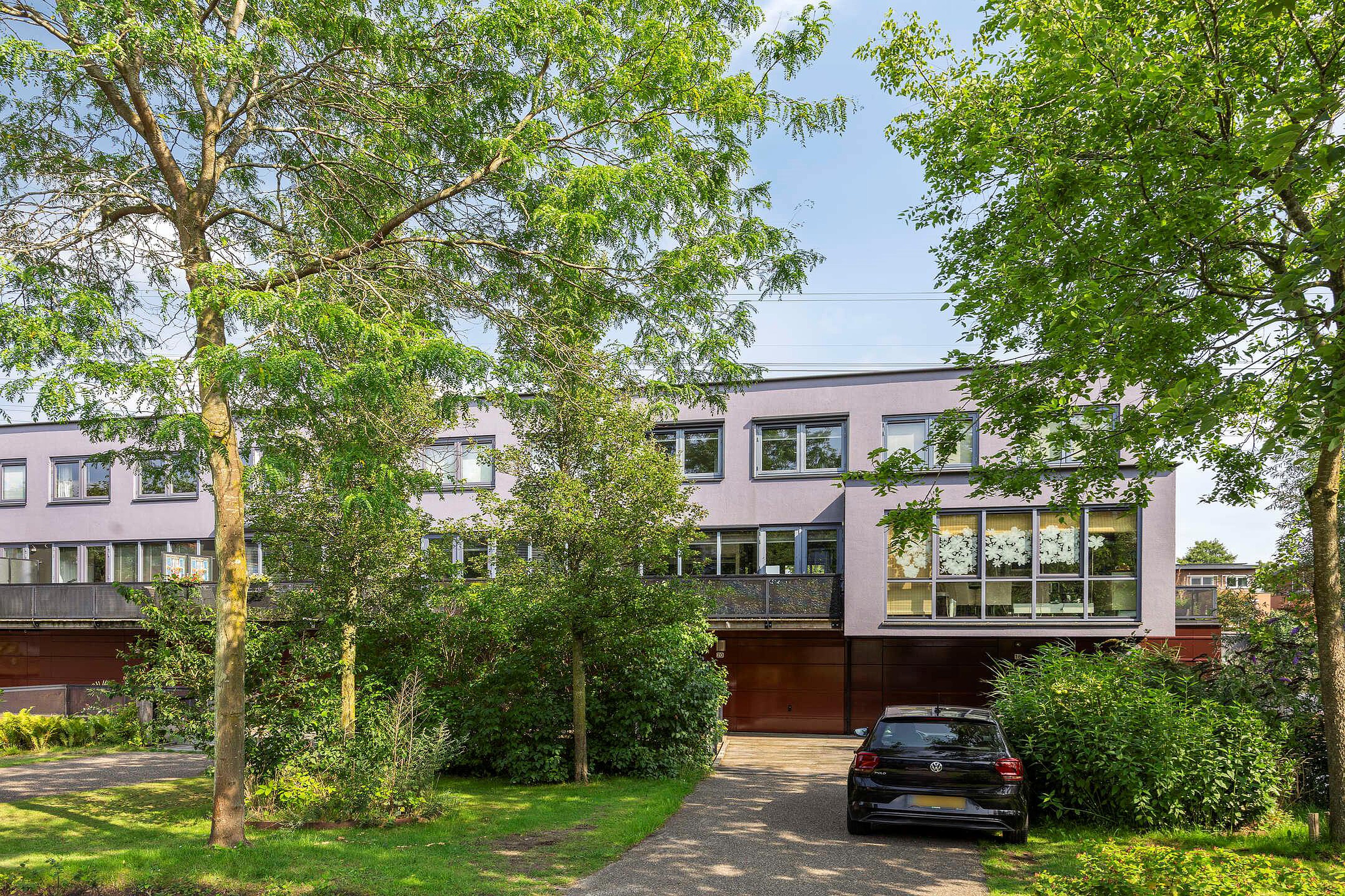 Moderne drive-in woning met oprit, inpandige garage, meerdere balkons en een terras aan het water.