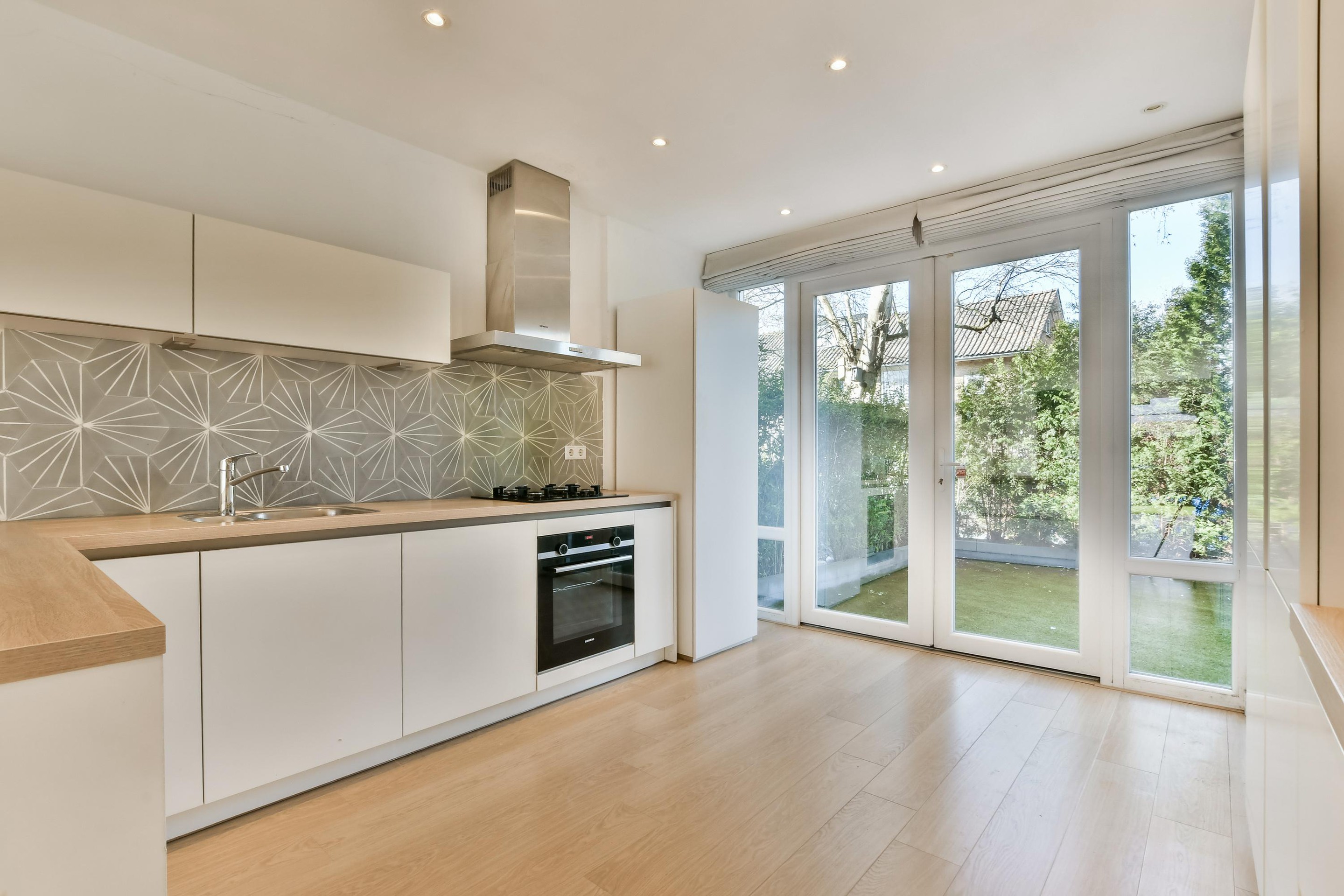 De openslaande deuren naar de voortuin zorgen voor extra licht en geven de ruimte een open karakter. Hier kook je met zicht naar buiten, terwijl de woning aan beide zijden in contact staat met de tuin.