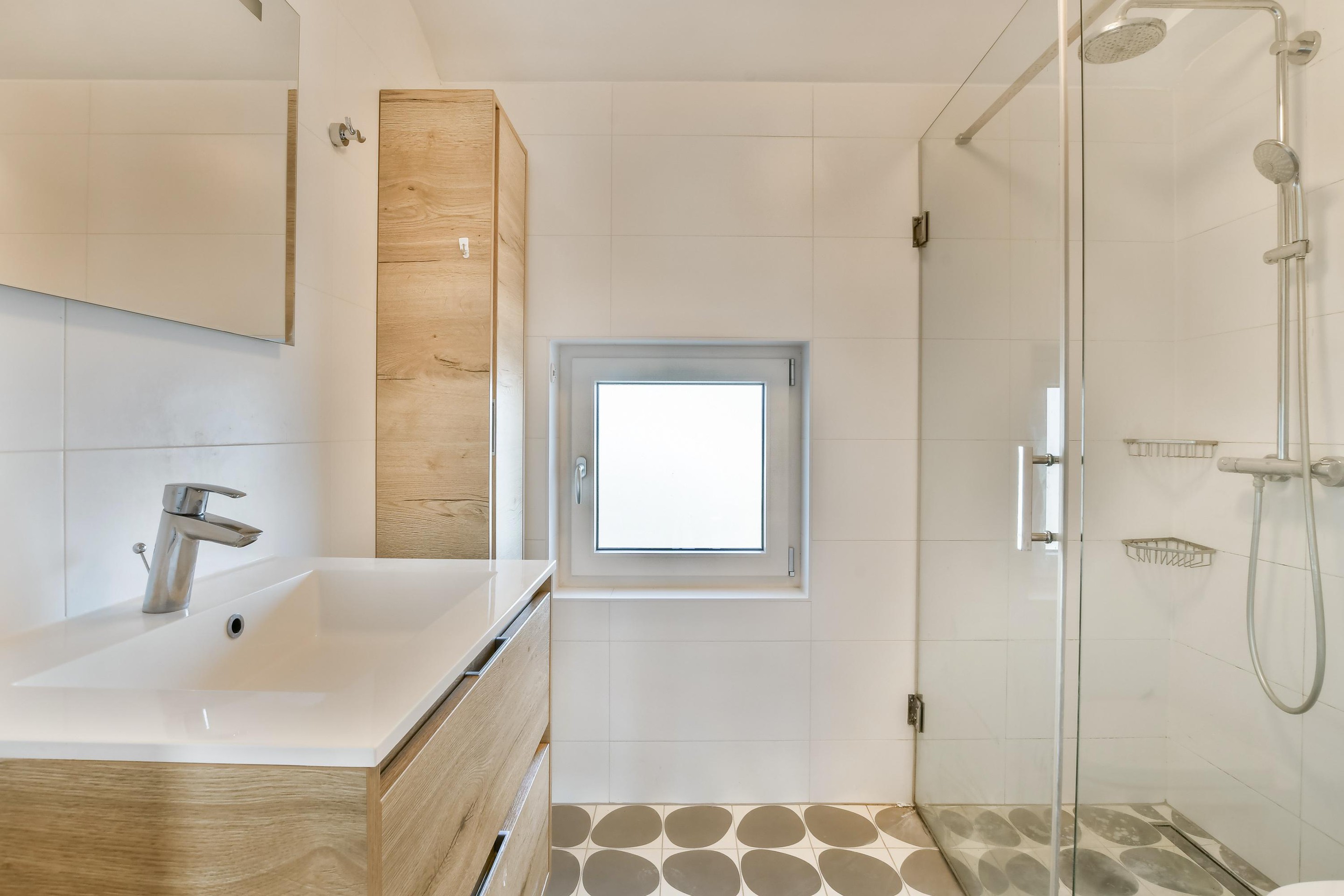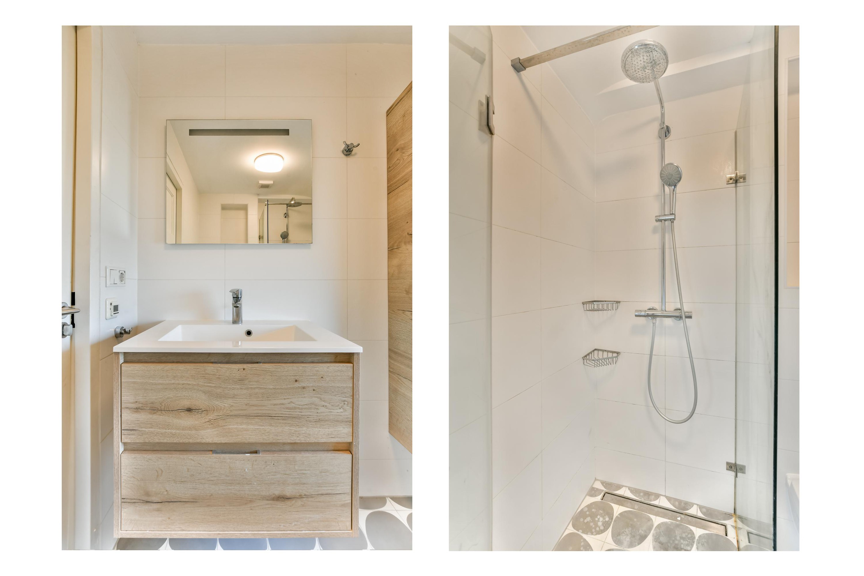 De badkamer is verzorgd uitgevoerd en voorzien van een inloopdouche met glazen douchewand (regendouche en handdouche), wastafelmeubel en zwevend toilet.