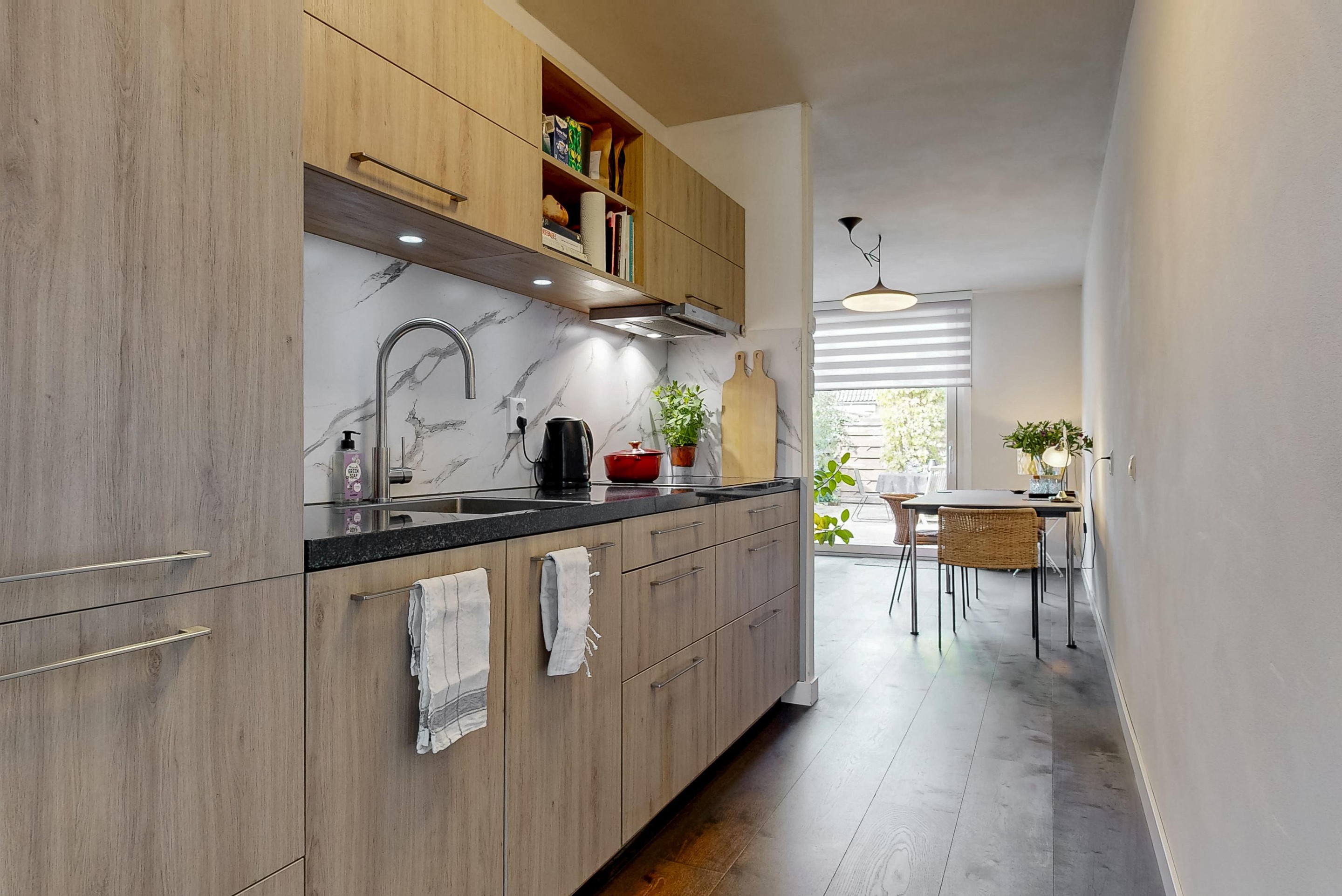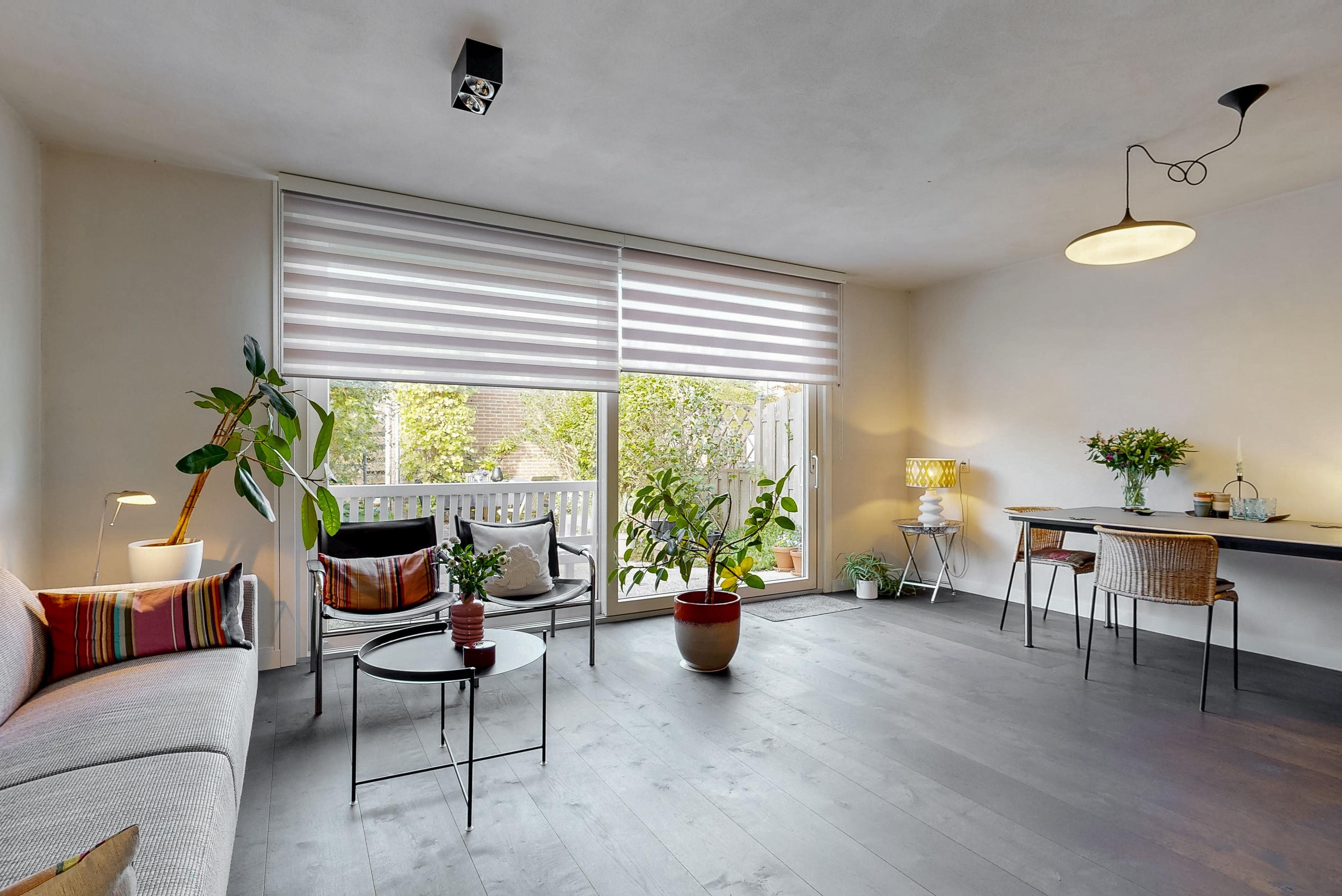 - Comfort – eiken lamelparket met vloerverwarming op de begane grond en een zonnige tuin op het westen.