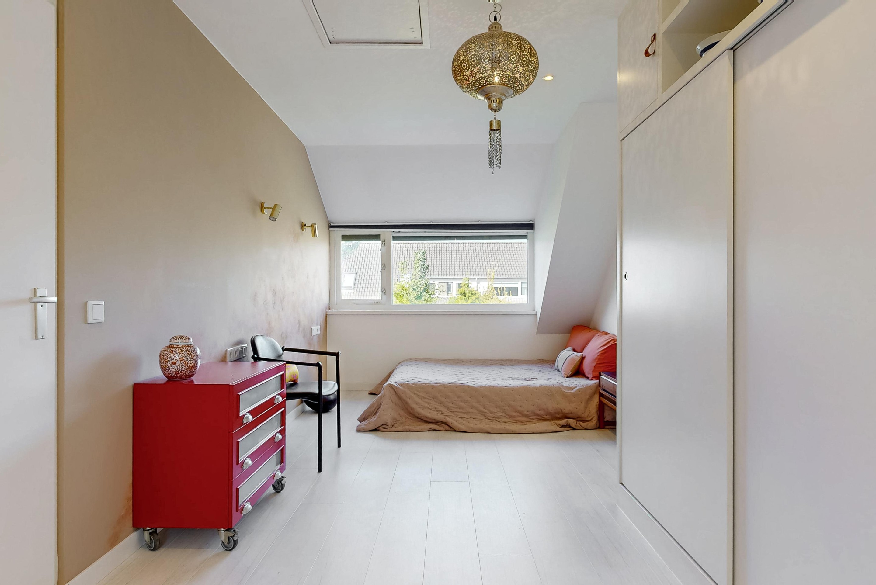 The first floor has two spacious bedrooms with dormer windows at the rear. A storage cupboard with sink and central heating system completes this floor and provides access to the attic. Thanks to a thorough renovation in 2019, the house has a new kitchen, bathroom, mechanical ventilation, a hybrid heat pump, six solar panels, and a renewed meter cupboard with 3 phases. Combined with full insulation and HR+ glass, this results in a very favorable energy label A+.