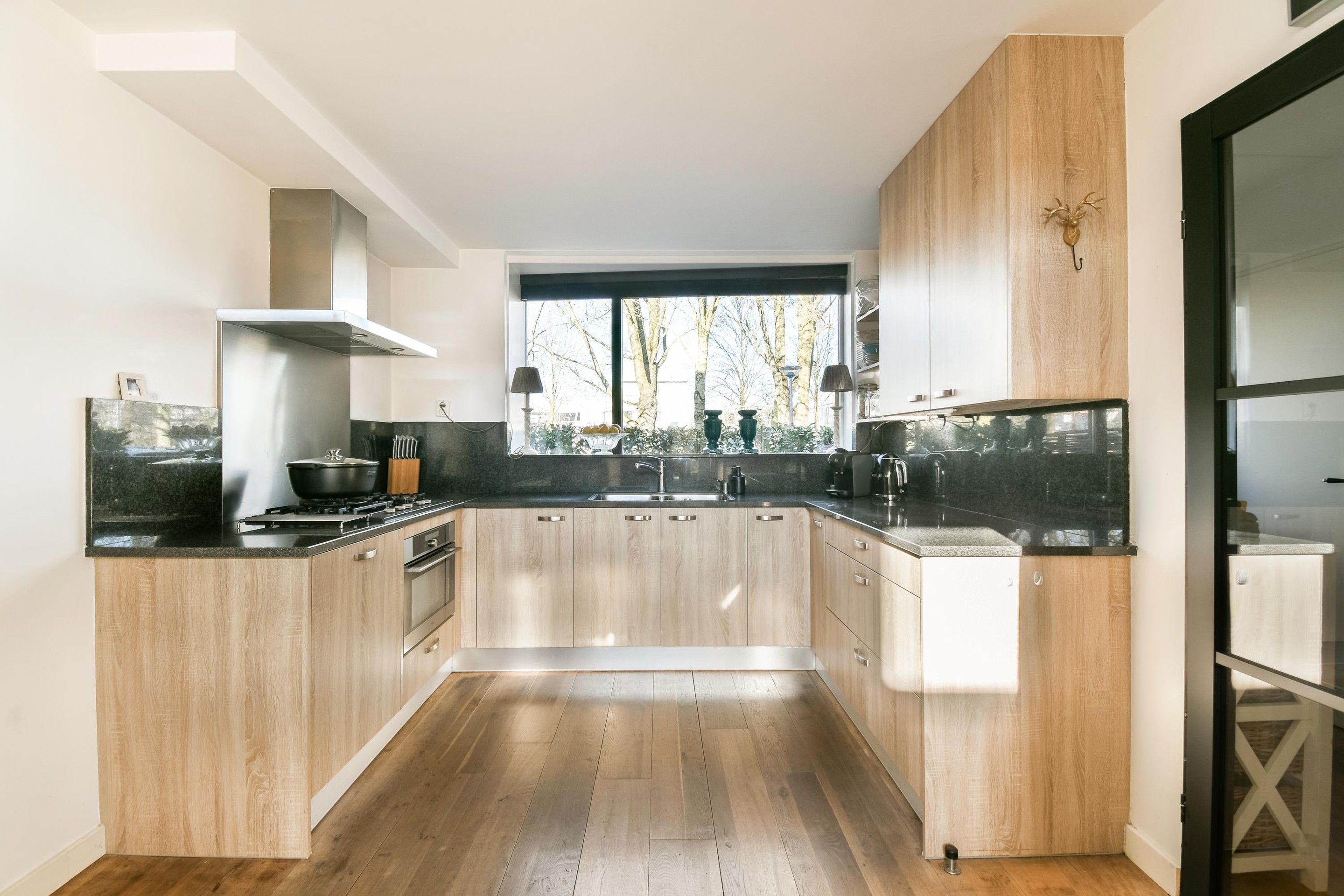 The open-plan, luxury kitchen features a beautiful stone countertop and is equipped with all the modern conveniences. It includes an American-style double-door refrigerator, a Pelgrim extractor hood, a combination oven (convection and microwave), an Atag 5-burner gas stove with a wok burner, two sinks, and a Bosch dishwasher. From the kitchen, you have a beautiful view of the canal and green spaces right in front of your house.