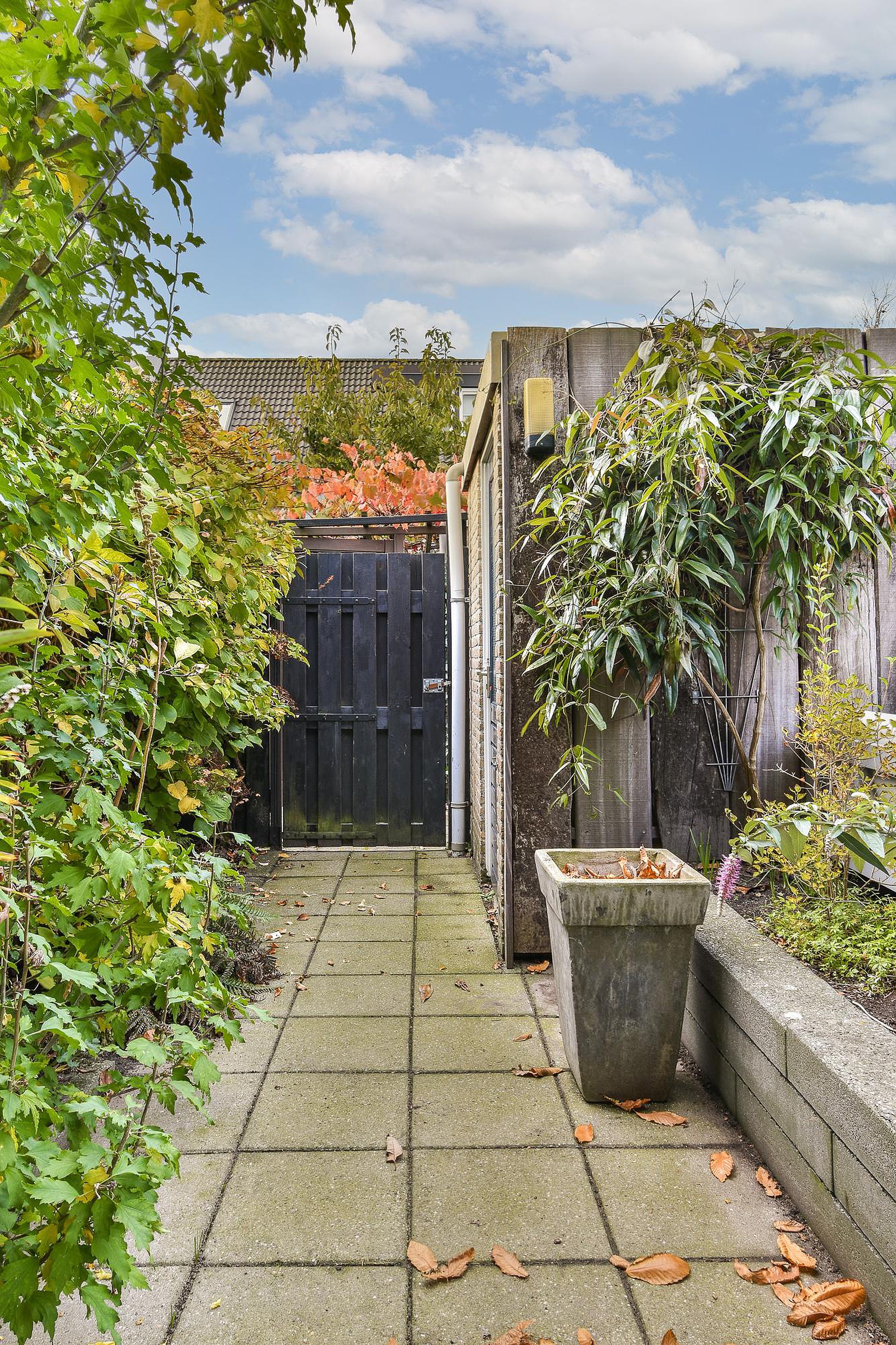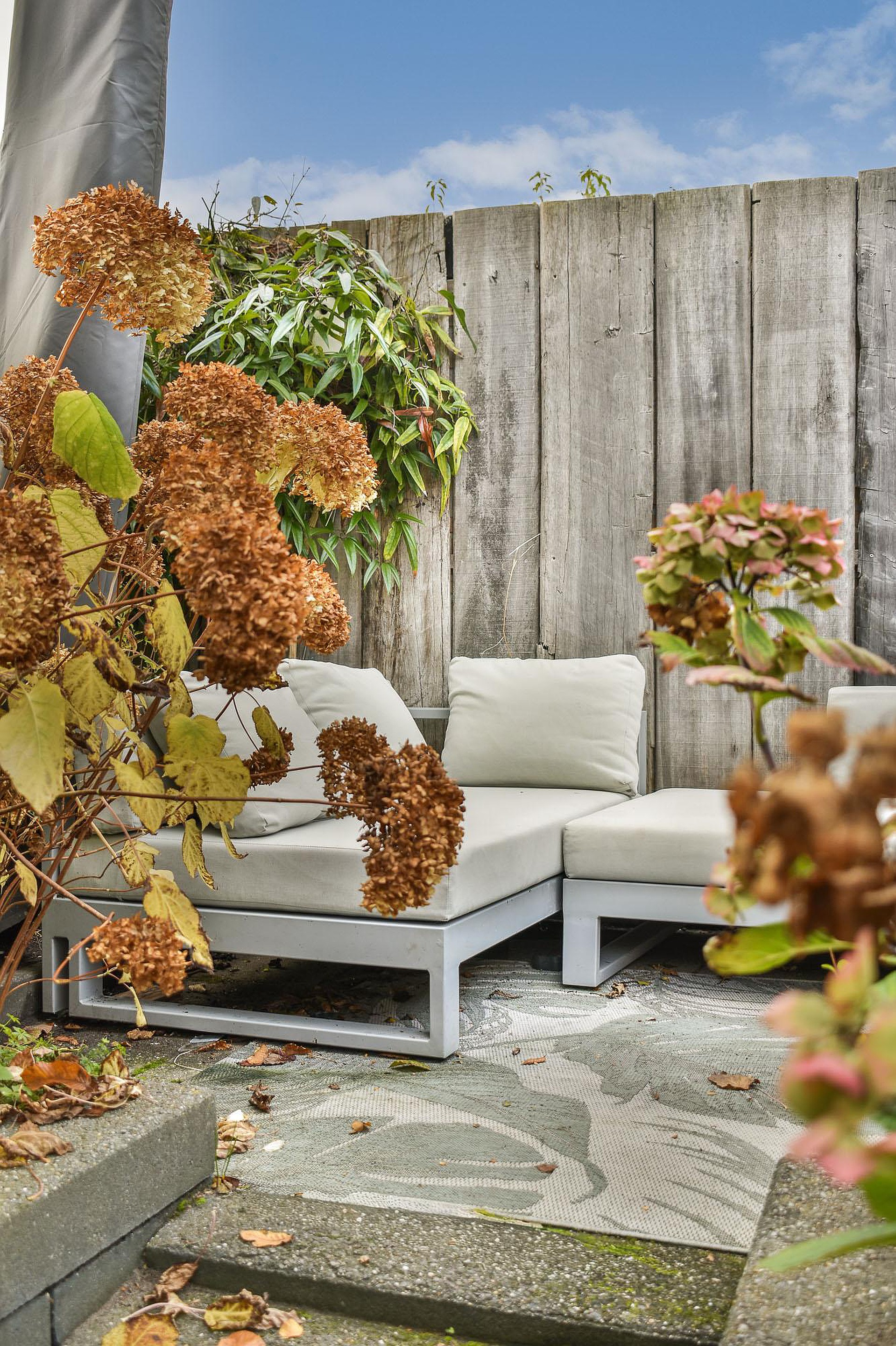 De heerlijke zonnige achtertuin ligt op het Westen en is vrij op het Zuiden (ca. 60 m2). Echt genieten. Deze tuin is lekker ruim, keurig betegeld en heeft een achterom. Deze beschikt ook over een mooi zitgedeelte aan de achterkant van de tuin. Verder een ruime stenen schuur voor uw fietsen, etc.  En aan de rechterkant een onderheide stenen muur.