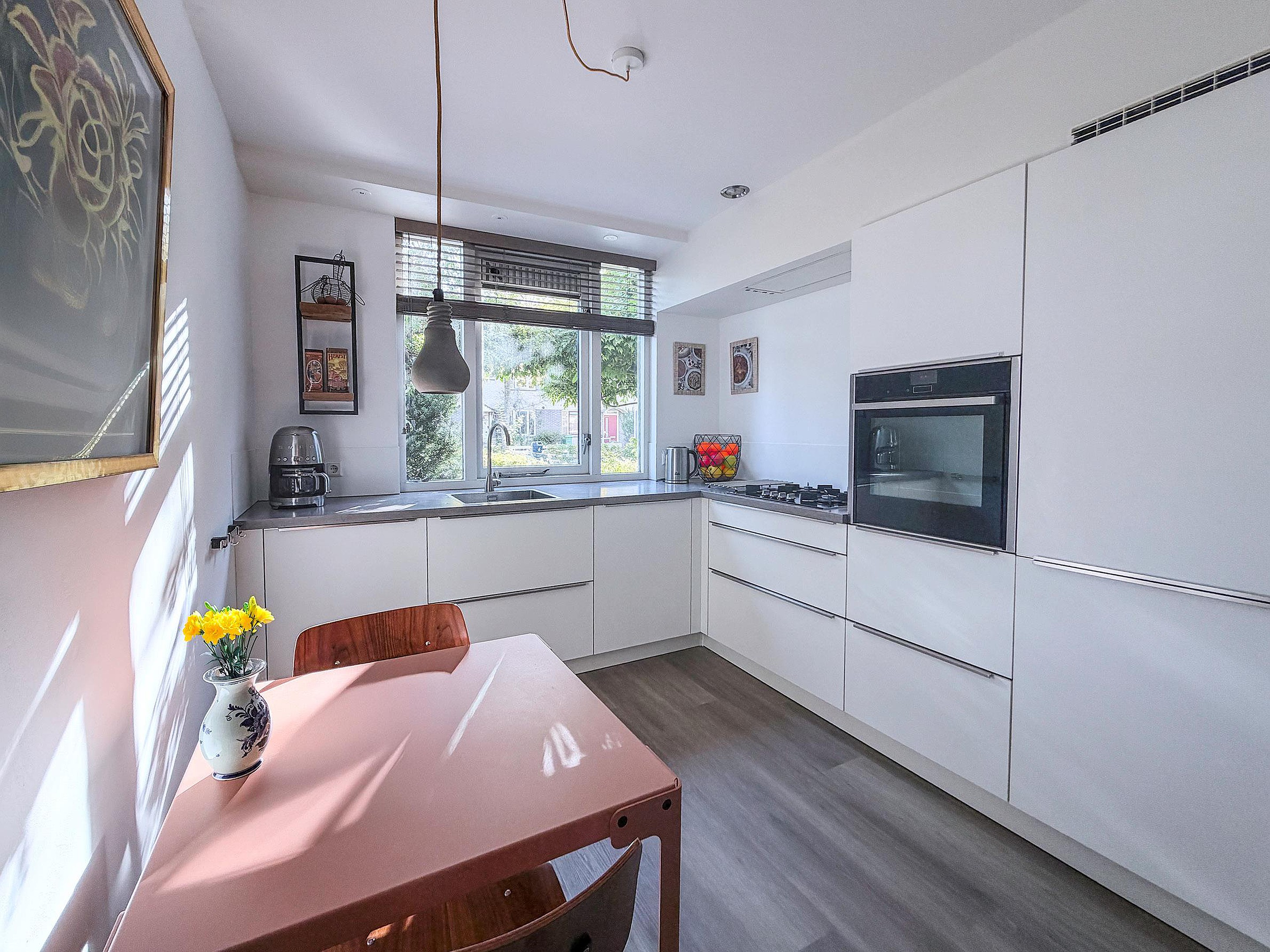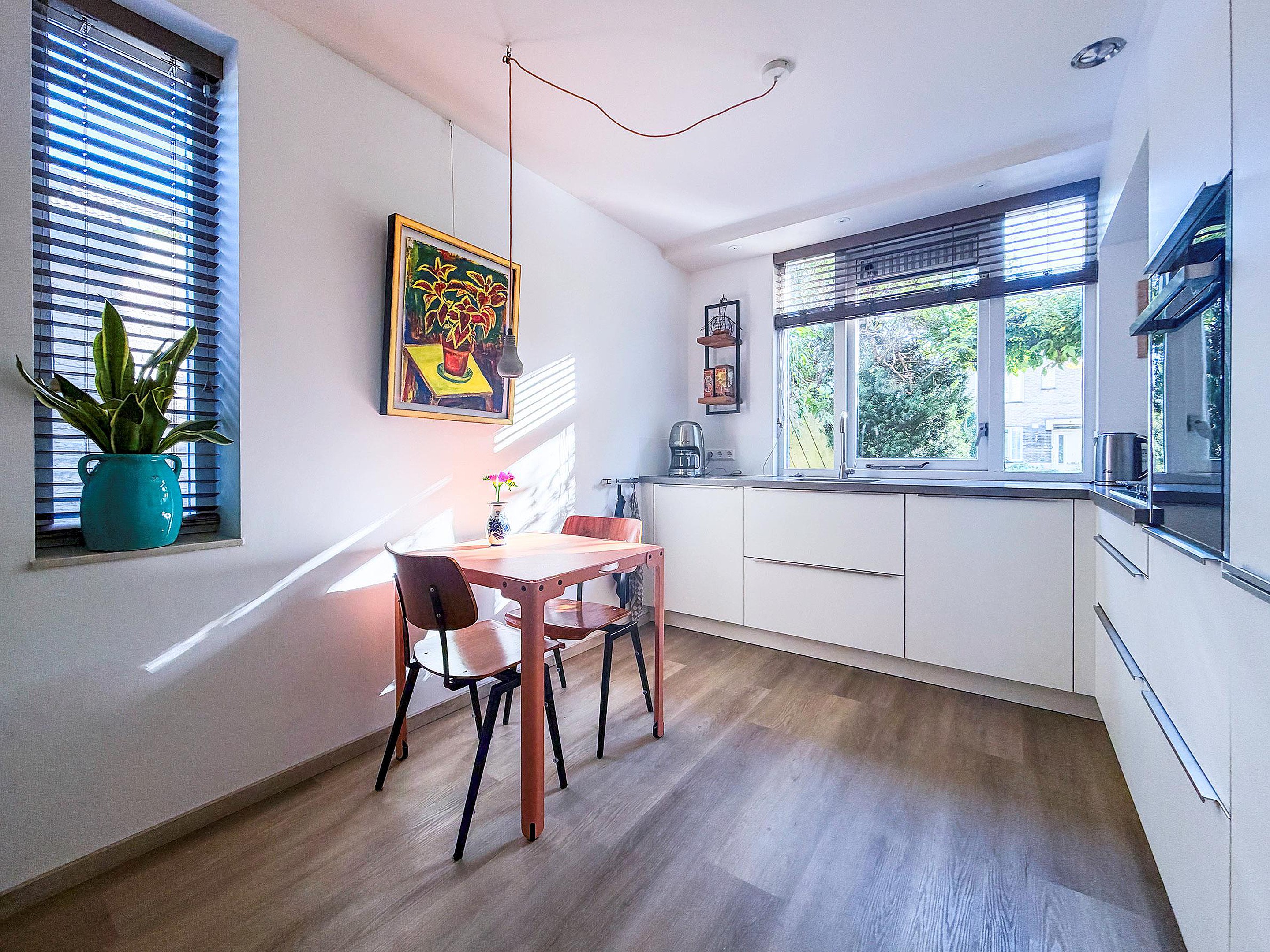 De semi-open luxe keuken is voorzien van alle apparatuur voor dagelijks comfort, o.a.: een mooi werkblad rondom in een L vorm, een fraaie gaskookplaat, electrische oven, vaatwasser, koelkast vries combinatie. Door het ruime ( nieuwe ) voorraam en zijraam is er veel lichtinval.