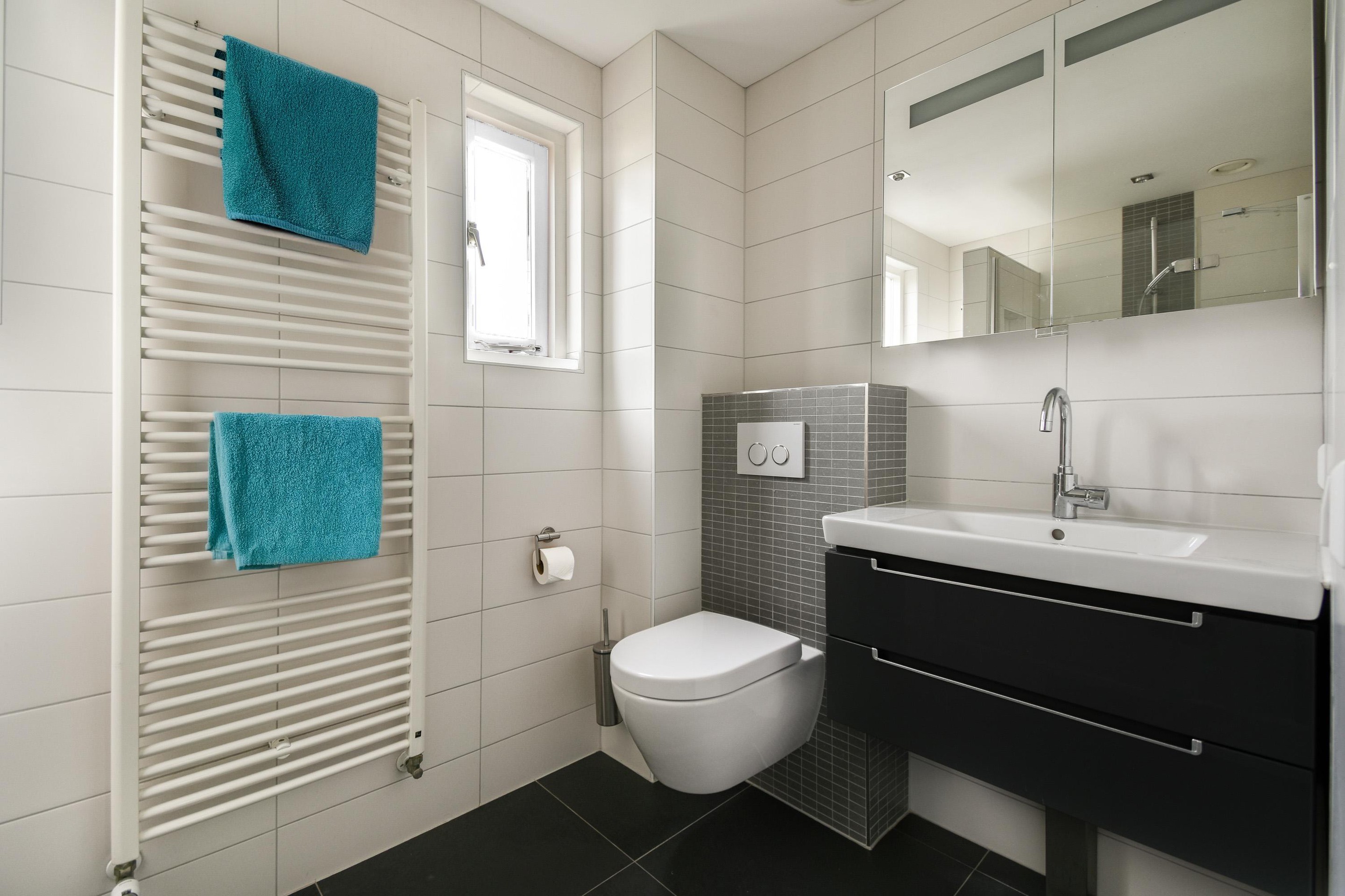 De moderne badkamer is gelegen aan de voorzijde van de woning en is voorzien van een wastafel, inloopdouche, zwevend toilet, vloerverwarming en is netjes betegeld. Op deze verdieping ligt een fraaie laminaat vloer.