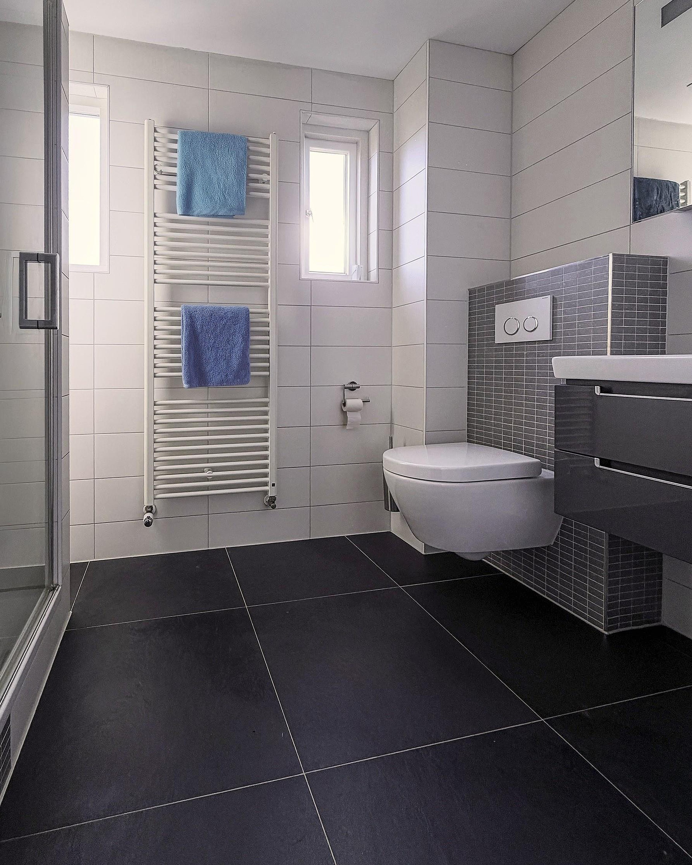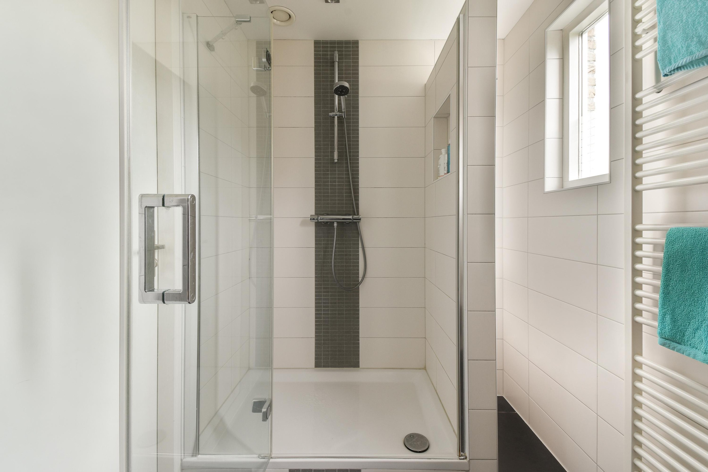 The modern bathroom is located at the front of the house and is equipped with a sink, walk-in shower, wall-hung toilet, underfloor heating, and is neatly tiled. This floor has beautiful laminate flooring.
