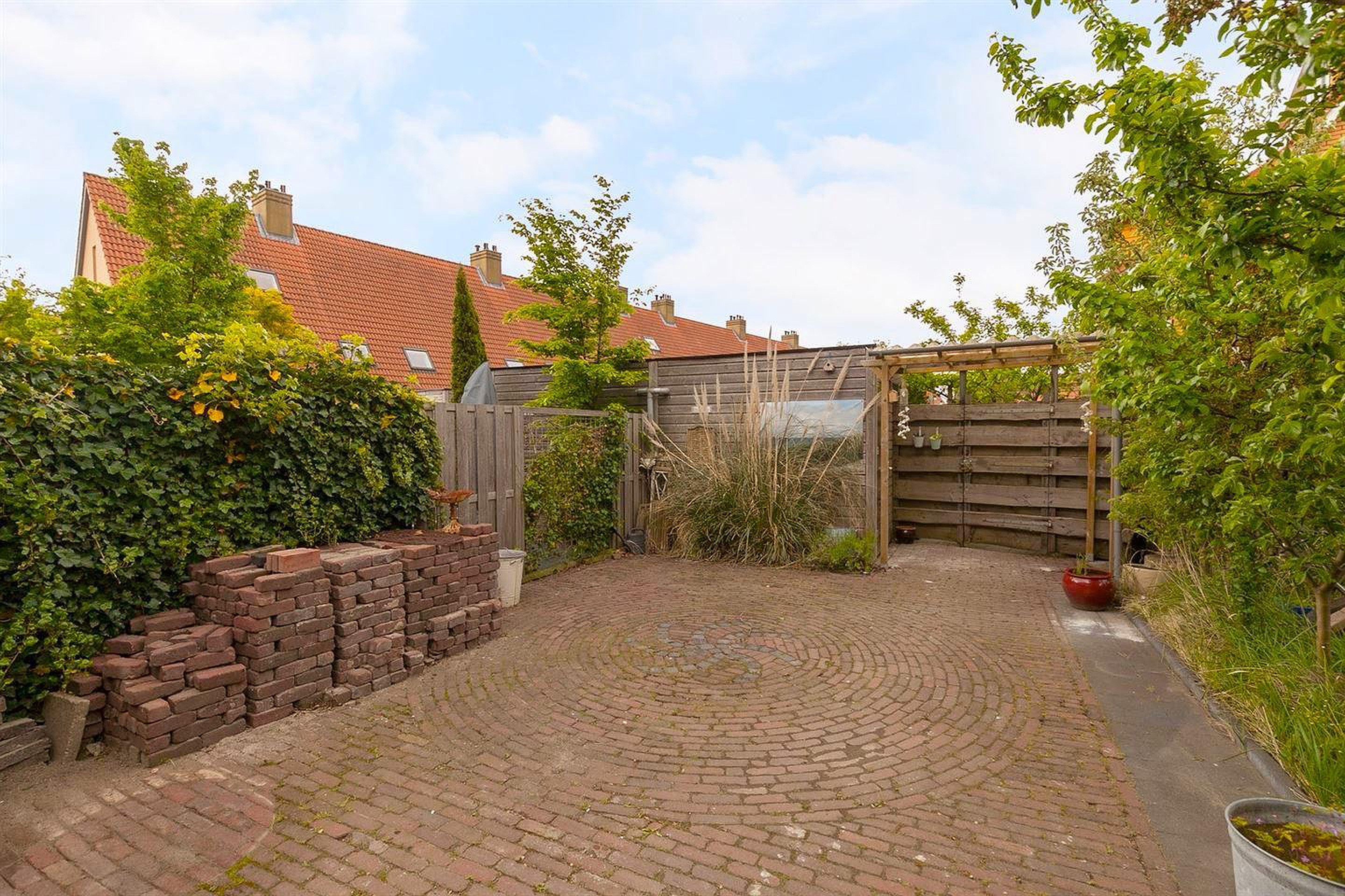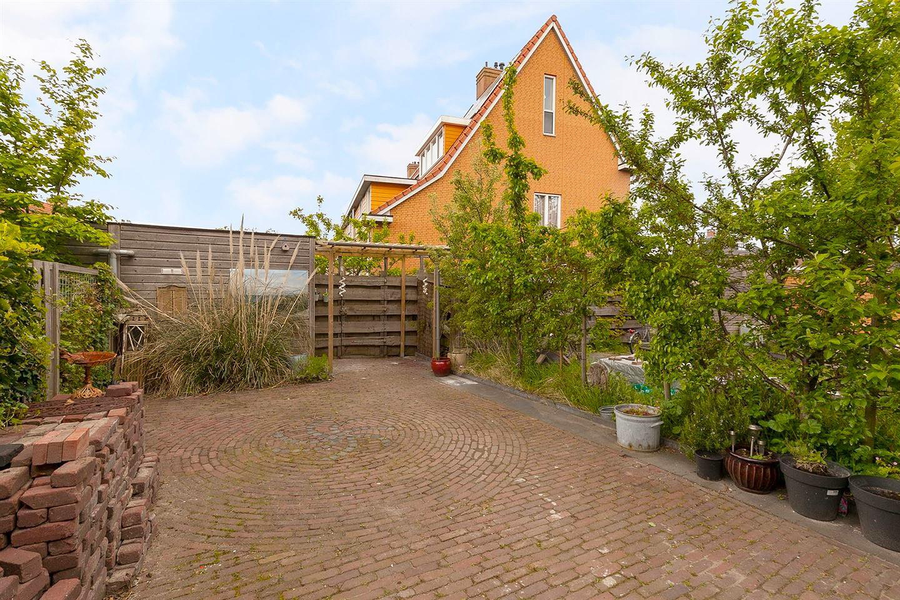The lovely, sunny back garden faces southwest and is spacious (approx. 55 m2). A true delight. This garden is spacious, neatly tiled, and has rear access. There's also a shed for your bicycles, etc. The beautiful trees line the property line.