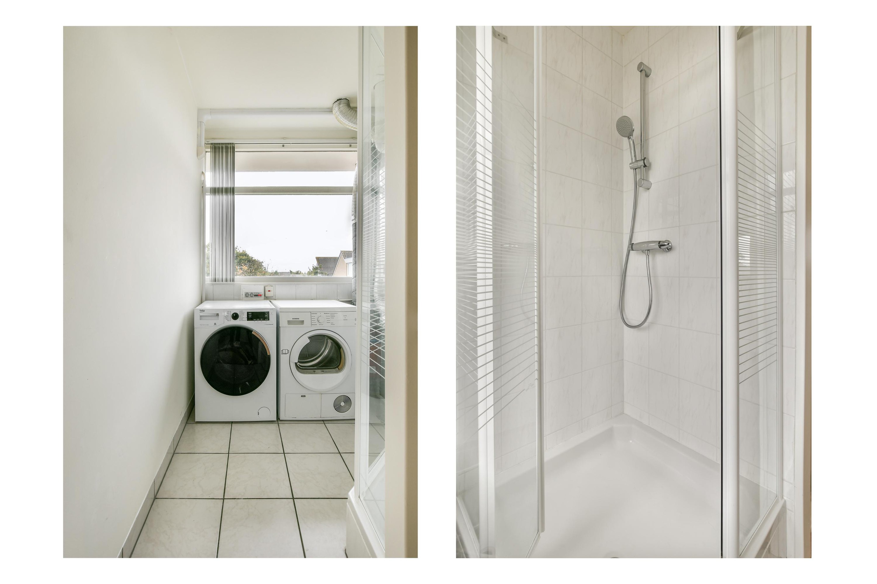 Verder nog een bescheiden badkamer met opstelling wasmachine en droger. Hier bevindt zich ook de opstelling van de cv-ketel en mechanische ventilatie.
