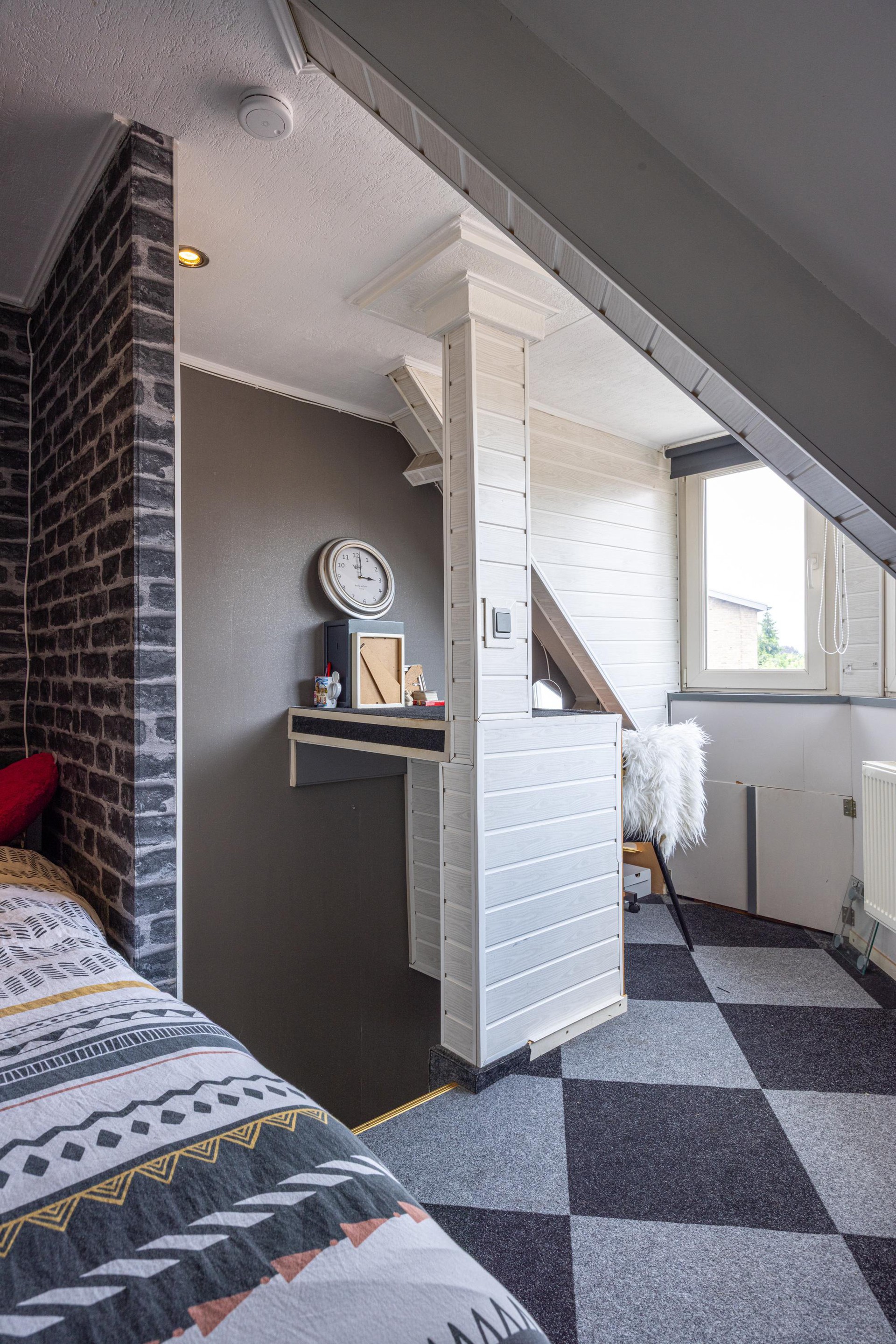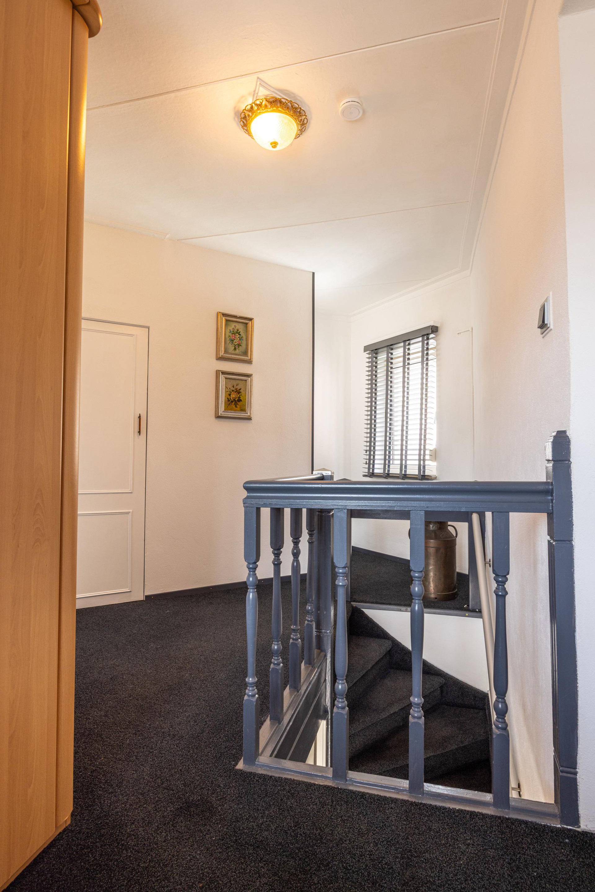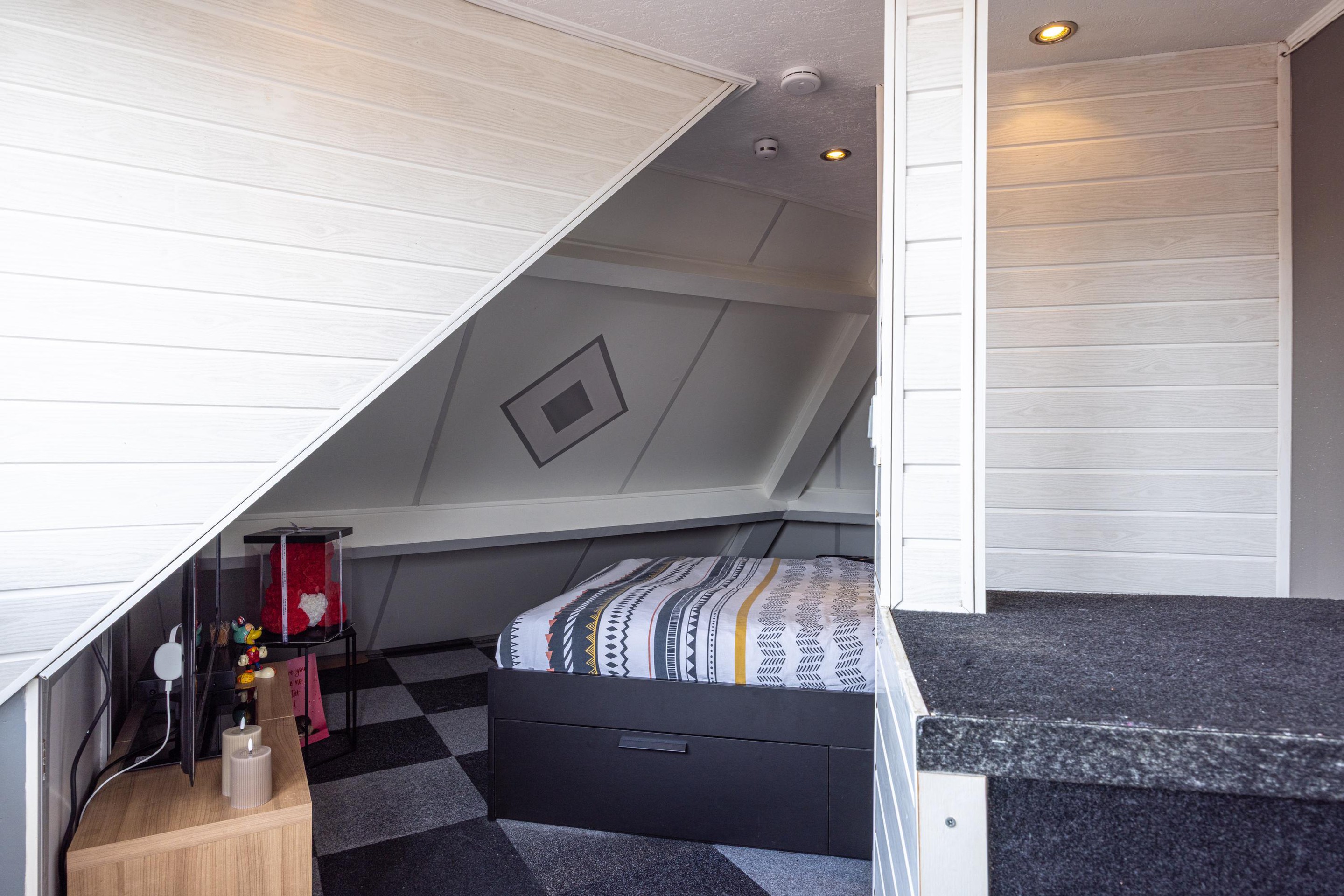 Een vaste trap leidt naar de tweede verdieping. Hier bevindt zich een derde kamer met tapijt, geschikt als slaapkamer of werkkamer. Vanuit deze ruimte is een vliering bereikbaar die dienst kan doen als extra bergruimte.