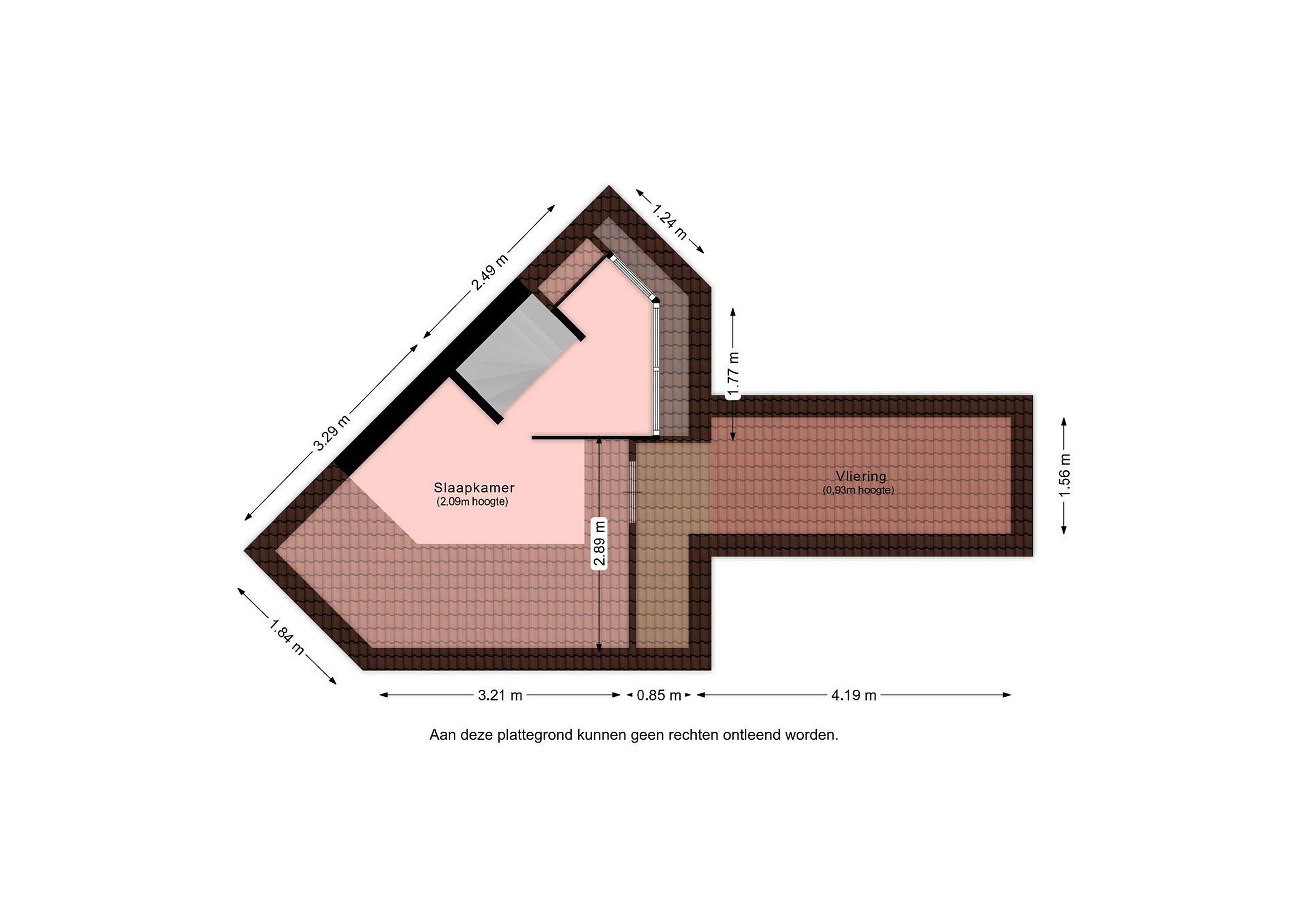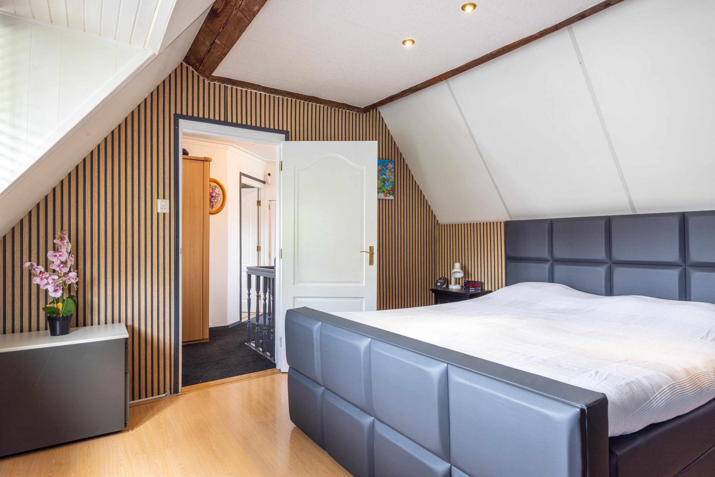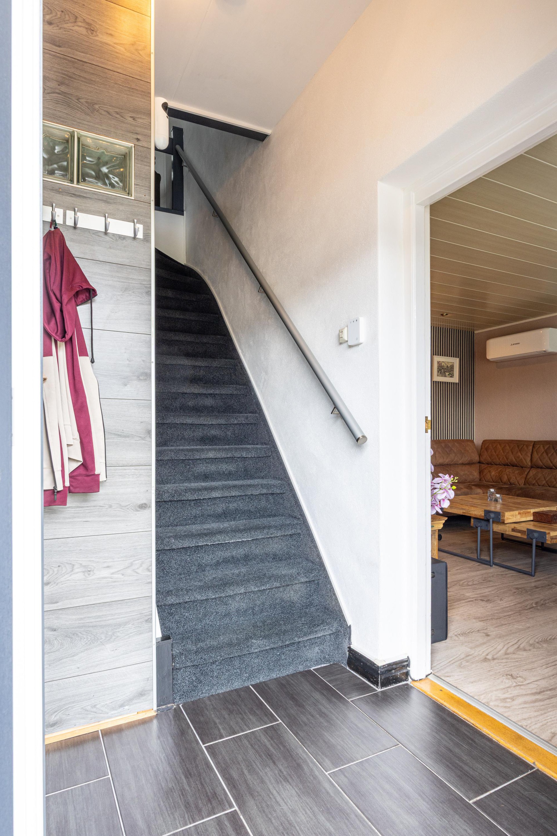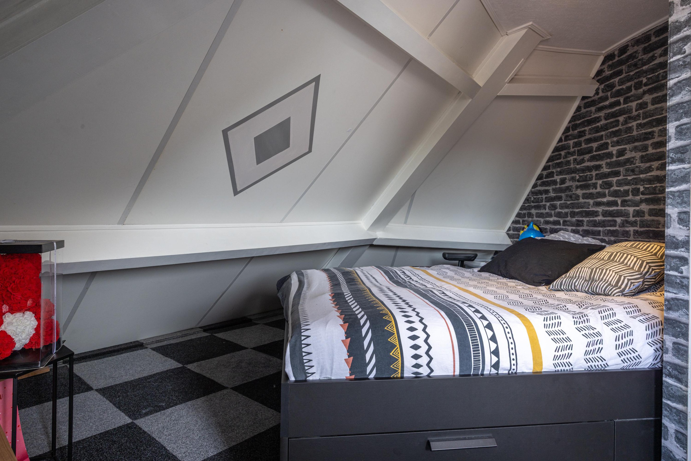 Een vaste trap leidt naar de tweede verdieping. Hier bevindt zich een derde kamer met tapijt, geschikt als slaapkamer of werkkamer. Vanuit deze ruimte is een vliering bereikbaar die dienst kan doen als extra bergruimte.