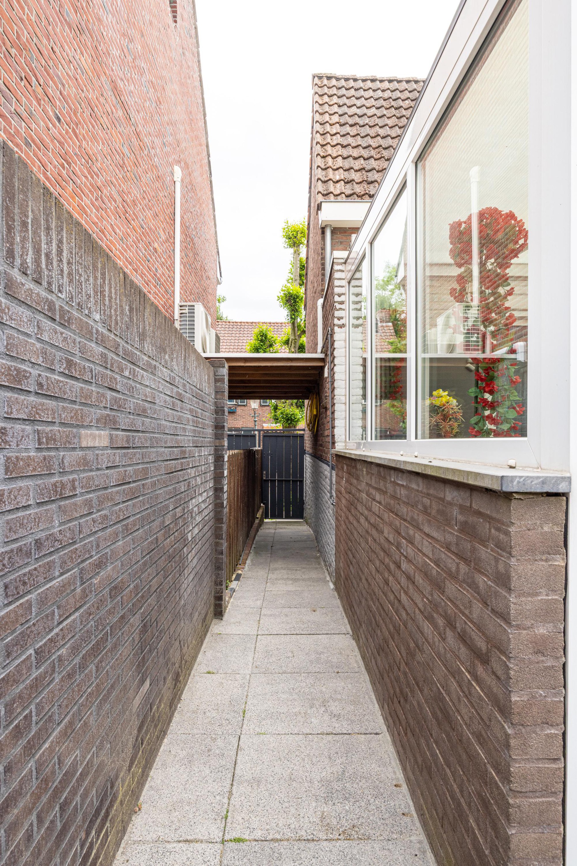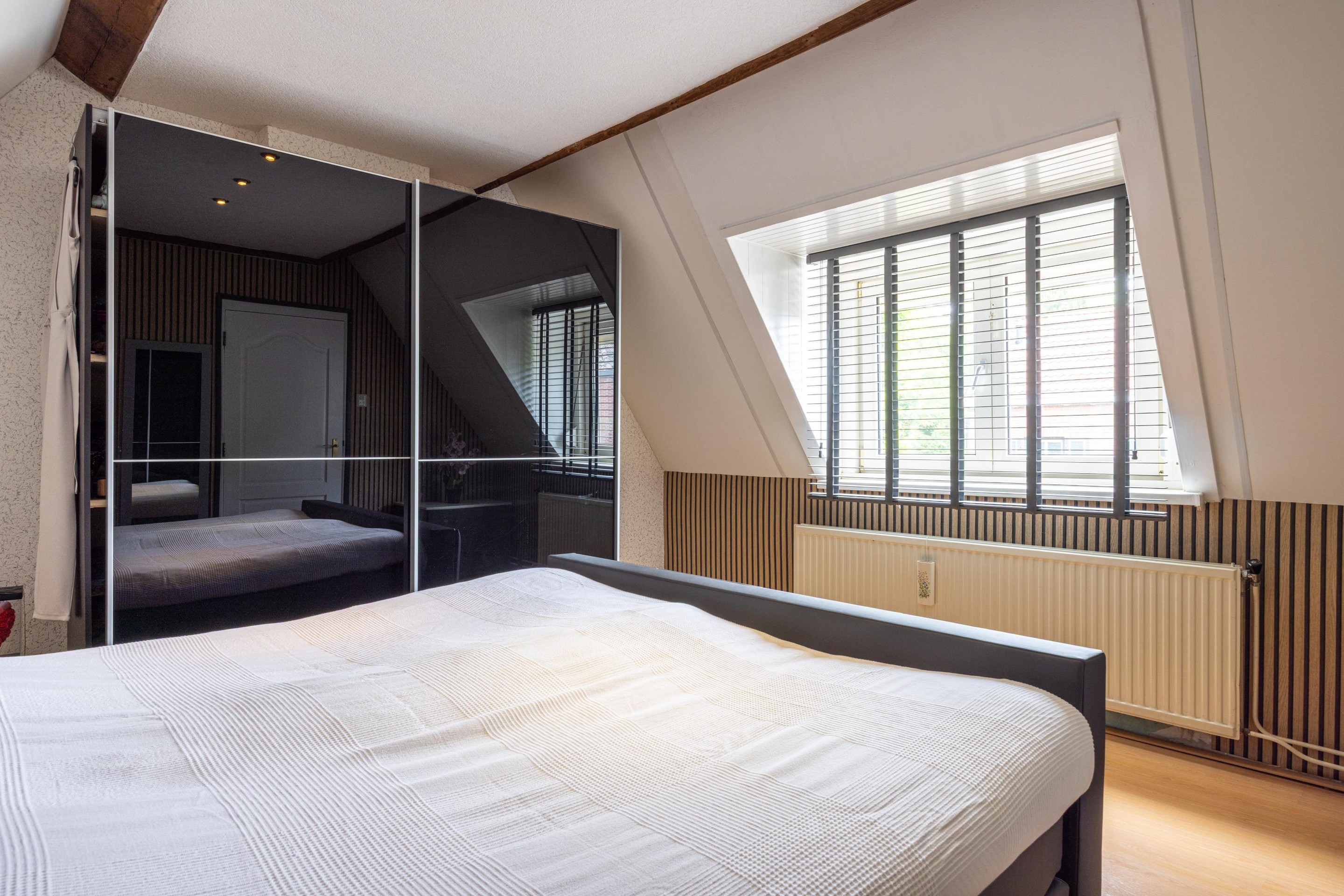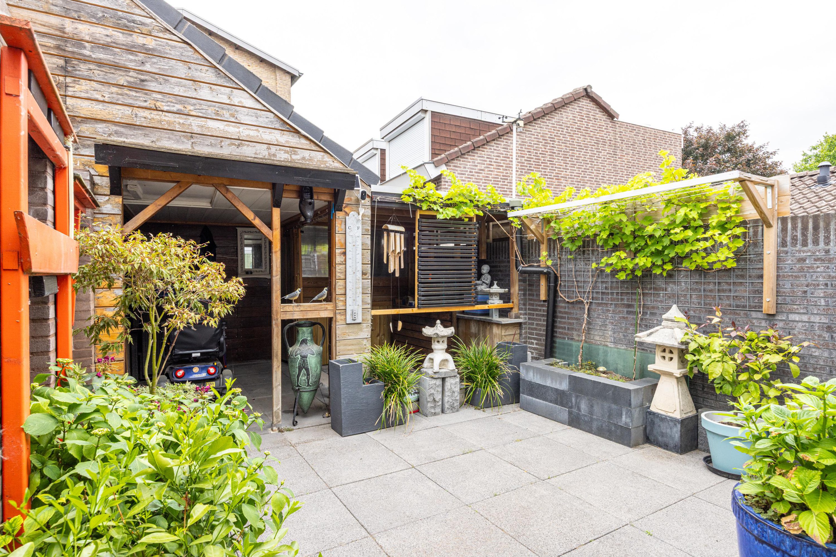 De achtertuin is verzorgd aangelegd met borders en bestrating. Achterin bevindt zich een overkapping met een kleine schuur en een praktische vliering. Deze ruimte is ideaal voor het stallen van fietsen of opbergen van gereedschap. De tuin beschikt daarnaast over een eigen achterom.