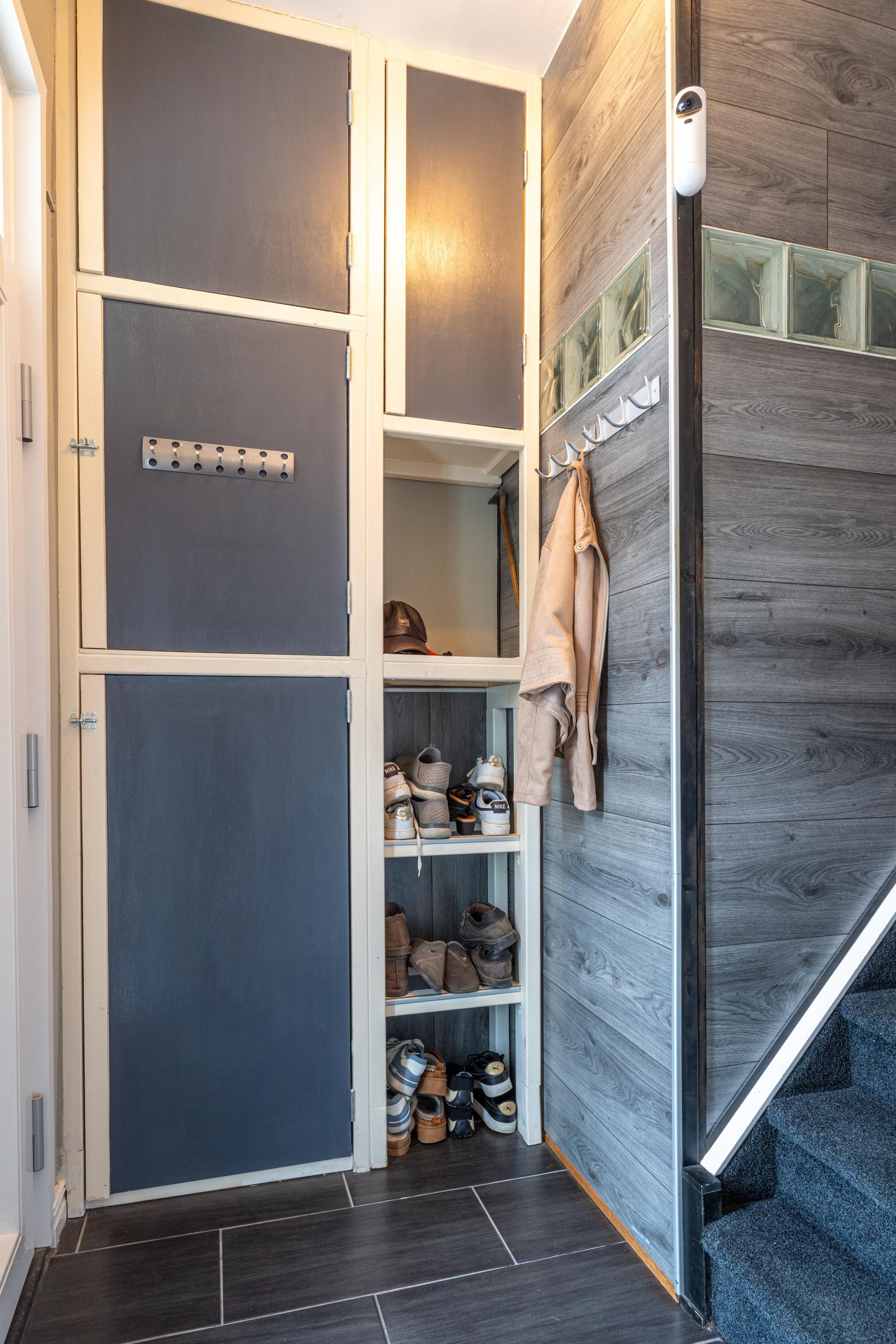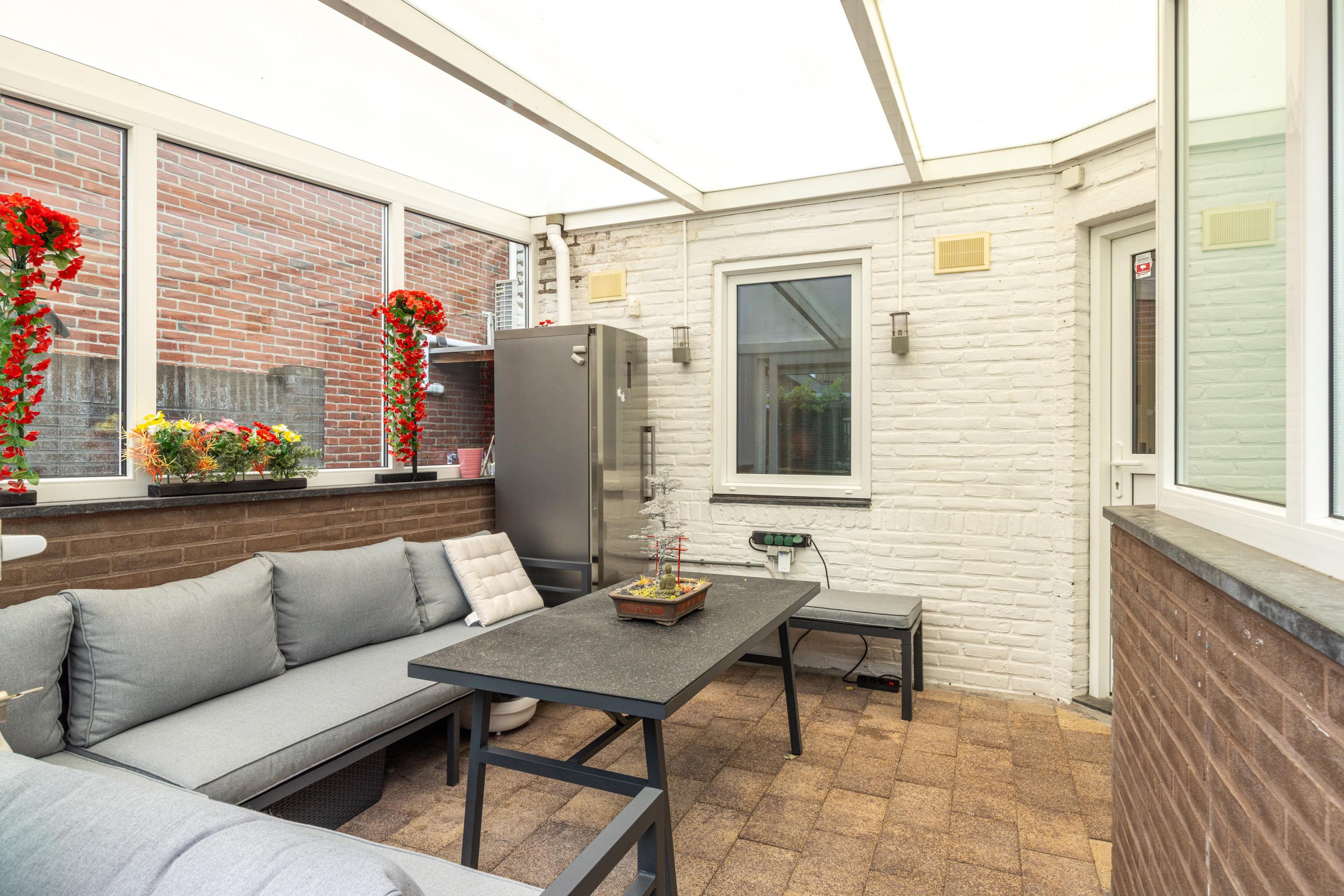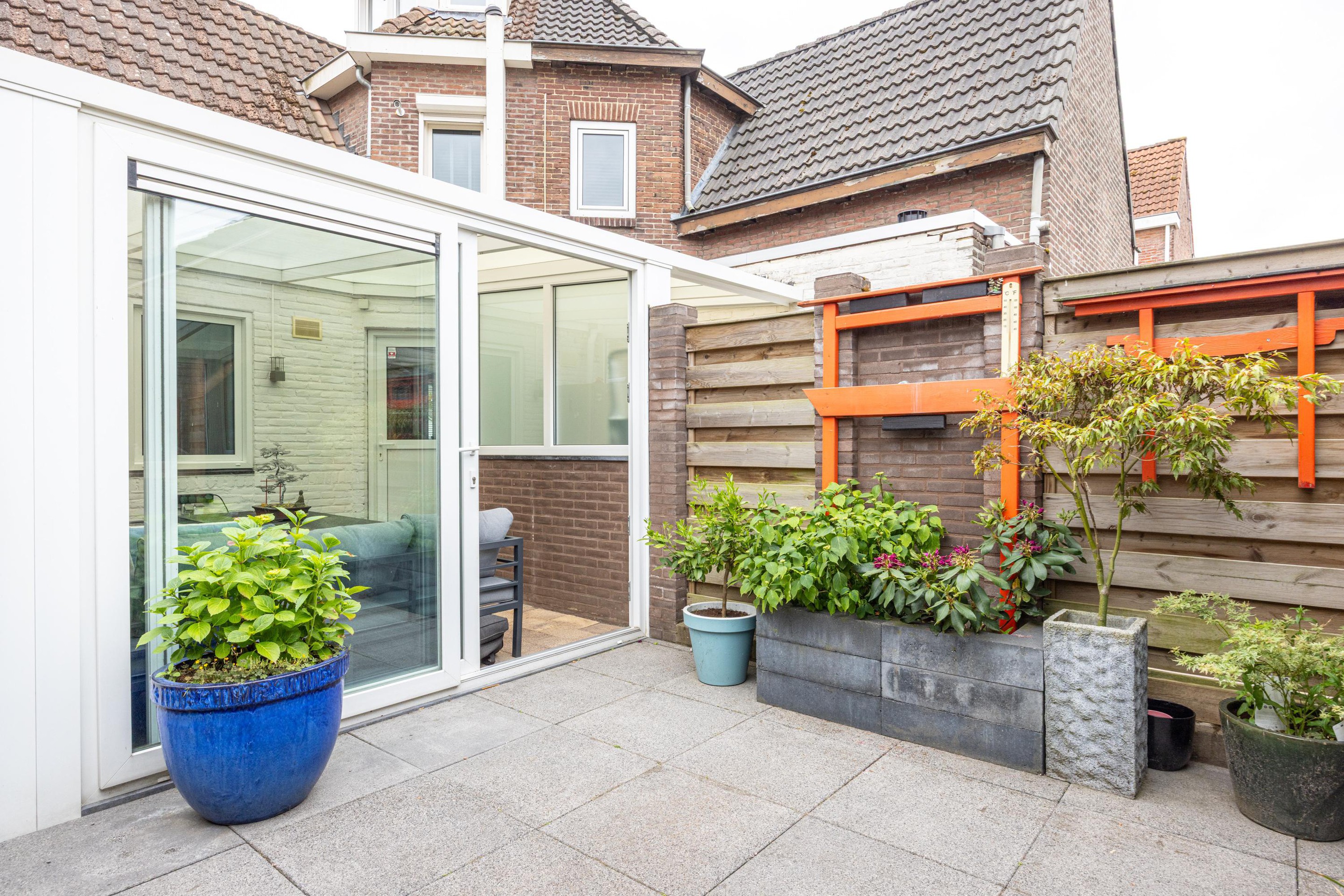De achtertuin is verzorgd aangelegd met borders en bestrating. Achterin bevindt zich een overkapping met een kleine schuur en een praktische vliering. Deze ruimte is ideaal voor het stallen van fietsen of opbergen van gereedschap. De tuin beschikt daarnaast over een eigen achterom.