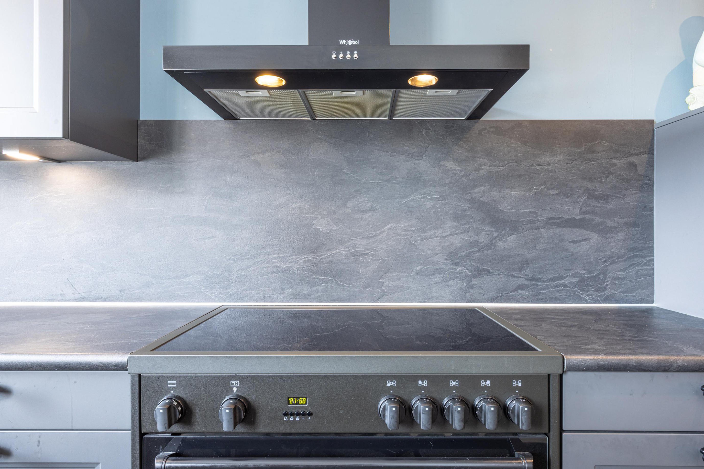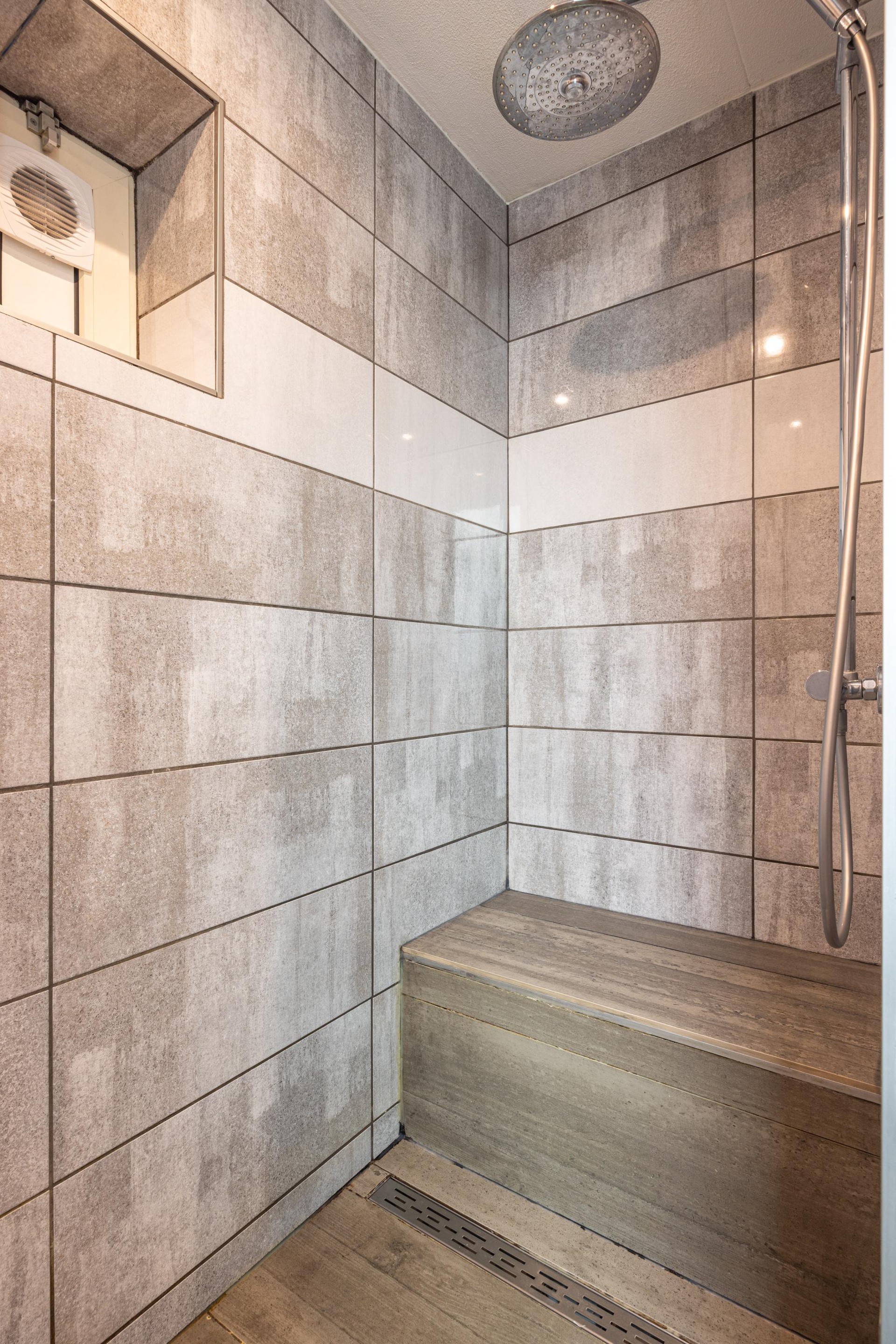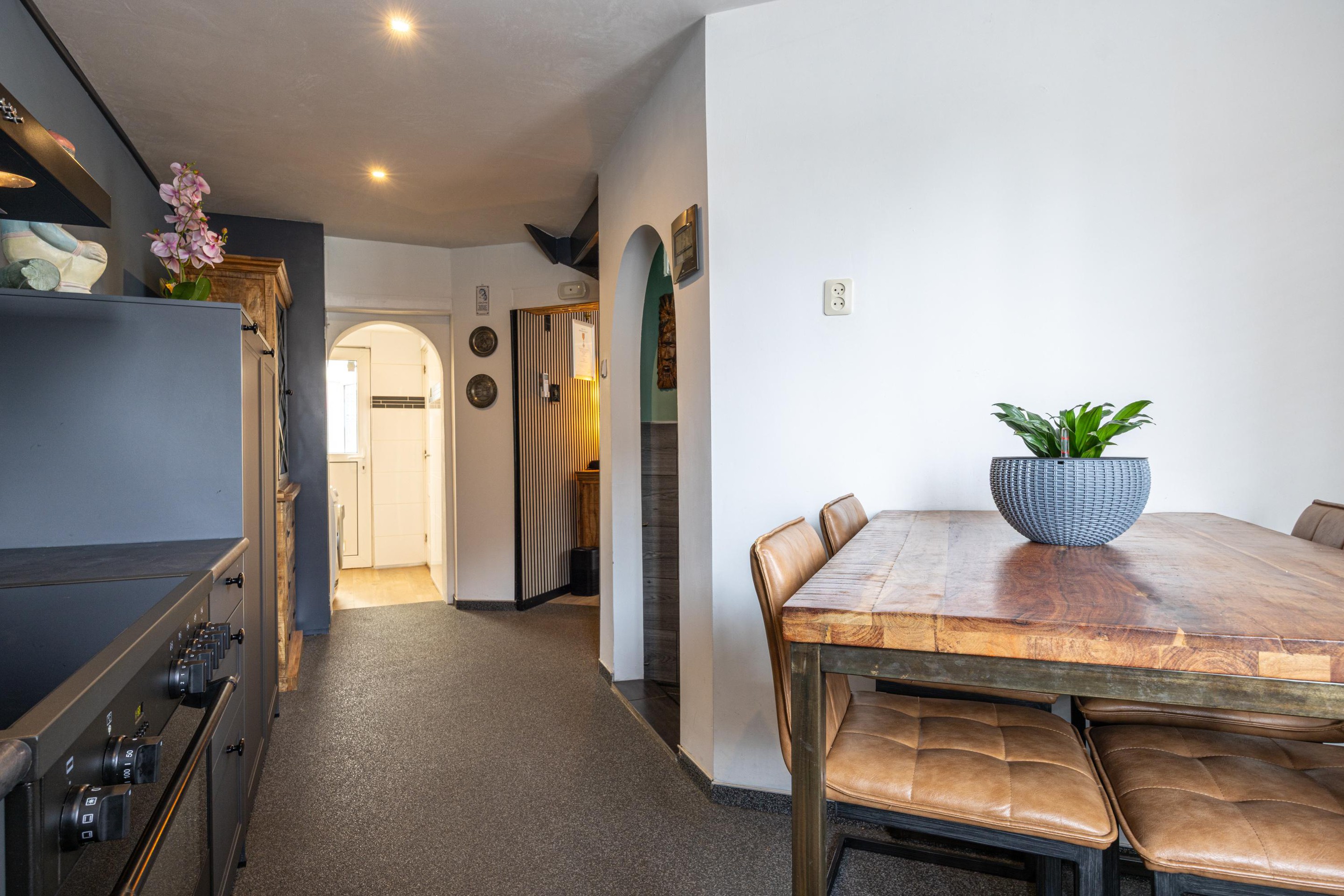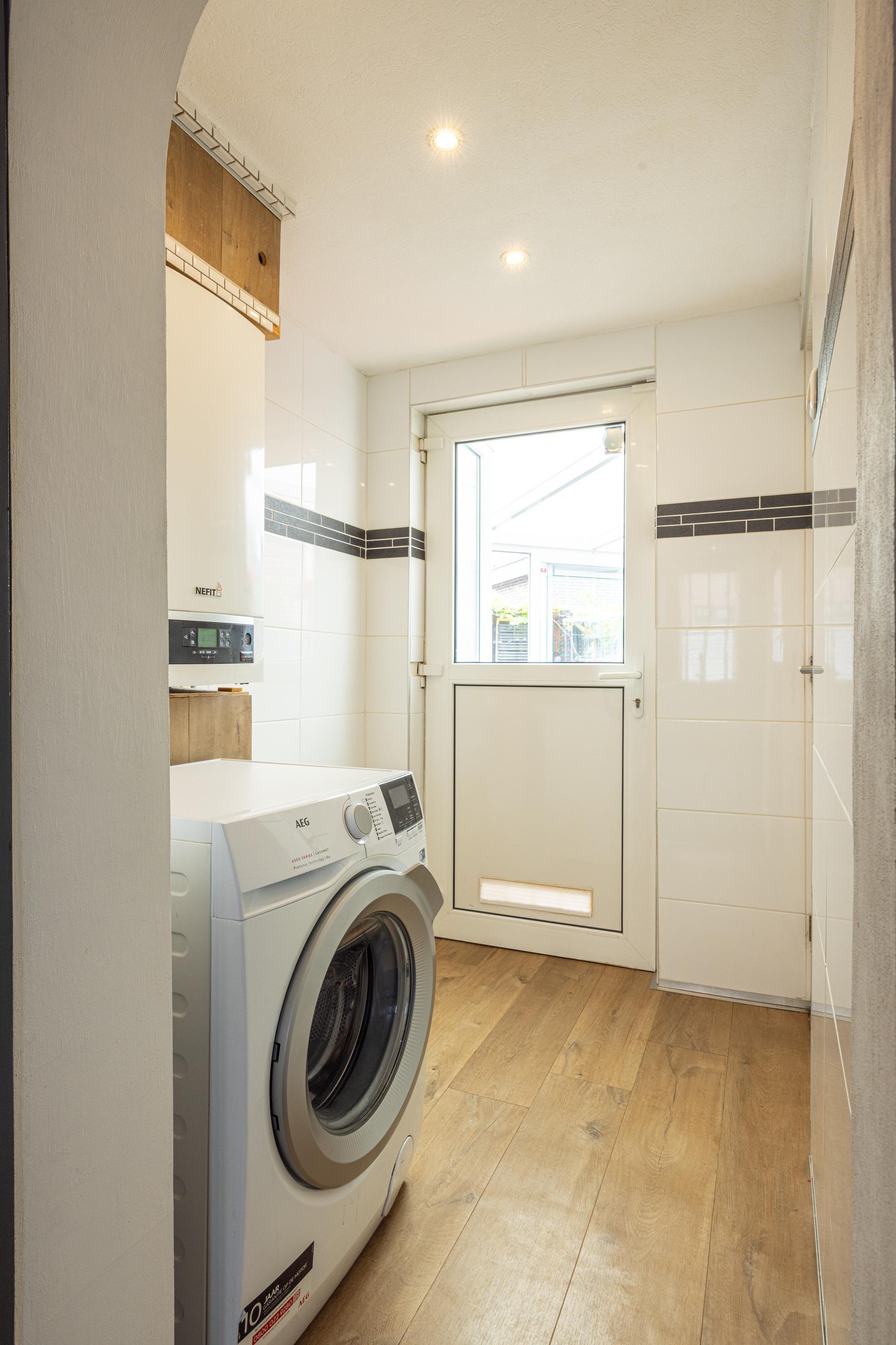 Dankzij de hoekopstelling is er veel werk- en kastruimte. De keuken is uitgerust met een 5-pits inductiekookplaat, afzuigkap, heteluchtoven met grillfunctie, koelkast, vriezer en vaatwasser. Extra praktisch is de inloopkast voor voorraadopslag. Vanuit de keuken heb je bovendien toegang tot de provisiekelder. Aansluitend aan de keuken ligt de bijkeuken met cv-installatie, witgoedaansluitingen en toegang tot zowel de badkamer als de tuinkamer. De badkamer is in 2024 volledig vernieuwd en modern uitgevoerd met een badkamermeubel met dubbele wasbak, spiegel met verlichting, inloopdouche, zwevend toilet en een designradiator.